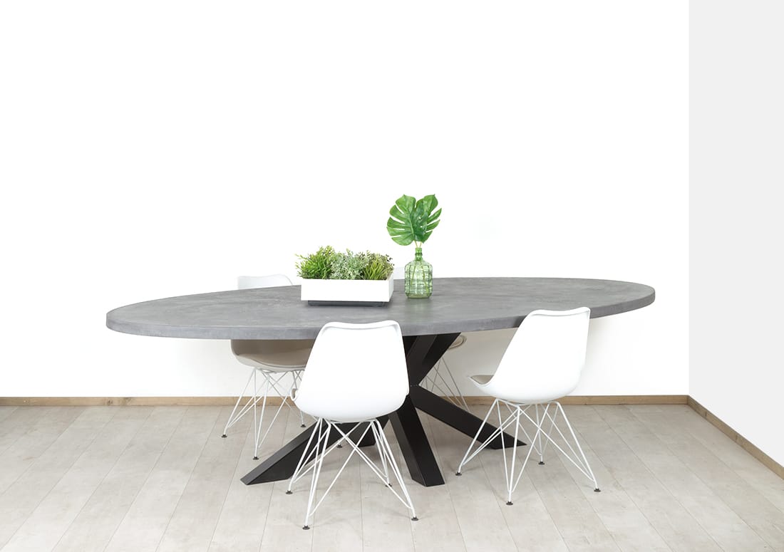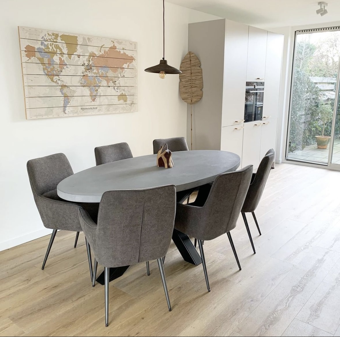 Deze ovale eettafel is ruimtelijk en biedt aan veel mensen zitplaats. Een prachtig statement in de ruimte. Tafel Swink is gemaakt met beton cire. Dit zorgt voor een echt beton gevoel en met het metalen frame voldoet deze tafel zeker aan de huidige interieur trends.