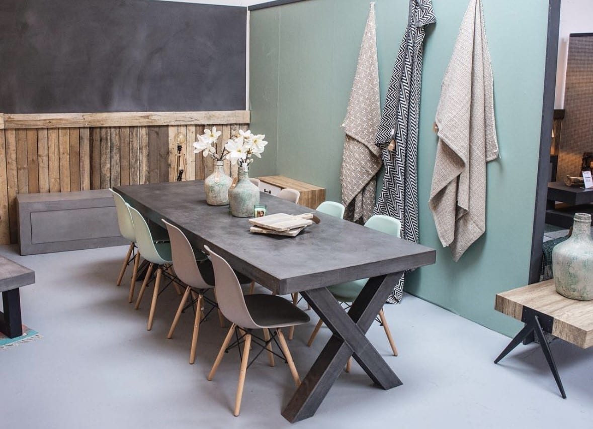 De betonlook geeft ook veel mogelijkheden om materialen te combineren. Denk aan industriële tafelpoten met een betonlook tafelblad. Of de combinatie met hout. Het is veelzijdig.