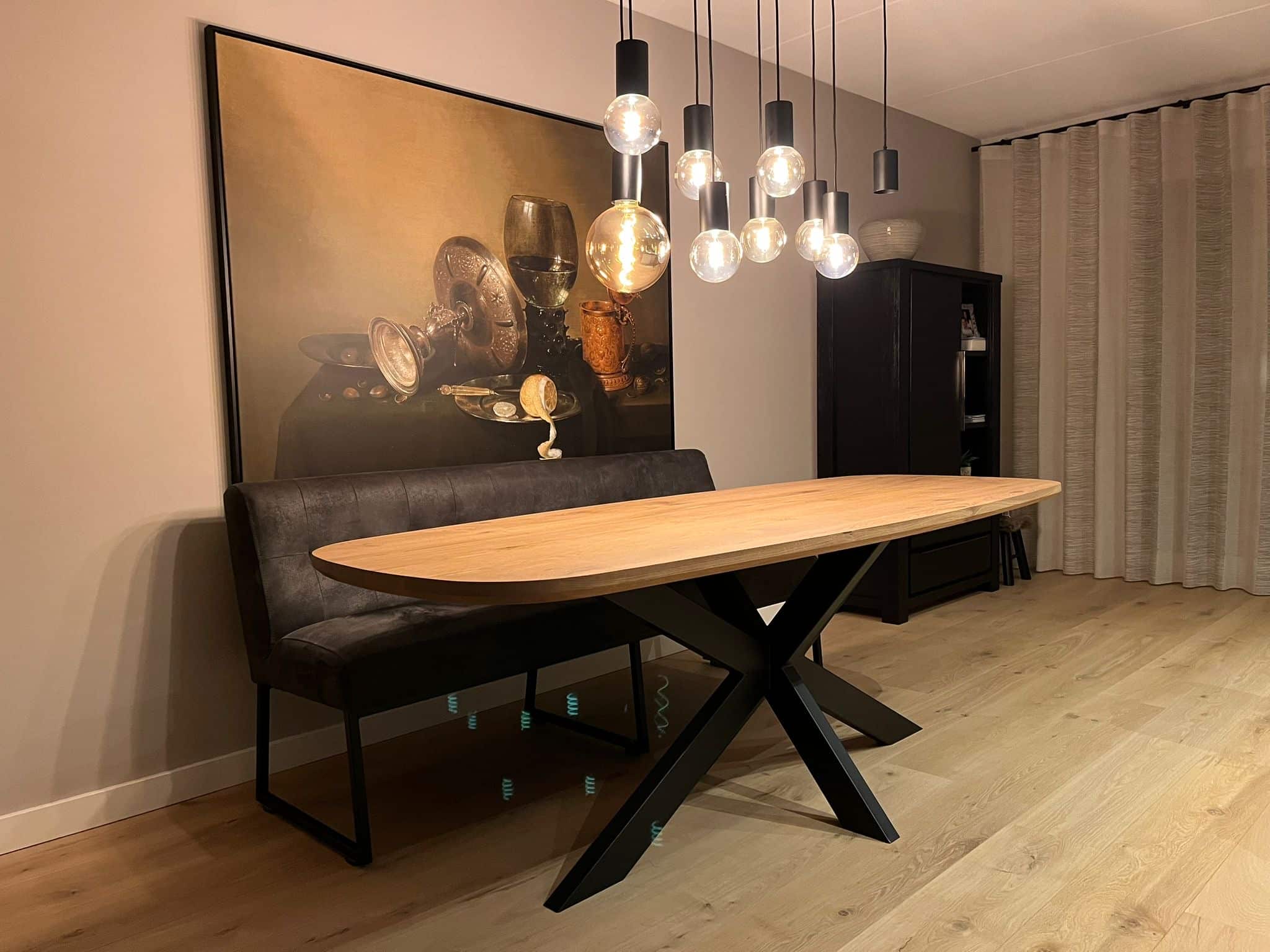 Daarnaast kies je voor de dikte van het tafelblad, wel of geen verjongde rand en of je de noesten wilt laten opvullen. Ook kies je voor een eventueel bijpassend bankje en anti kras vilt als vloerbescherming.