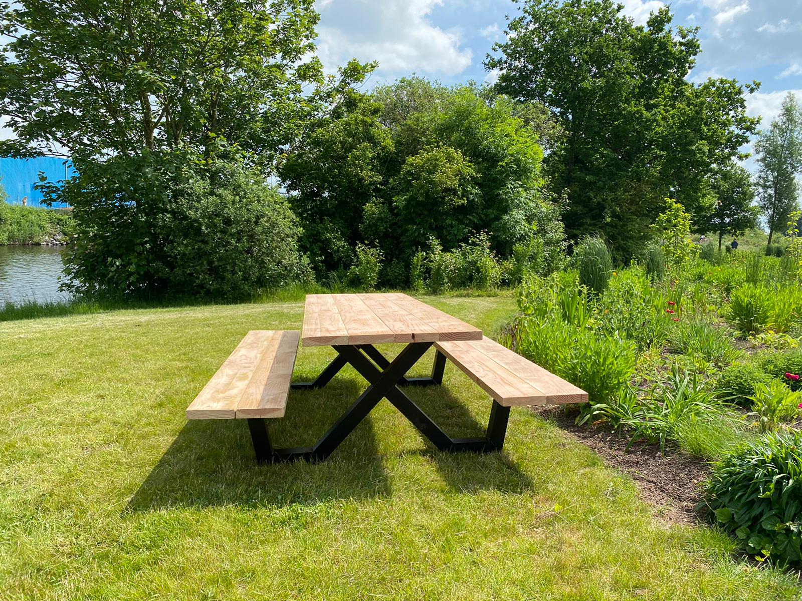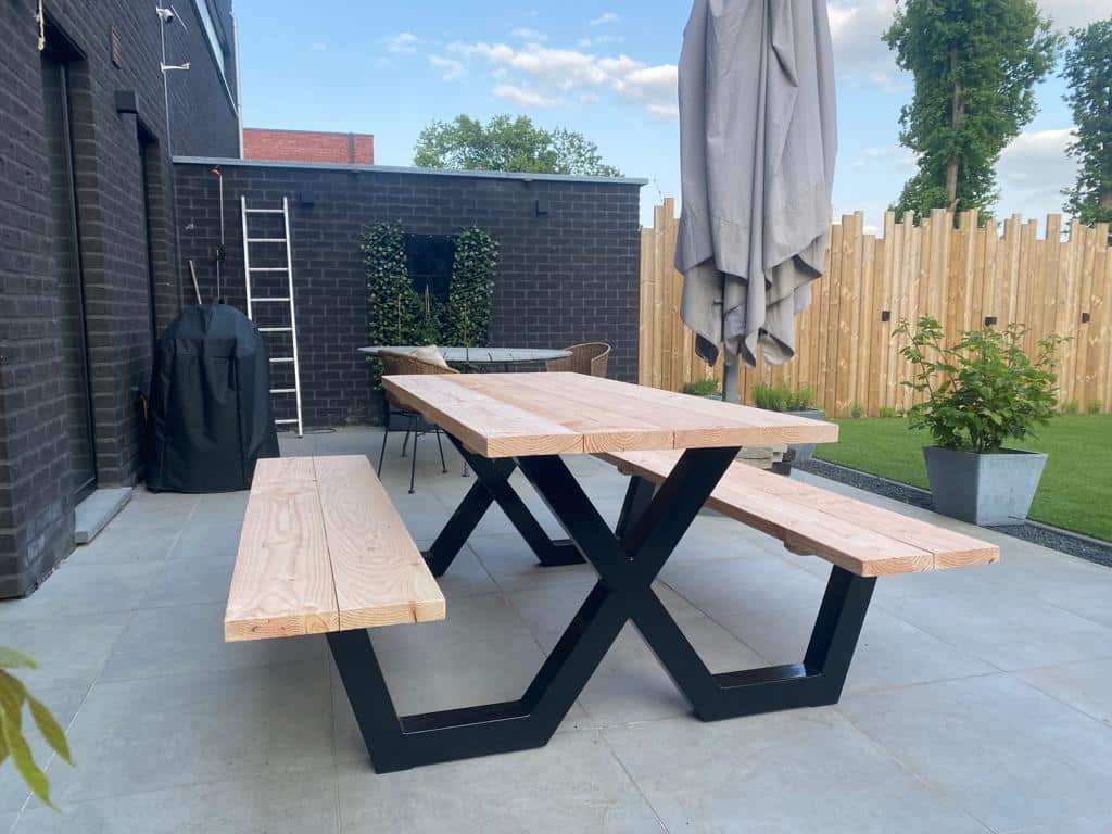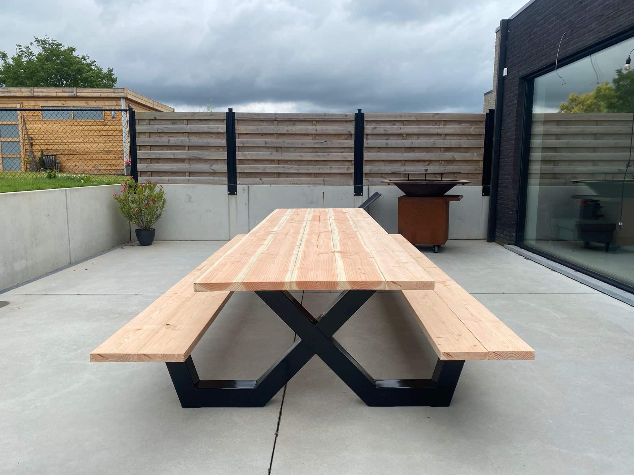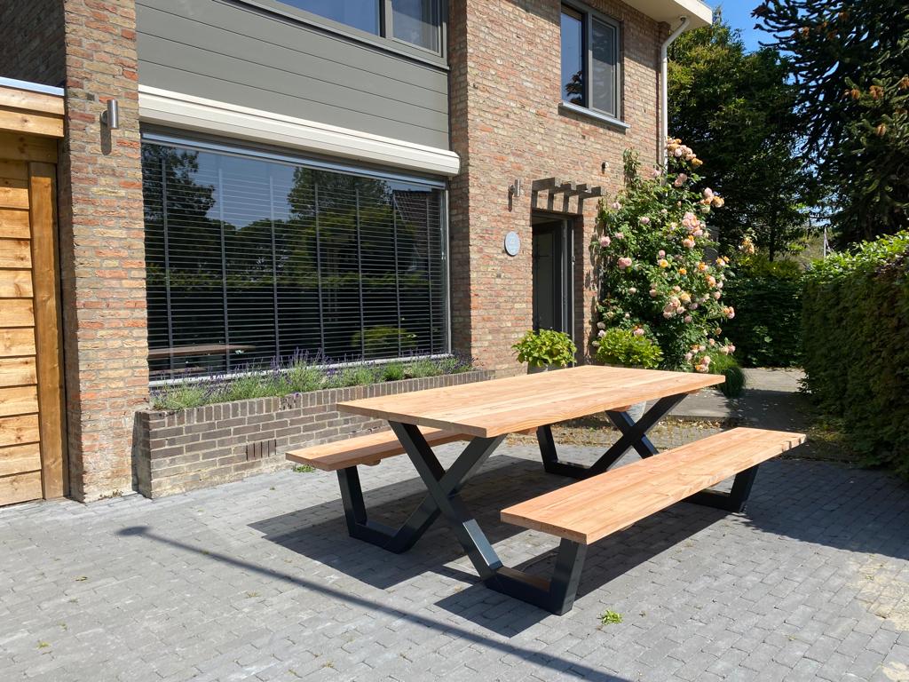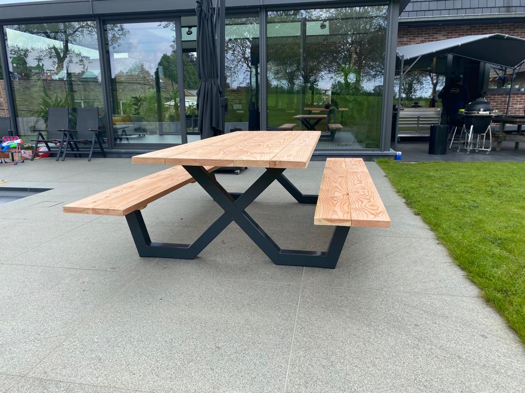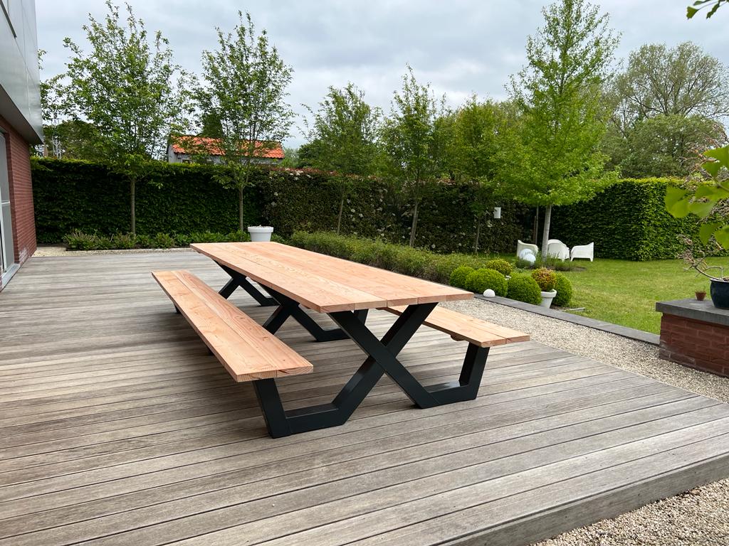 Een industriële picknicktafel met douglashout en staal. Uniek in zijn soort. De speelse X poten geven de picknicktafel net even een ander effect. Je bestelt deze unieke picknicktafel geheel op maat.