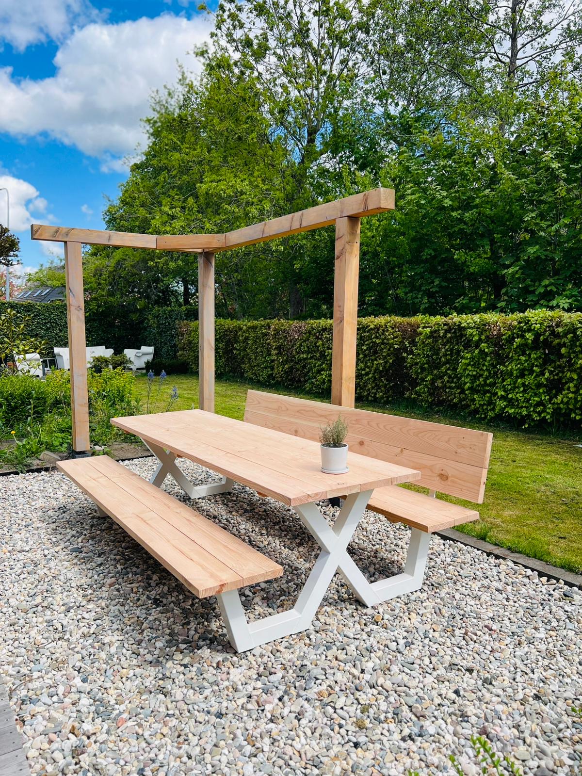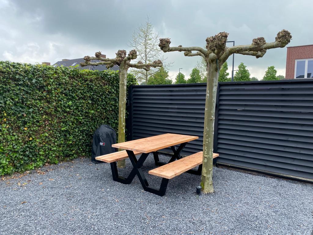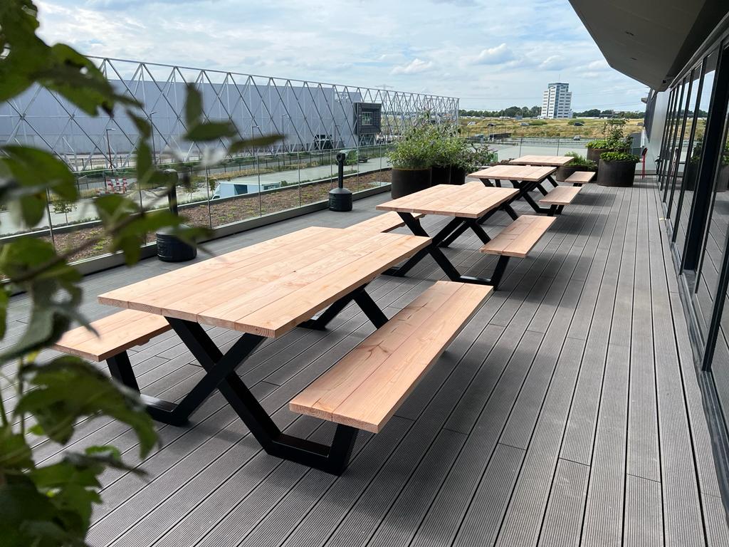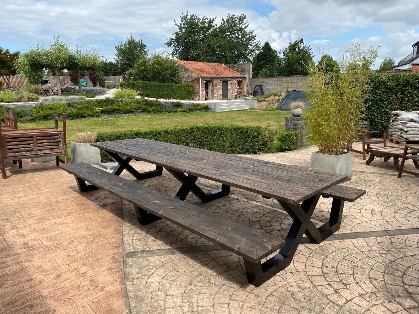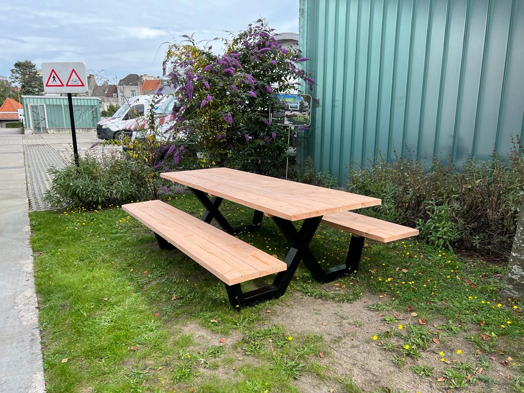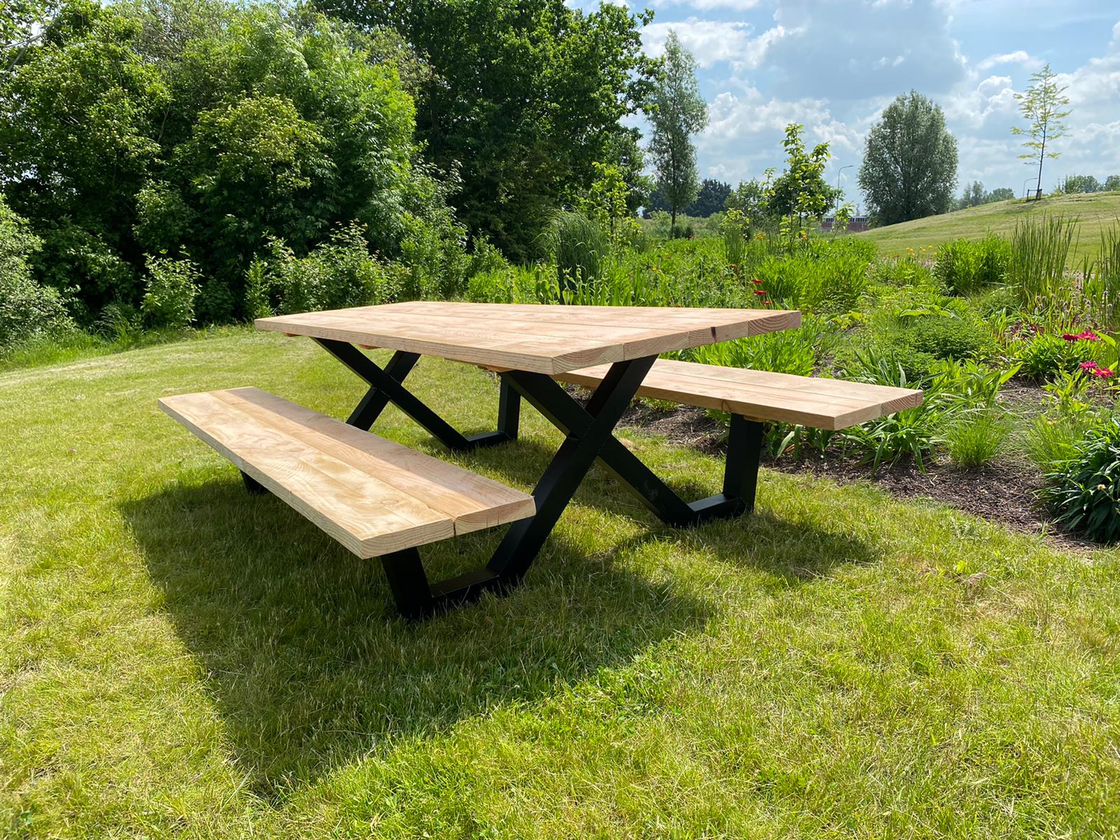 Een industriële picknicktafel met douglashout en staal. Uniek in zijn soort. De speelse X poten geven de picknicktafel net even een ander effect. Je bestelt deze unieke picknicktafel geheel op maat.