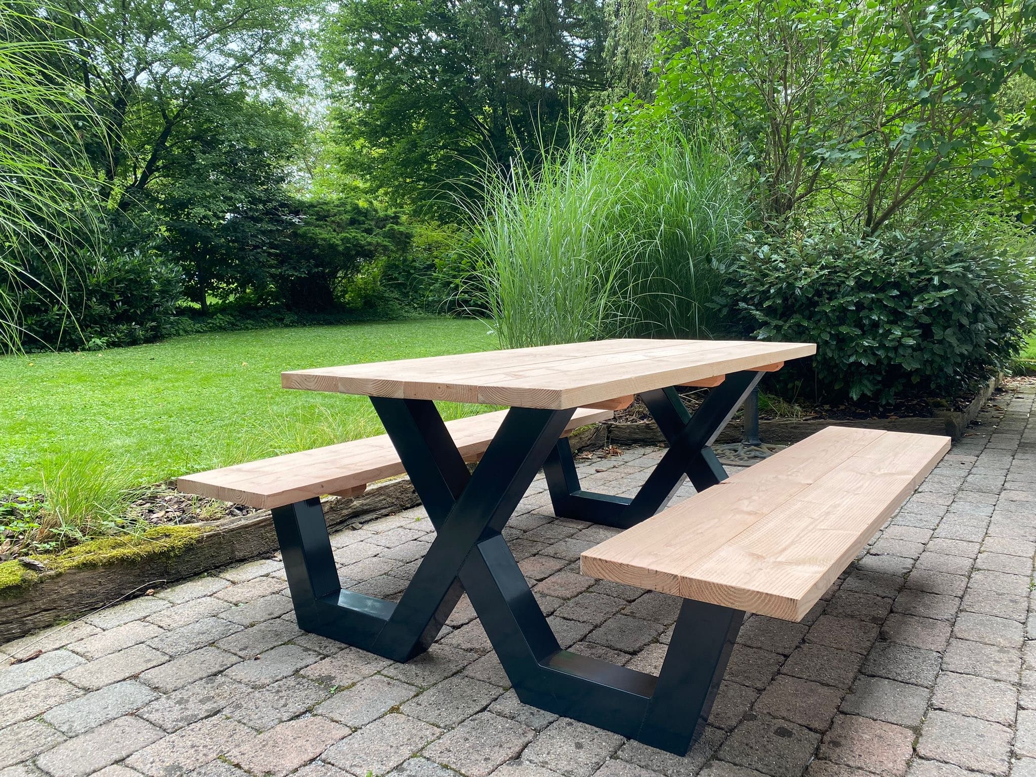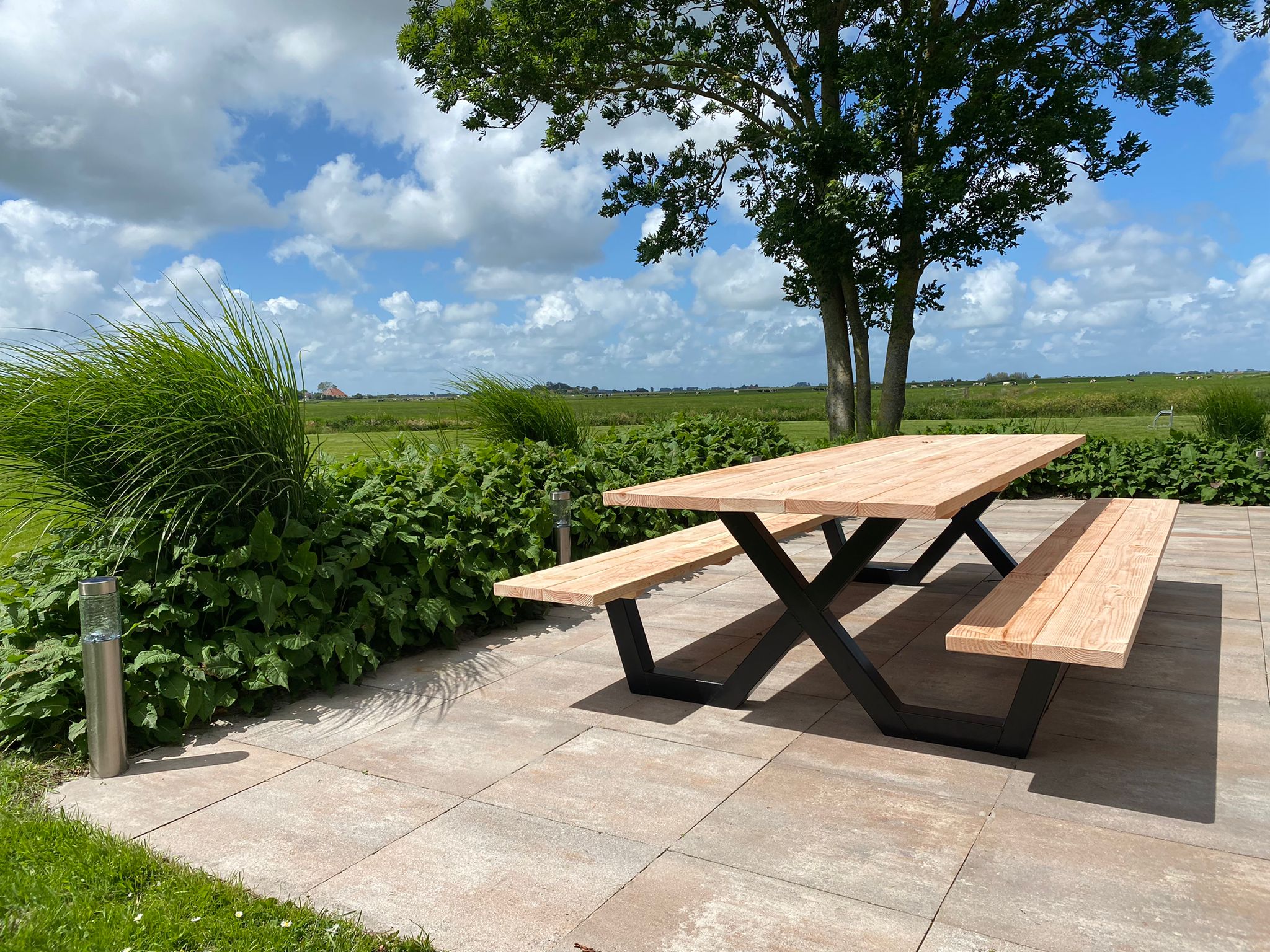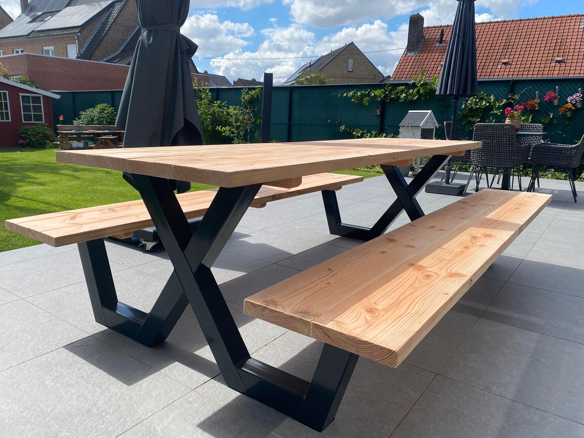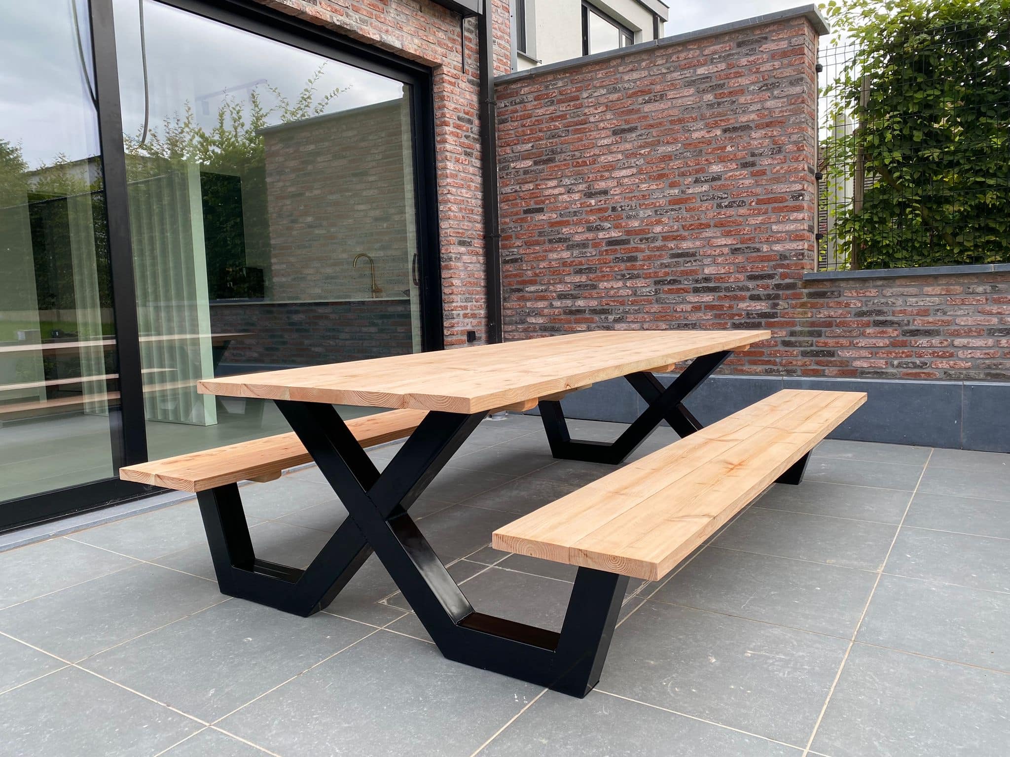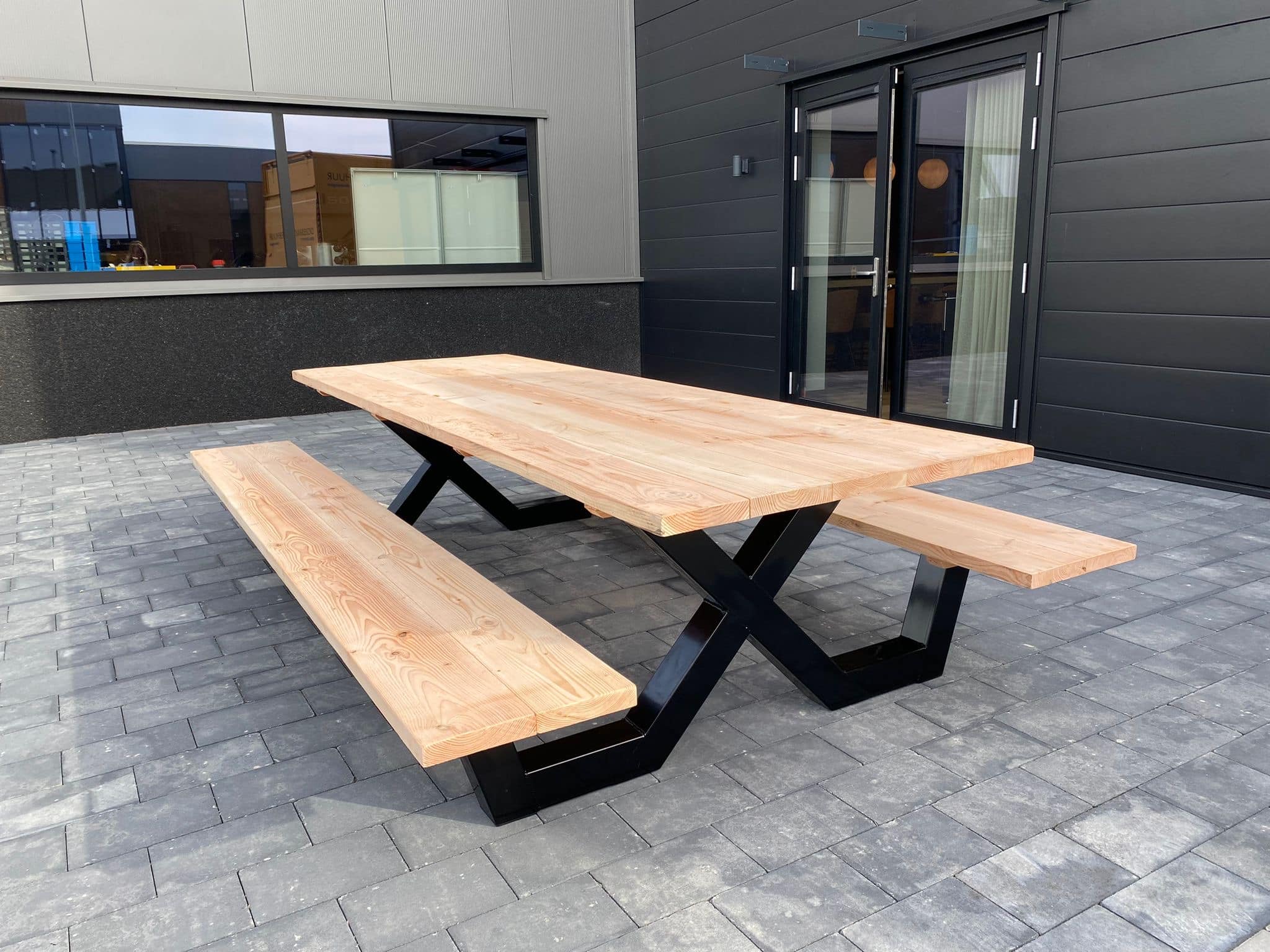 Een industriële picknicktafel met douglashout en staal. Uniek in zijn soort. De speelse X poten geven de picknicktafel net even een ander effect. Je bestelt deze unieke picknicktafel geheel op maat.
