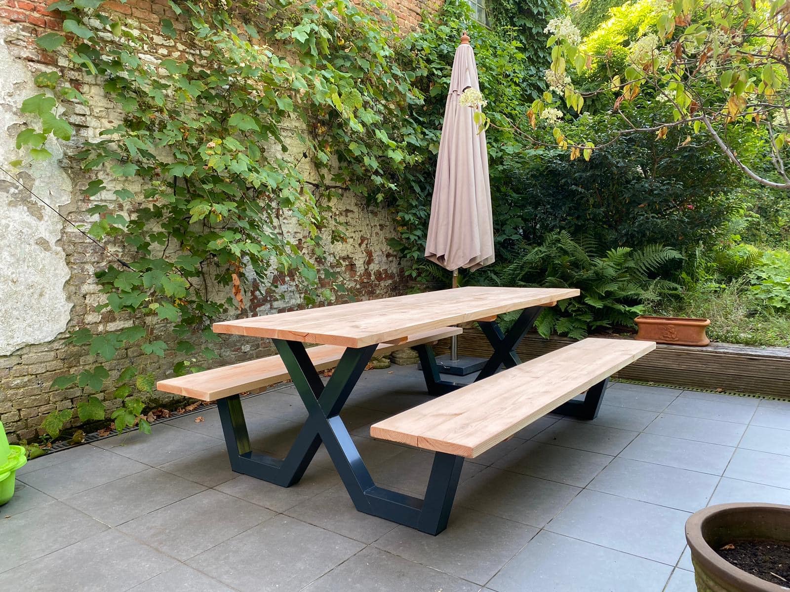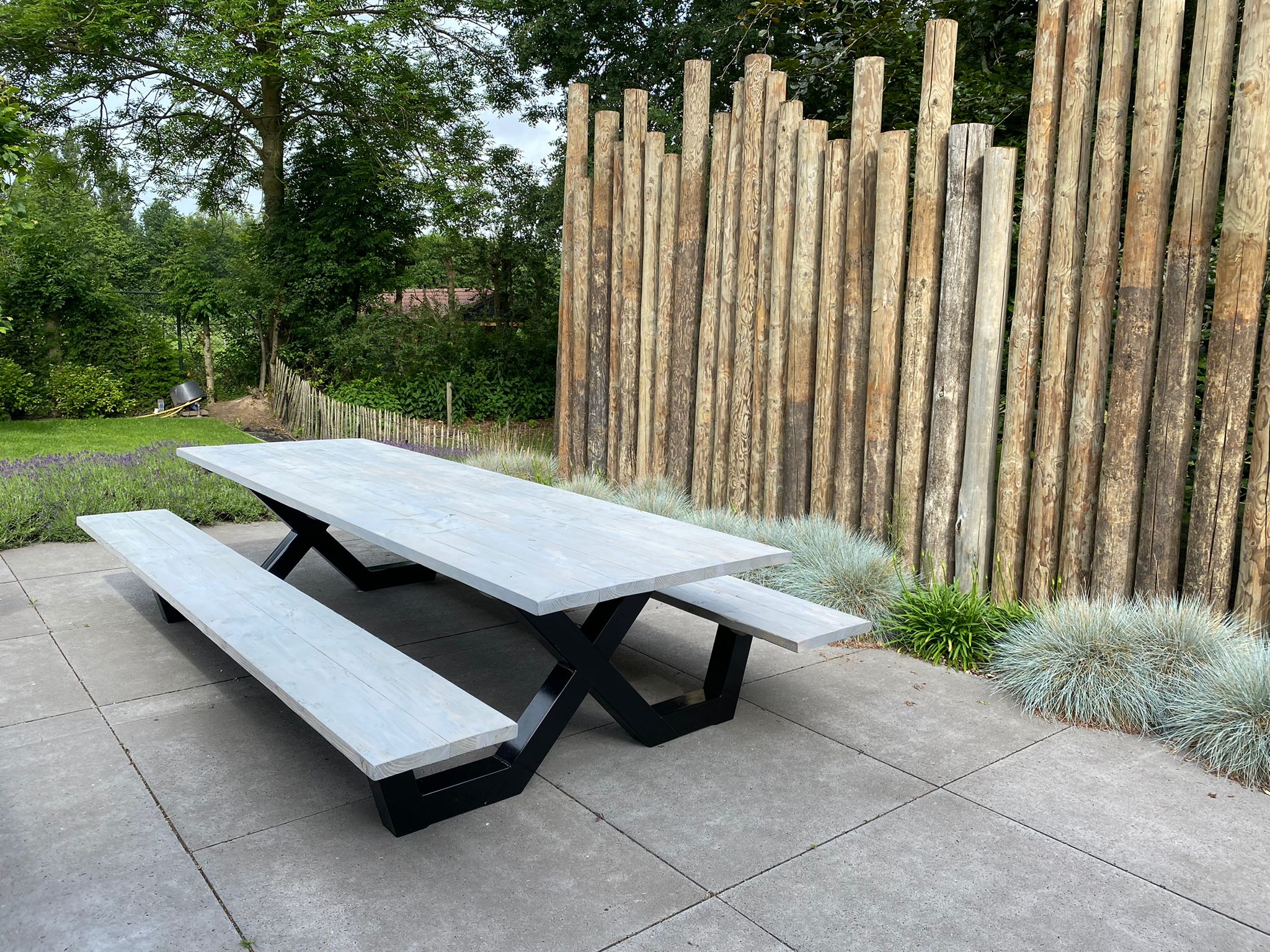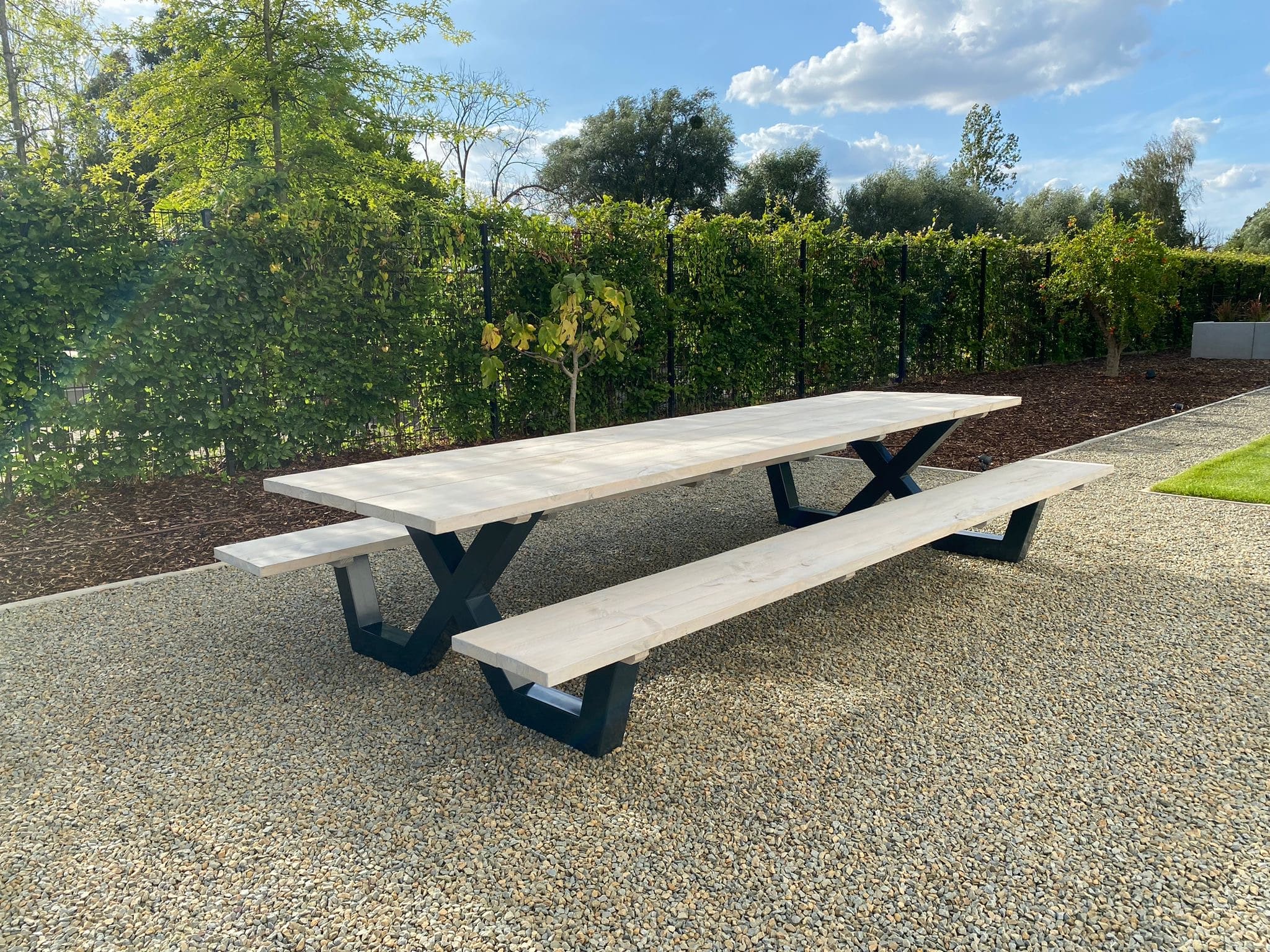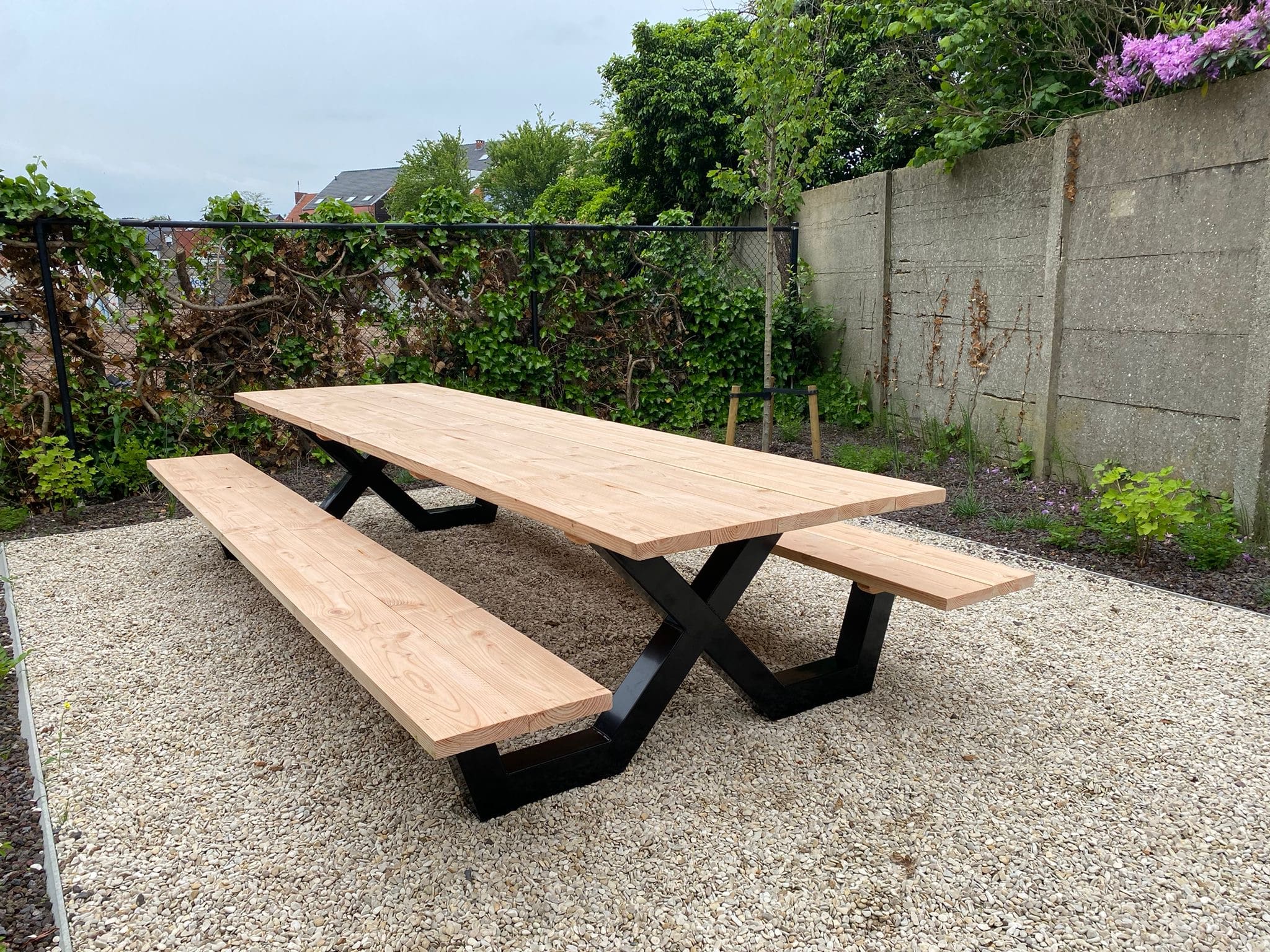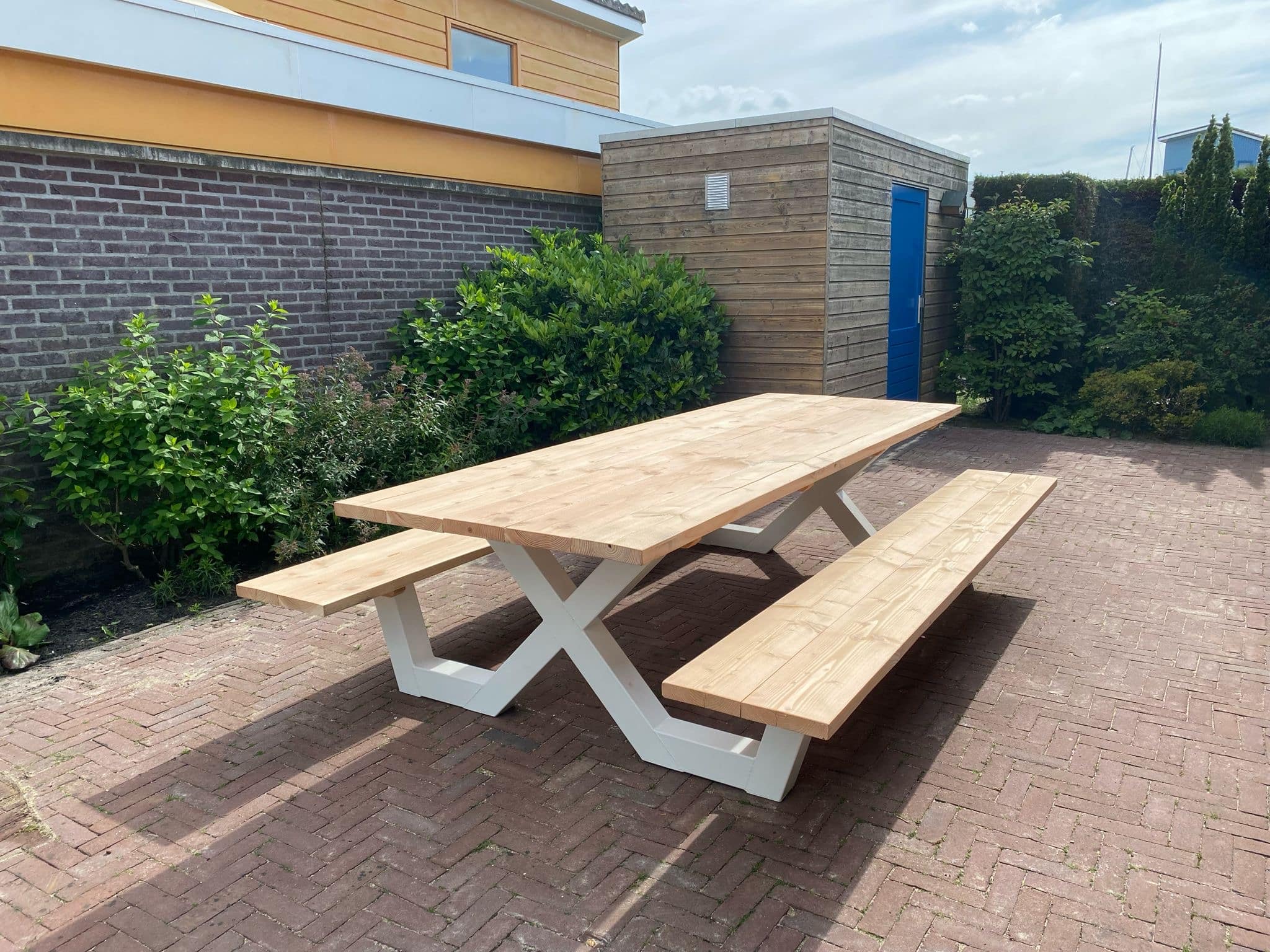 Een industriële picknicktafel met douglashout en staal. Uniek in zijn soort. De speelse X poten geven de picknicktafel net even een ander effect. Je bestelt deze unieke picknicktafel geheel op maat.