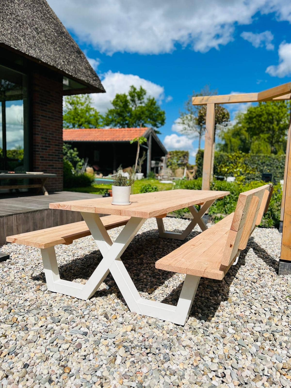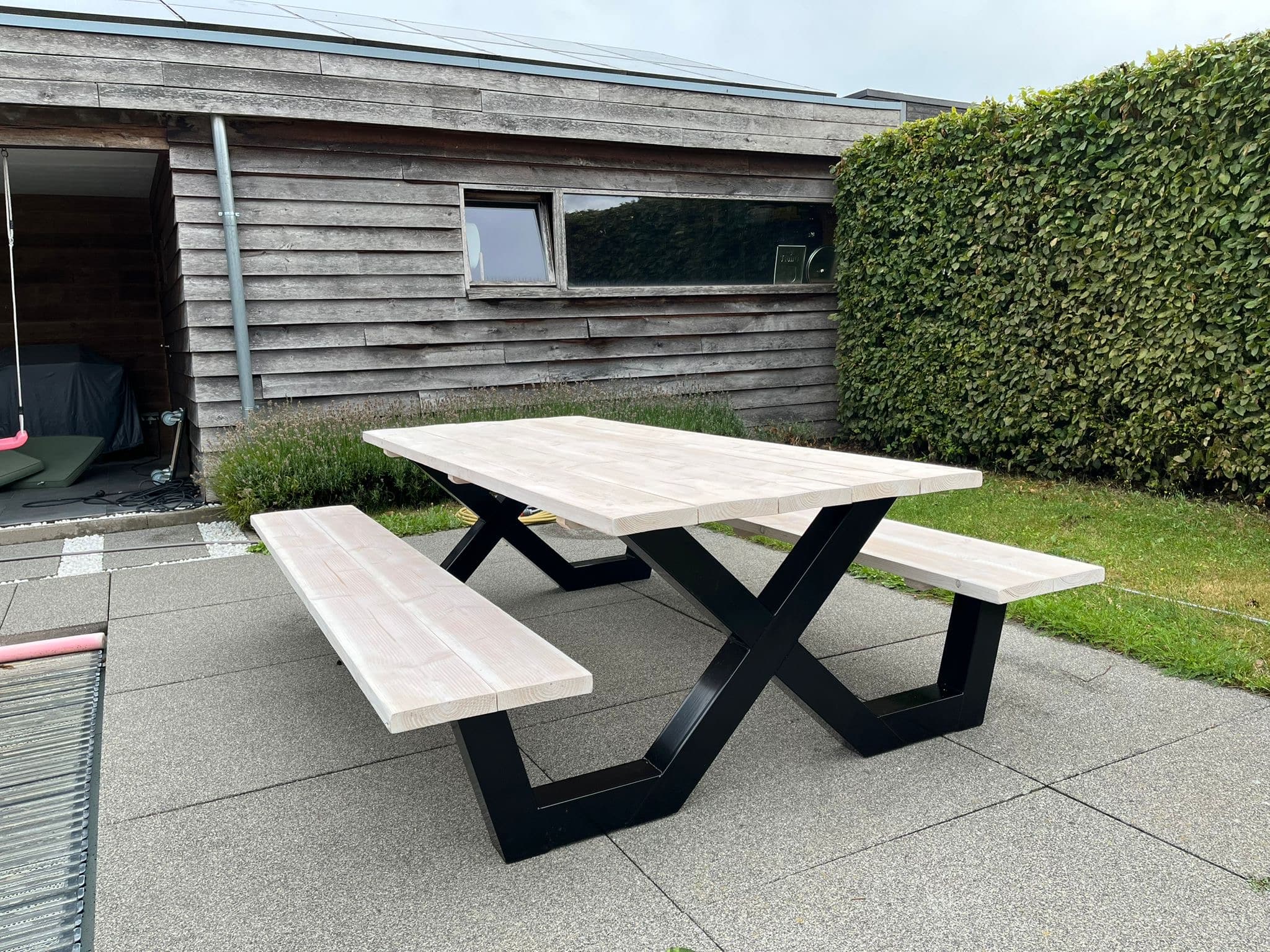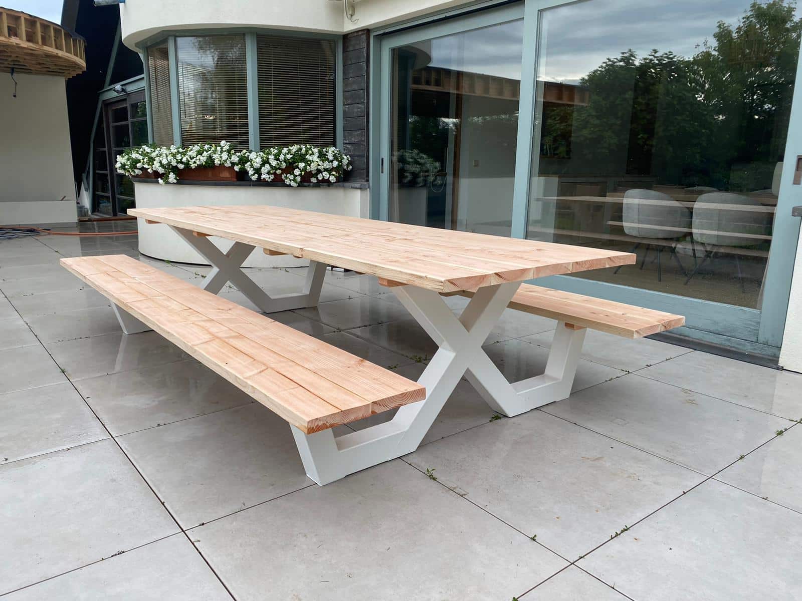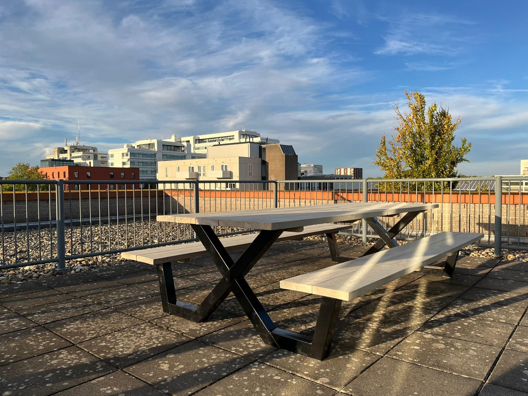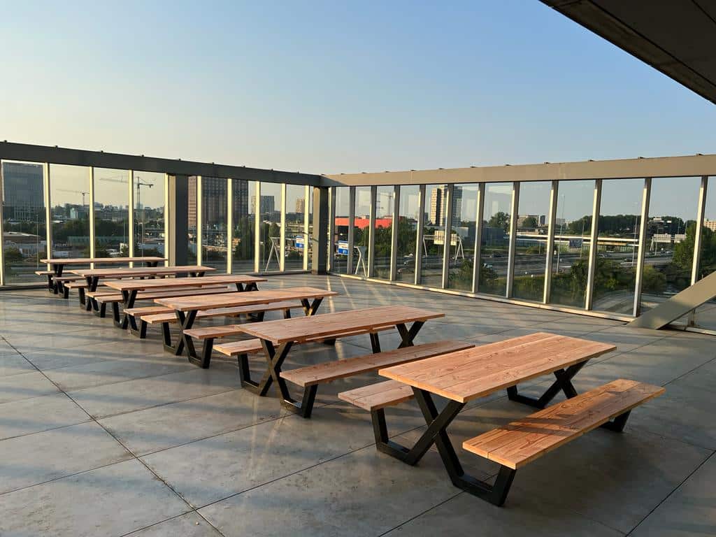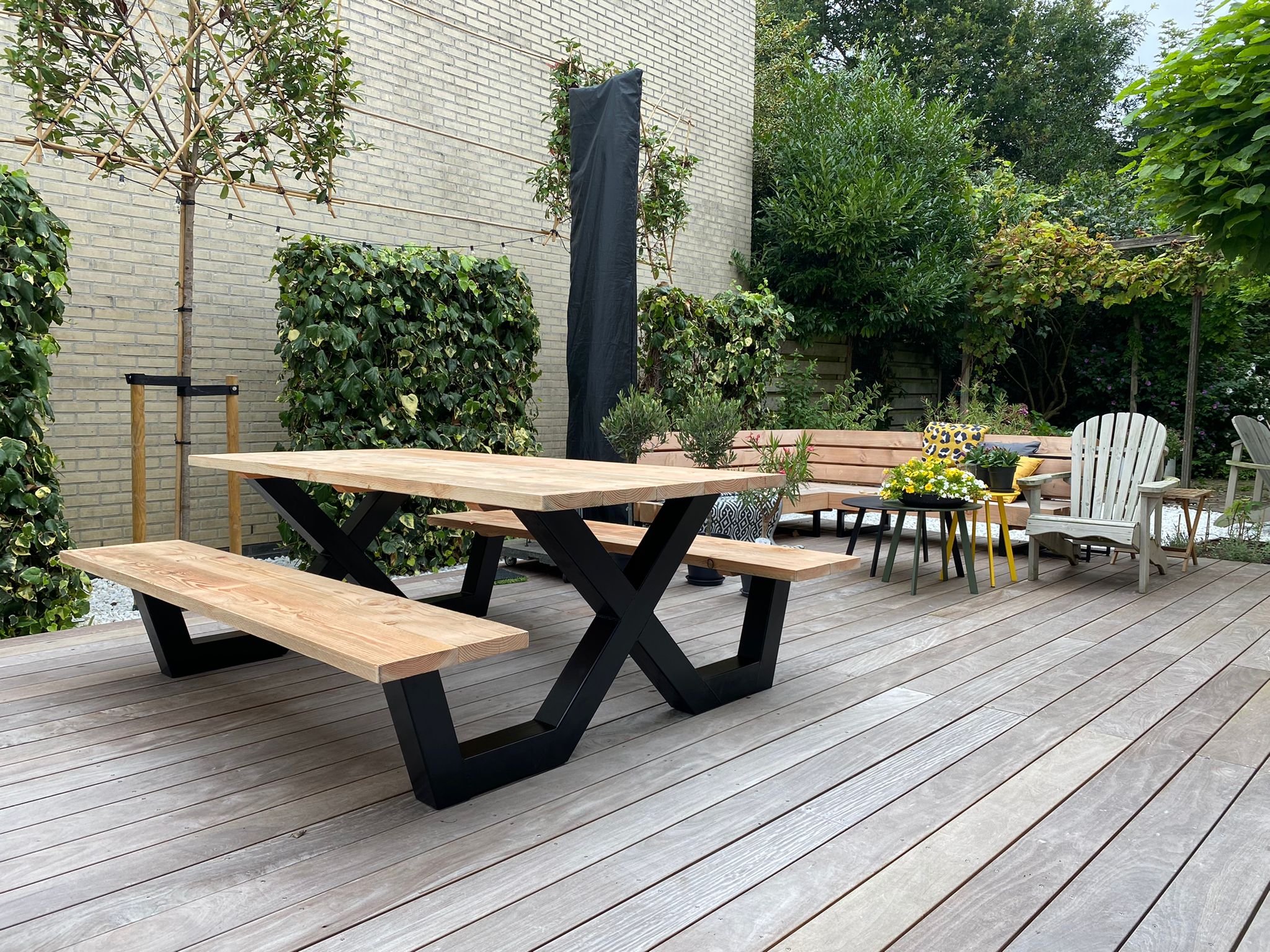 Een industriële picknicktafel met douglashout en staal. Uniek in zijn soort. De speelse X poten geven de picknicktafel net even een ander effect. Je bestelt deze unieke picknicktafel geheel op maat.