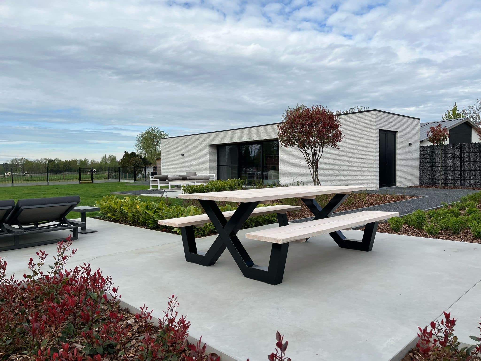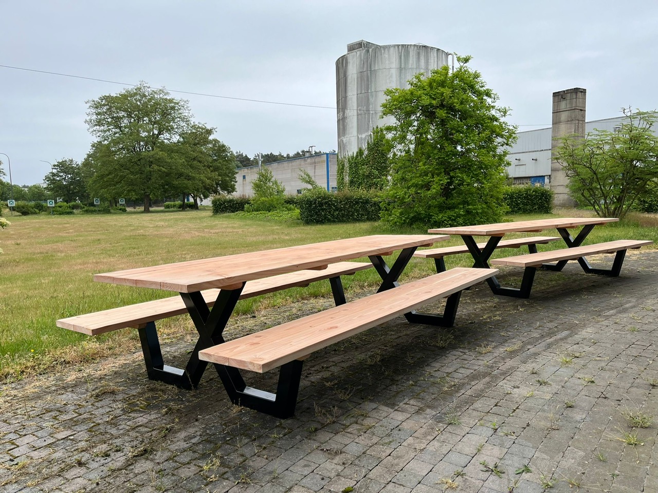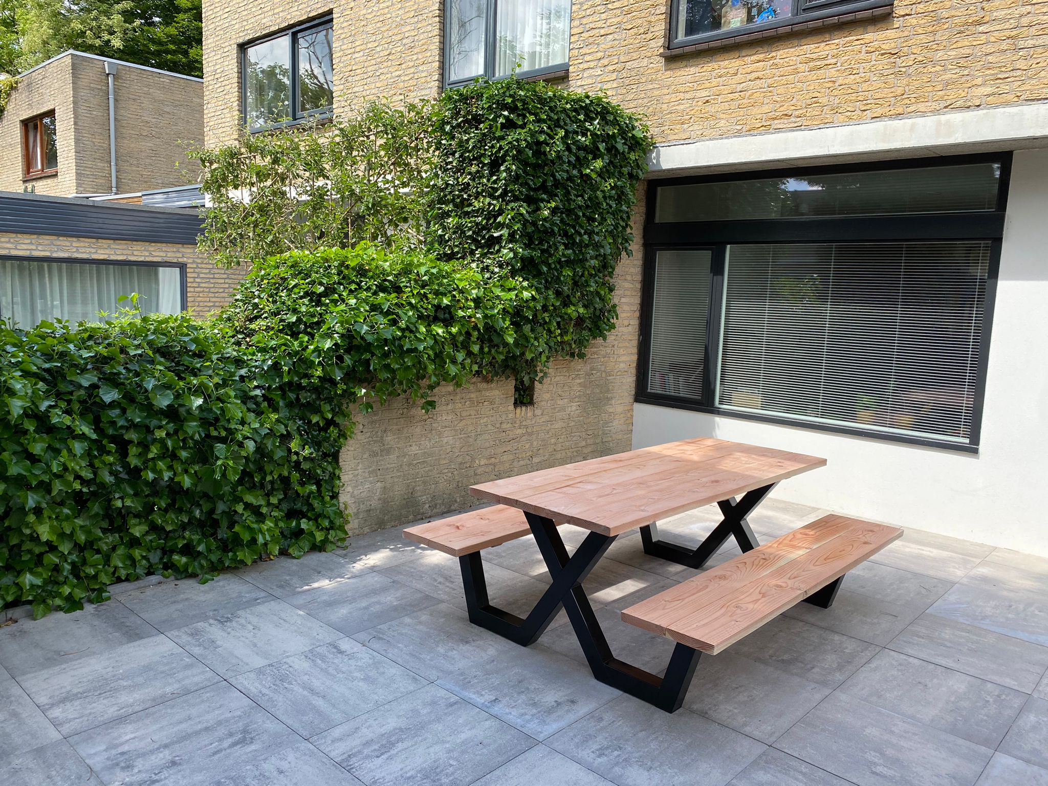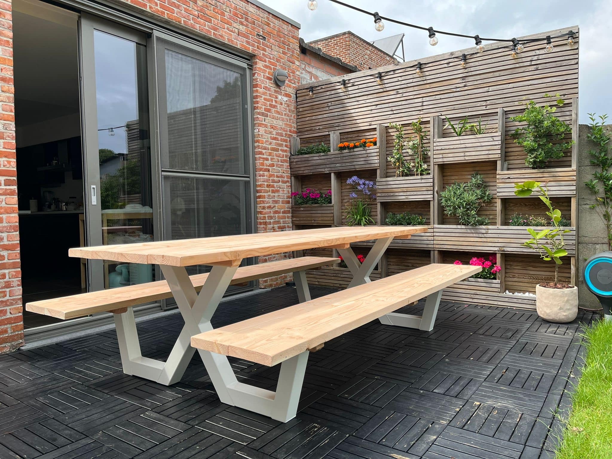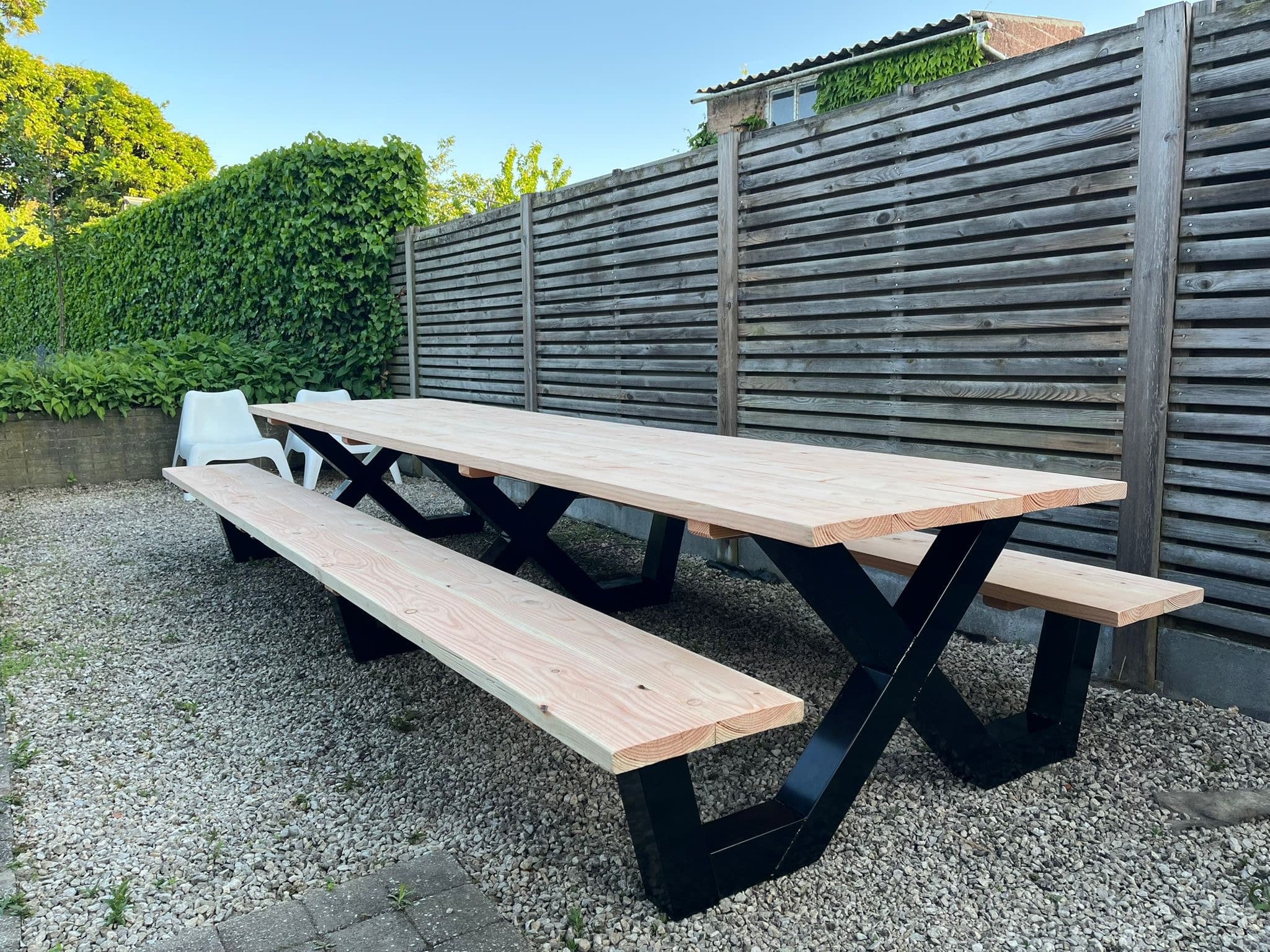 Een industriële picknicktafel met douglashout en staal. Uniek in zijn soort. De speelse X poten geven de picknicktafel net even een ander effect. Je bestelt deze unieke picknicktafel geheel op maat.