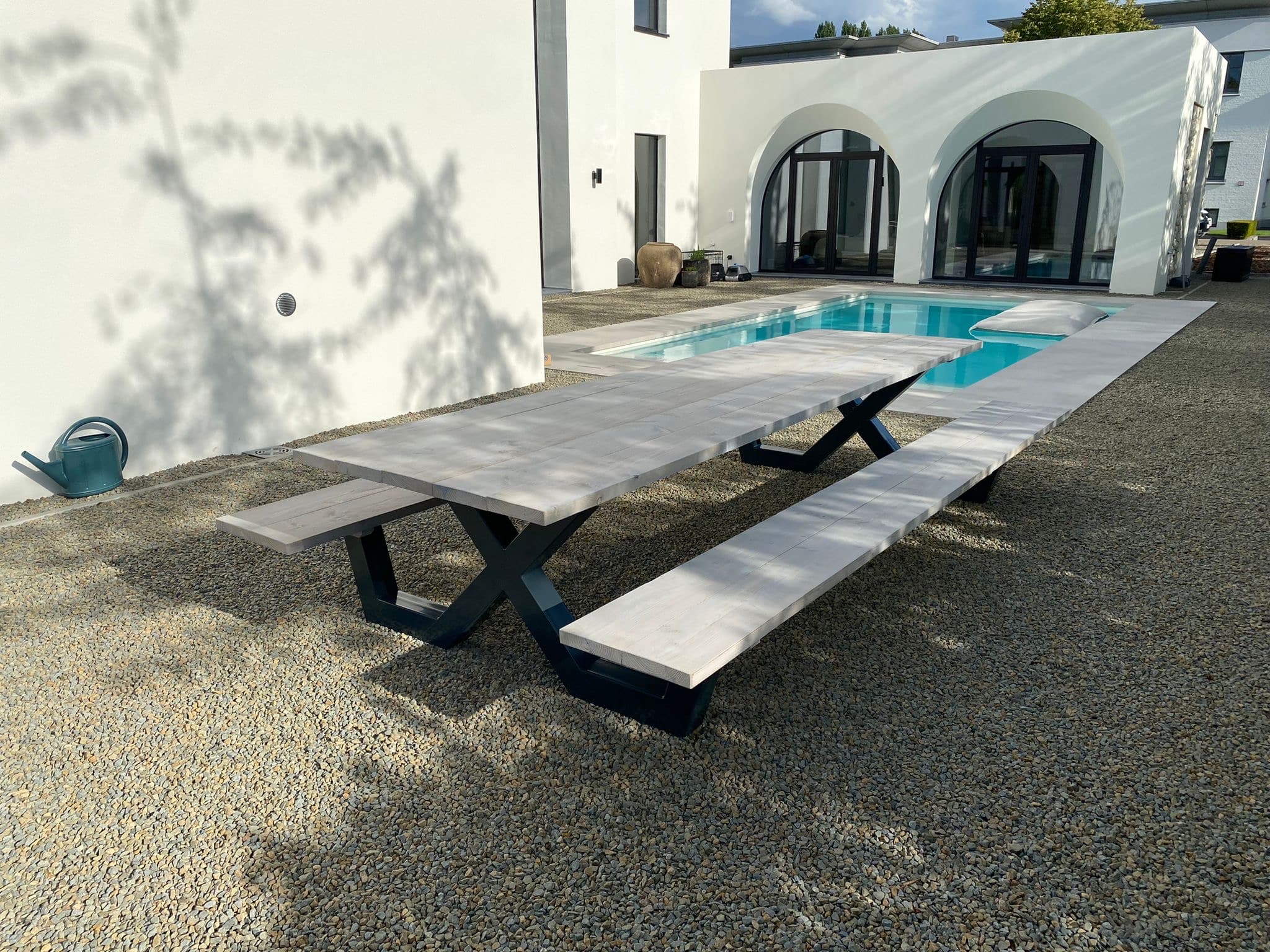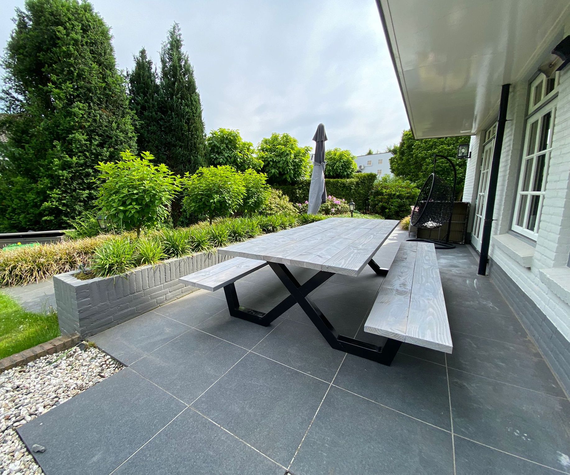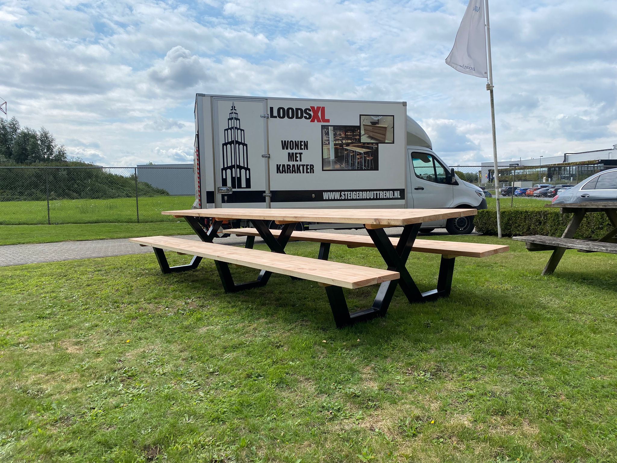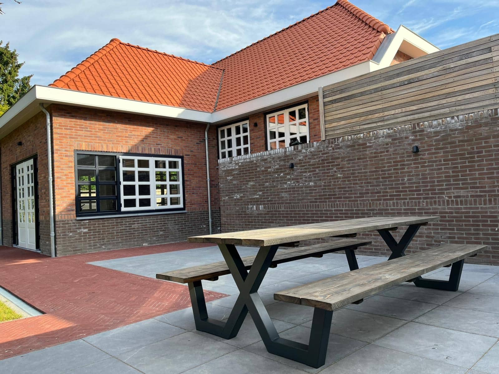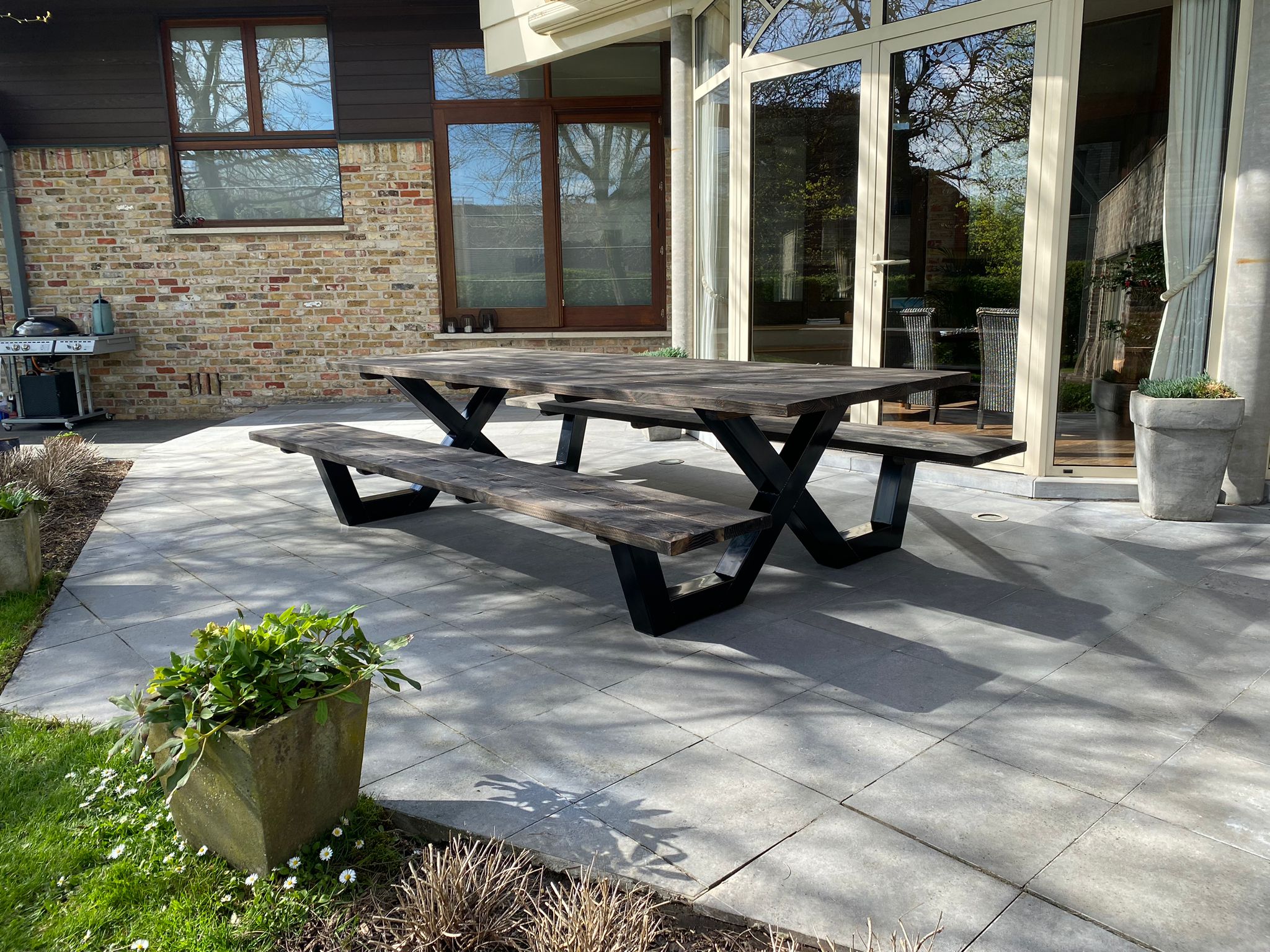 Een industriële picknicktafel met douglashout en staal. Uniek in zijn soort. De speelse X poten geven de picknicktafel net even een ander effect. Je bestelt deze unieke picknicktafel geheel op maat.