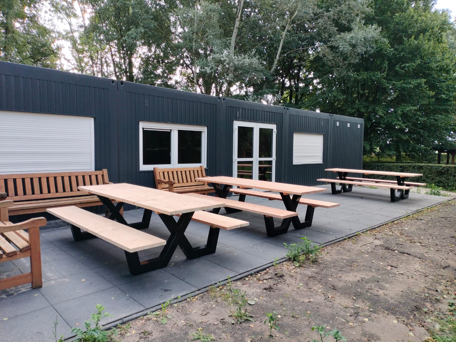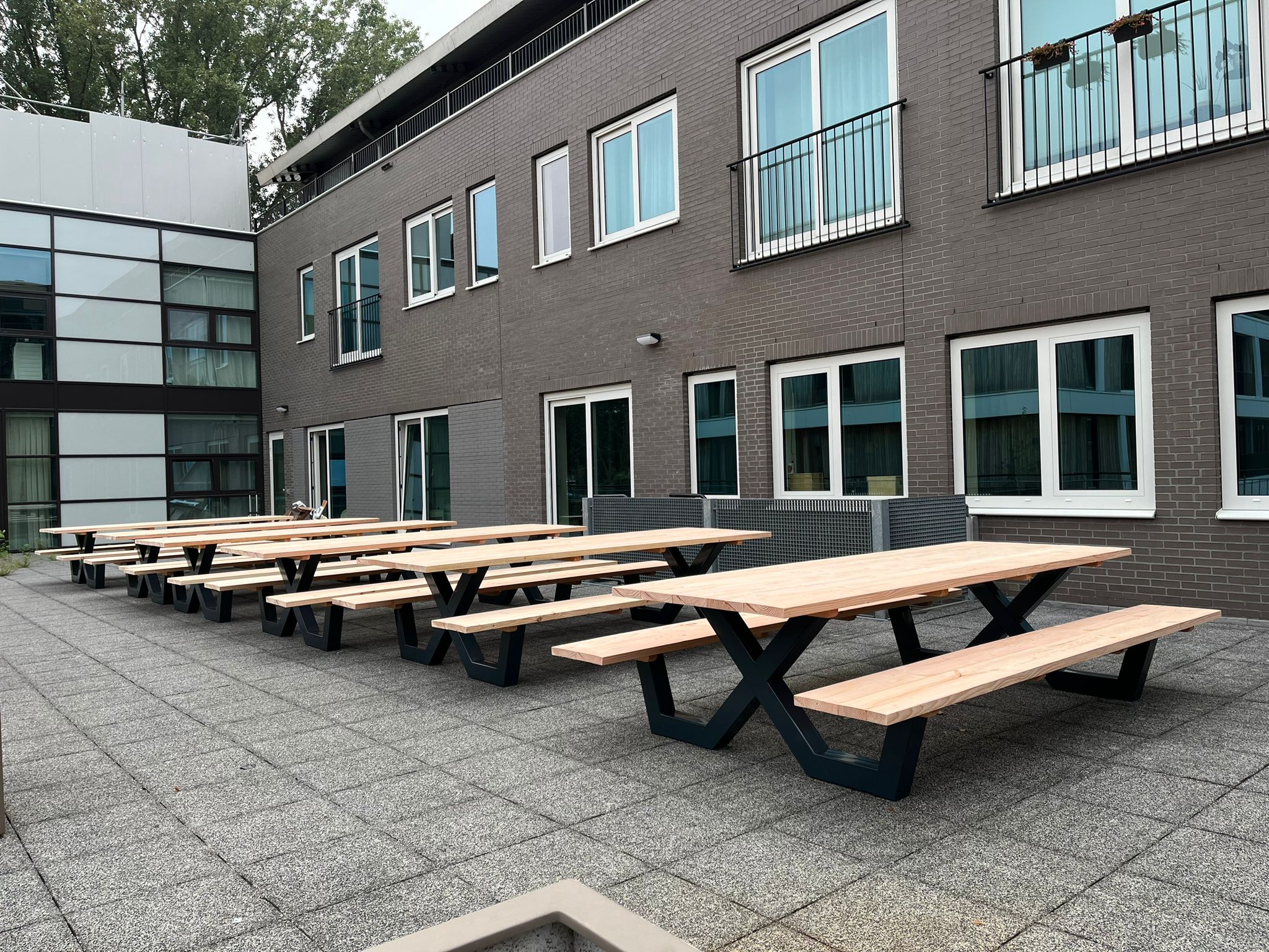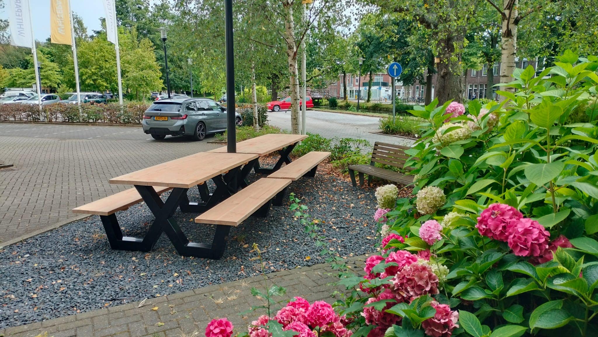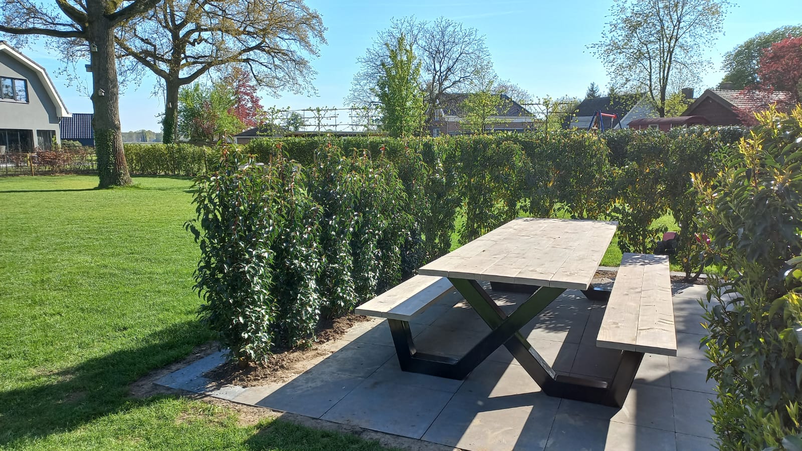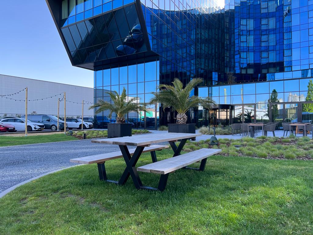 Een industriële picknicktafel met douglashout en staal. Uniek in zijn soort. De speelse X poten geven de picknicktafel net even een ander effect. Je bestelt deze unieke picknicktafel geheel op maat.