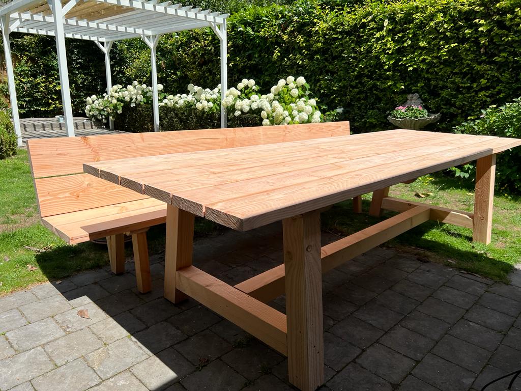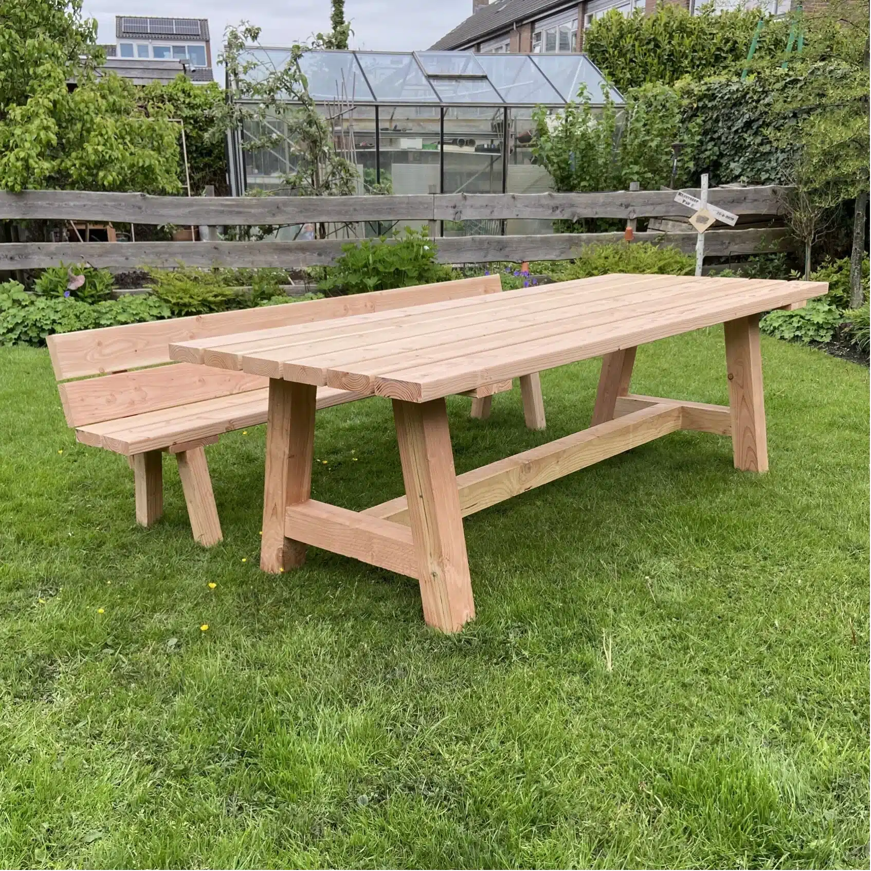 Tuintafel Nena is gemaakt van Douglas hout en heeft dankzij zijn design een stoere look. Het tafelblad heeft kieren van circa 1 centimeter. Je kunt de tuintafel volledig op maat bestellen met het keuzemenu rechts. Bekijk ook zeker de douglas tuinstoelen of kunststof stoelen voor een complete look. Je hebt in het keuzemenu ook de mogelijkheid voor een bijpassend bankje. Dit bankje wordt op maat gemaakt voor de tafel.
