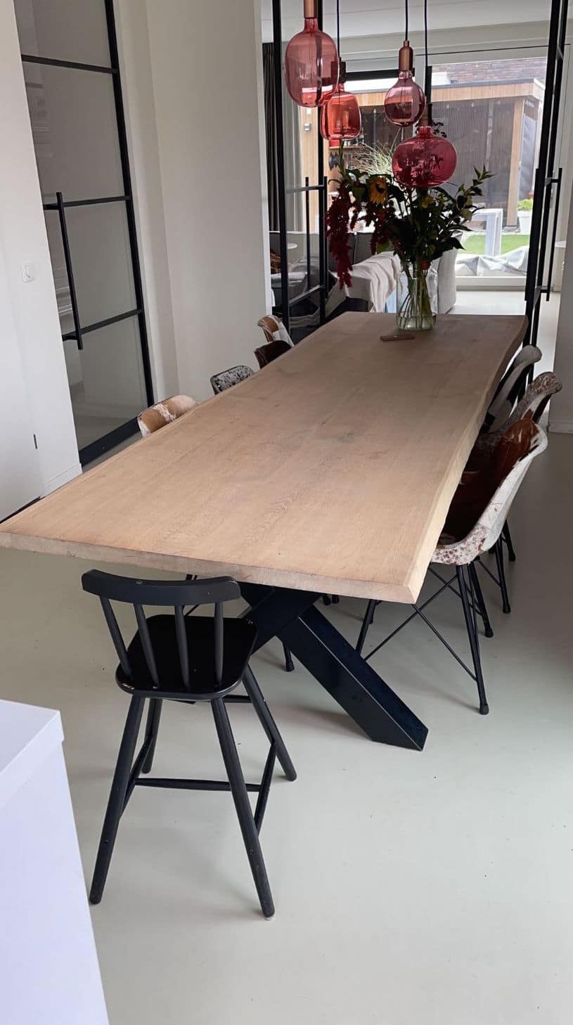 Dalbo is een leuke industriële tafel met eikenhout en stalen poten. De stalen x poten geven de tafel een luchtig en speels effect. De poten zijn aan de kopse kanten van het eikenhouten tafelblad geplaatst. De tafel is op maat te bestellen en combineert goed een eikenhouten industrieel bankje.