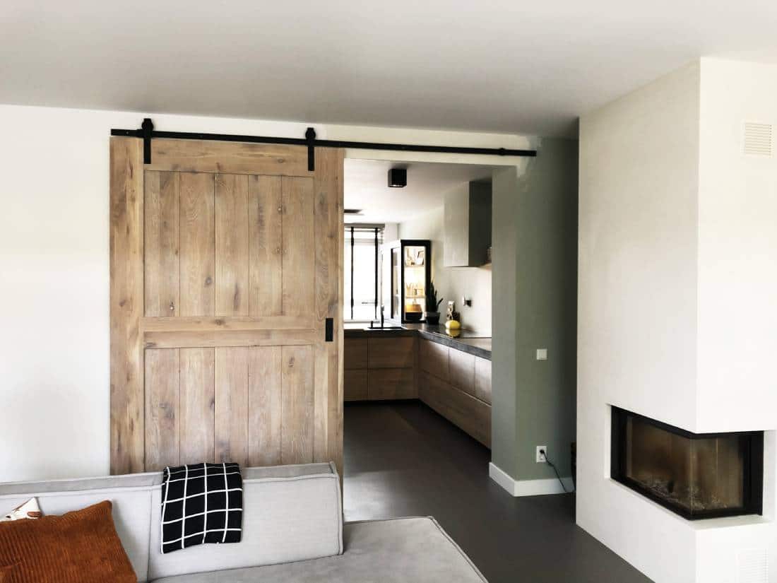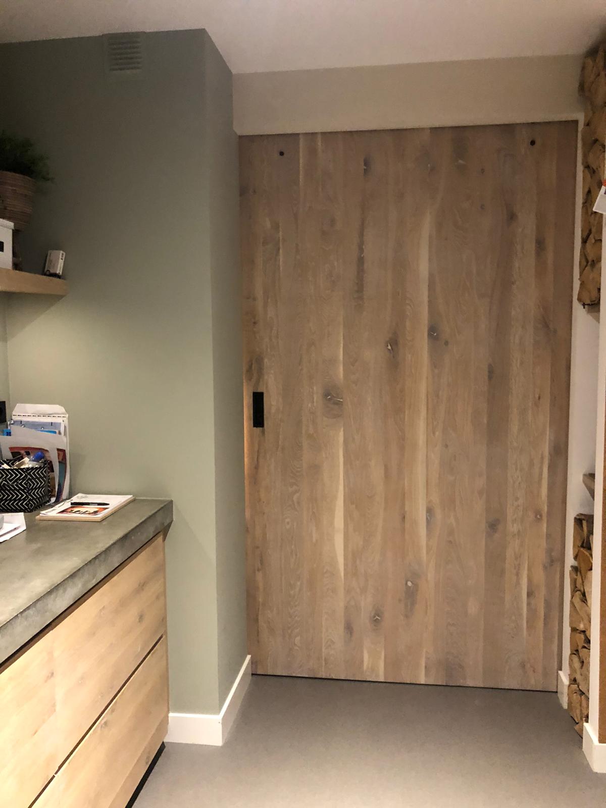 Eikenhouten loft-/schuifdeur met industrieel ophangsysteem