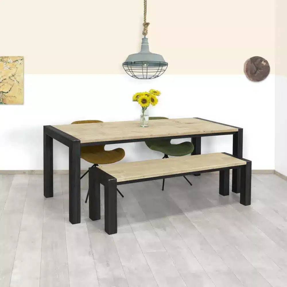 Industriële meubelen worden handgemaakt met steigerhout en staal. Voor de behandeling van het steigerhout kun je hier meer lezen. Door de ambacht kunnen poten altijd iets van elkaar afwijken en kunnen de poten lasspetters bevatten, dit hoort bij het product.