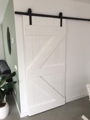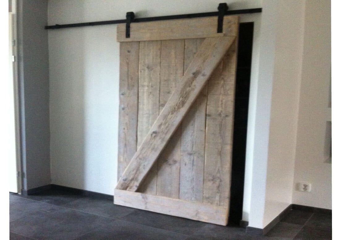 Steigerhouten loftdeur op maat gemaakt. De loft deur wordt compleet geleverd met industrieel ophangsysteem. Alle schuifdeuren zijn verkrijgbaar in eikenhout, in elke afmeting en kleur.