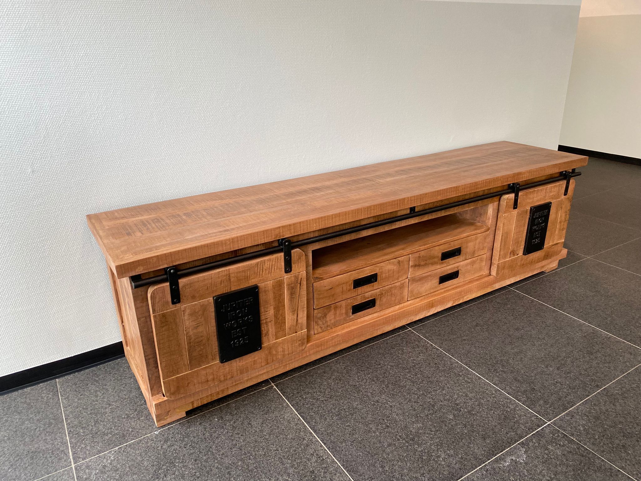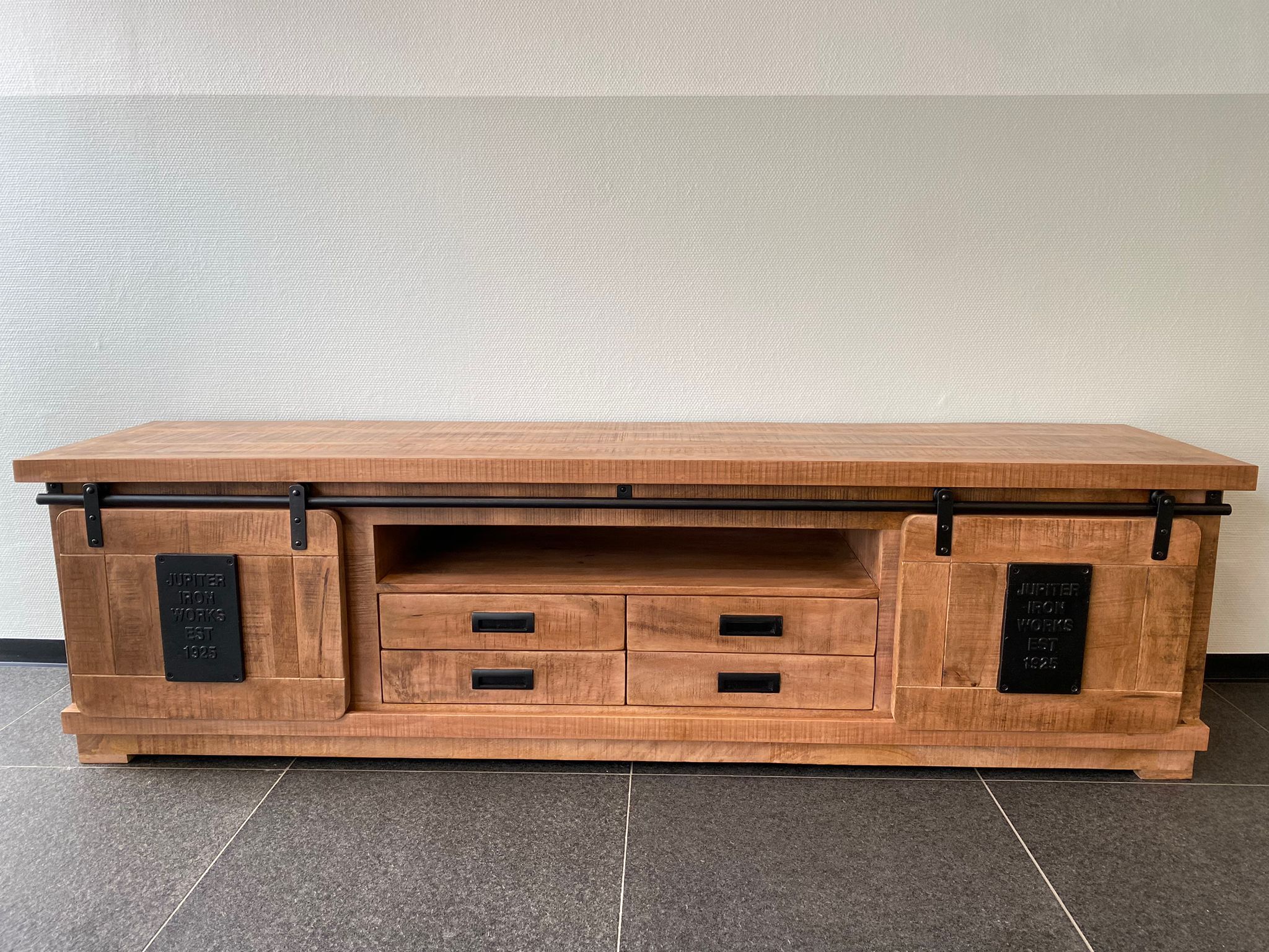 Mangohout tv-meubel Suze met schuifdeuren en 4 lades