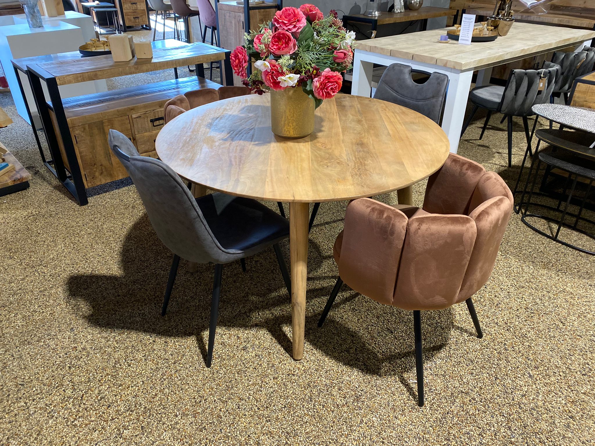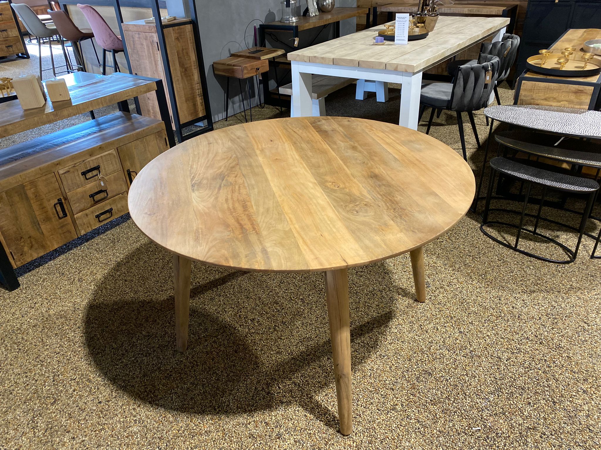Mangohout tafel Aflex met rond blad en matrixpoot