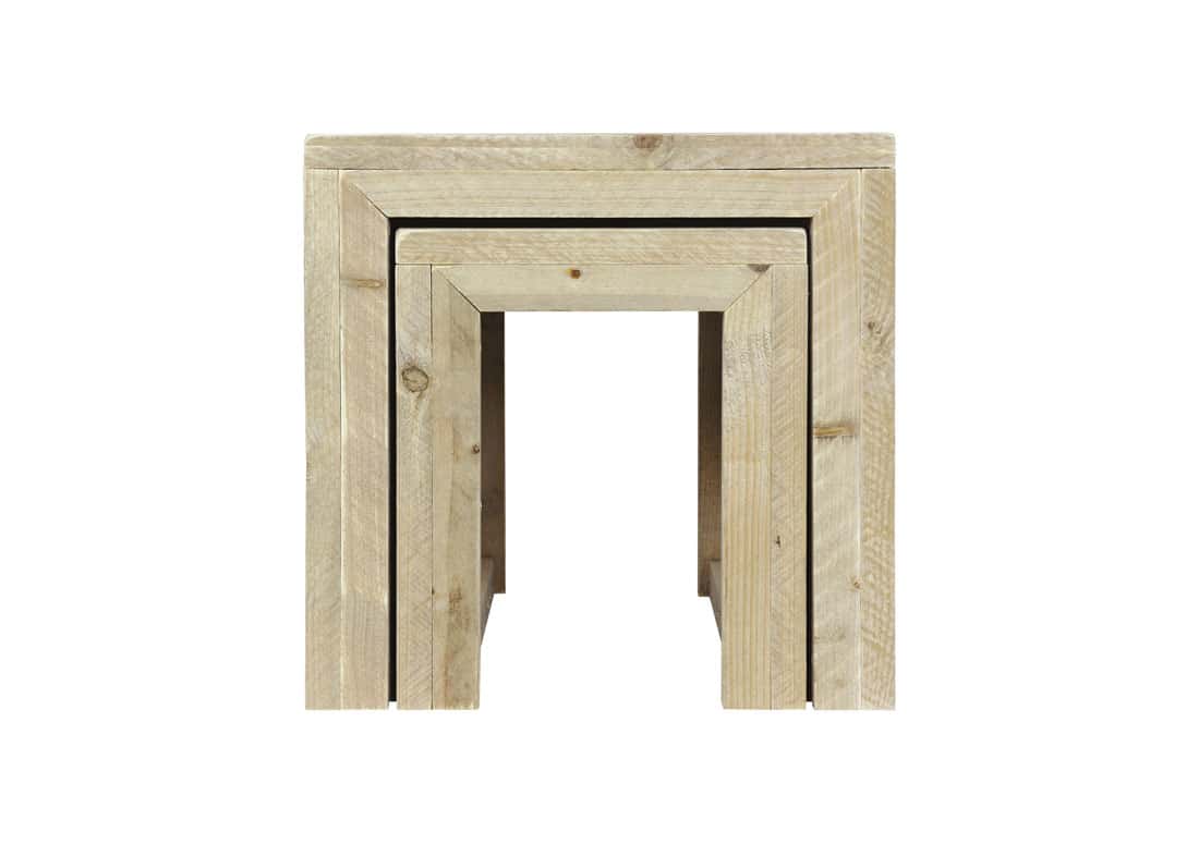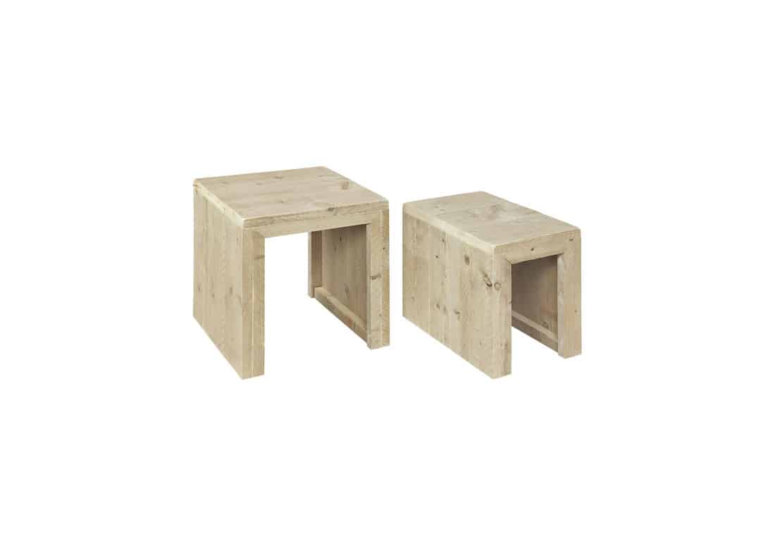 Steigerhouten duo model, geleverd als setje. De steigerhouten salontafels zijn multifunctioneel en makkelijk op te bergen.