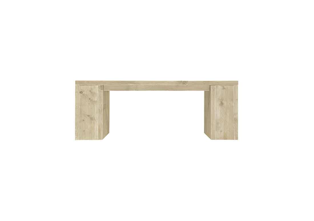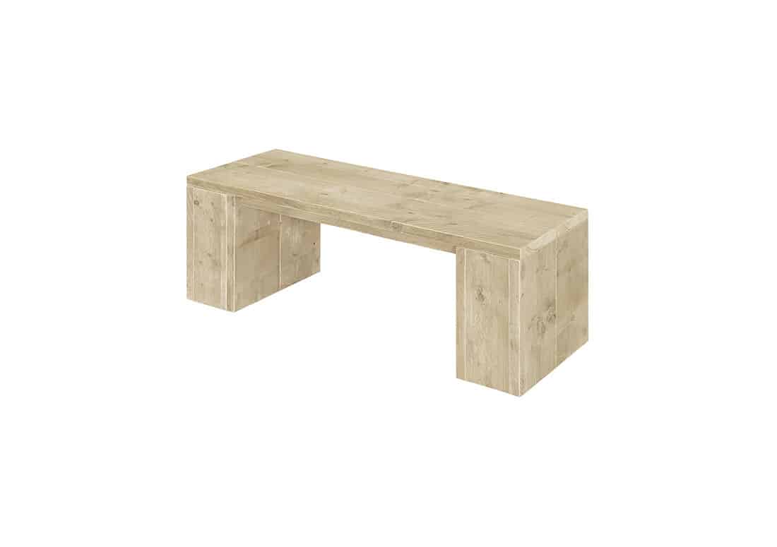 Steigerhouten bankje met dikke blok zijkanten. Leuk om bij je steigerhouten tafel te zetten of in je tuin. Dit bankje is gemaakt van gebruikt steigerhout. Hierdoor heeft het bankje een robuust uiterlijk.
