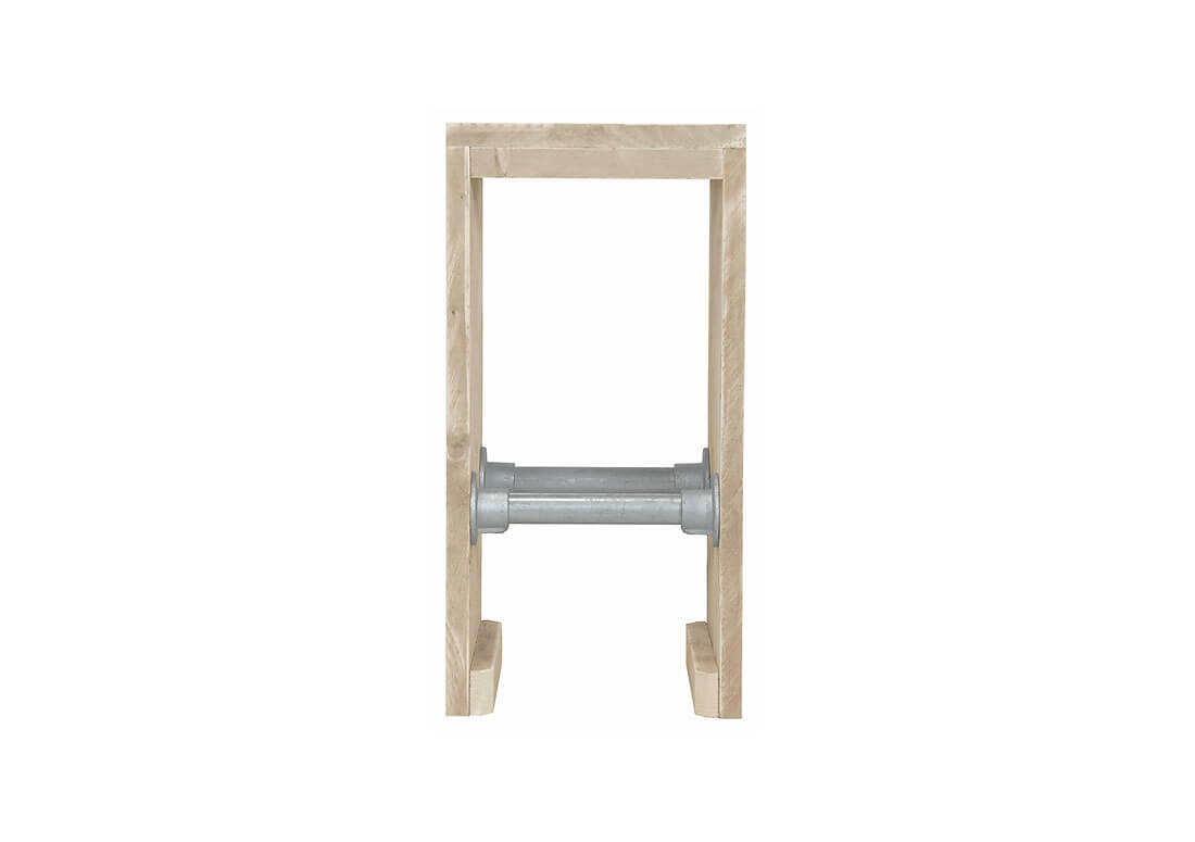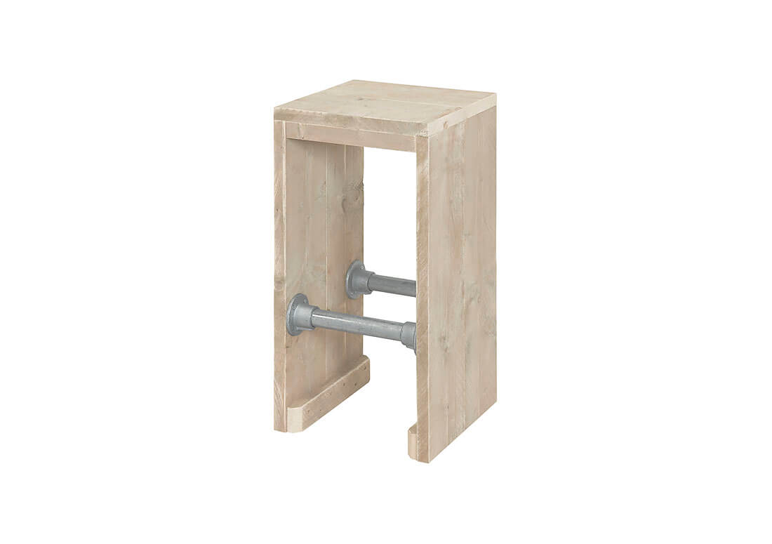 De barkruk is gemaakt van gebruikt steigerhout en als detail heeft het een steigerbuis als voetsteun. Deze Barkrukken zijn erg stevig en kunnen uitgebreid worden met water en vuil afstotende kussens. Er is keuze uit 24 verschillende kleuren.