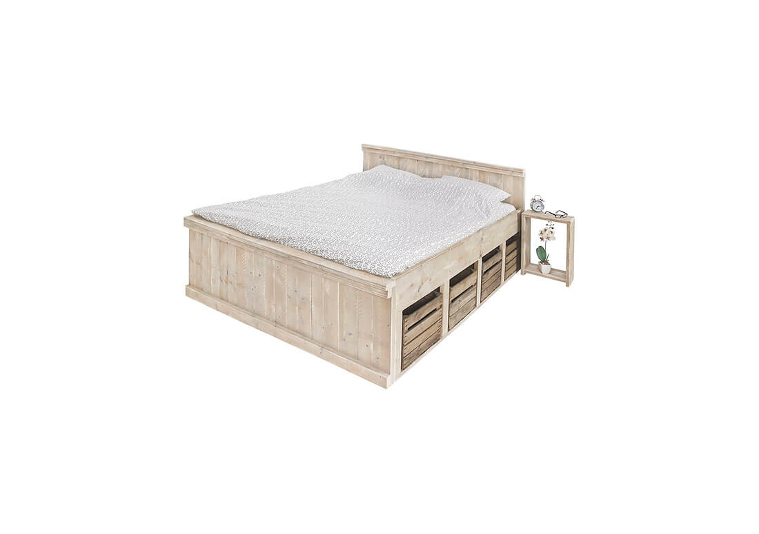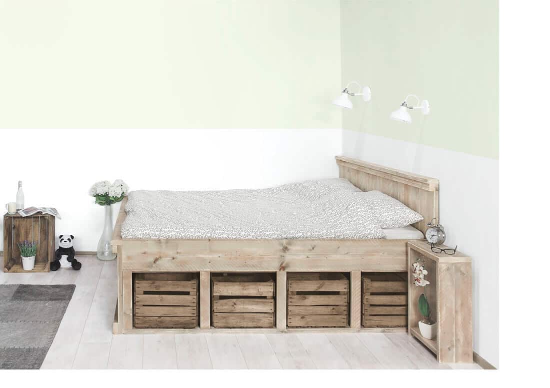 Dit steigerhouten bed met fruitkistjes biedt veel extra opbergruimte. Het bed wordt standaard gemaakt van gebruikt steigerhout.