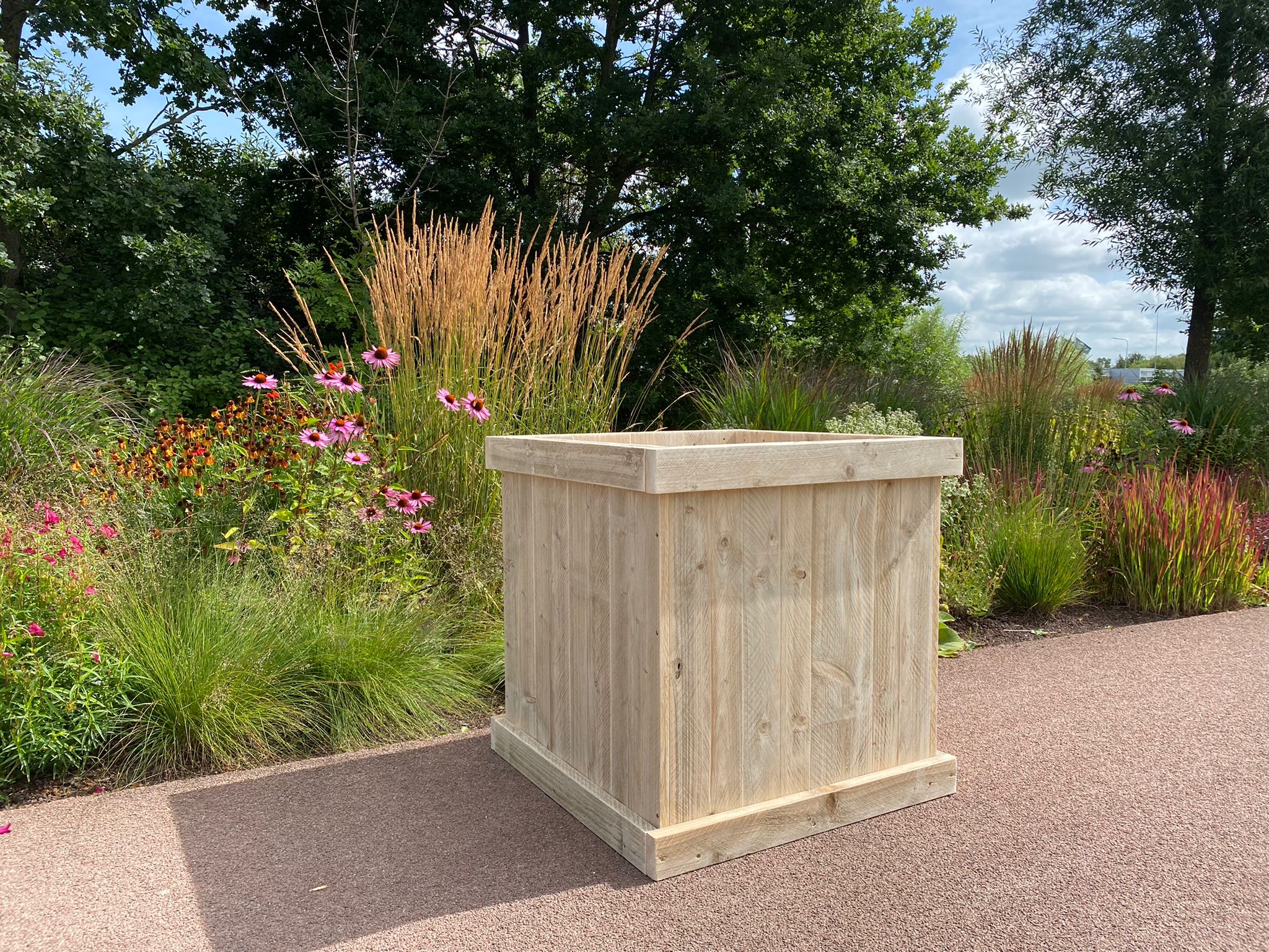 Fleur je tuin op met deze prachtige plantenbak. Leuk voor in de zomer met mooie bloemen erin. Je kunt de bloembakken het hele jaar door buiten laten staan. Standaard is de bodem 30cm vanaf de bovenkant gemonteerd.