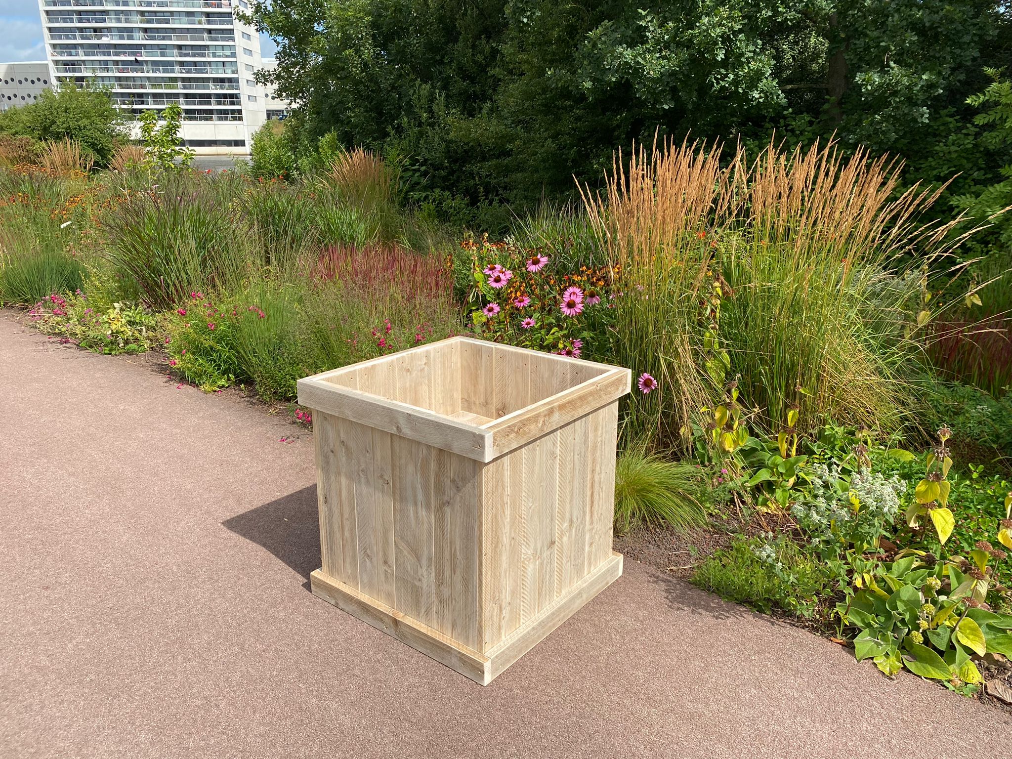 Een steigerhouten bloembak is een aanvulling in elke tuin of balkon. Onze bloembakken kunnen het hele jaar buiten staan. Hierdoor wordt zelfs de bak nog robuuster. Elke bloembak is op maat te bestellen in onze webshop. Kies de juiste afmetingen in het menu rechts. Een bodem en worteldoek zijn optioneel. Het is afhankelijk van de planten of bloemen die jij erin wilt zetten. Standaard is de bodem 30 centimeter vanaf de bovenkant gemeten.
