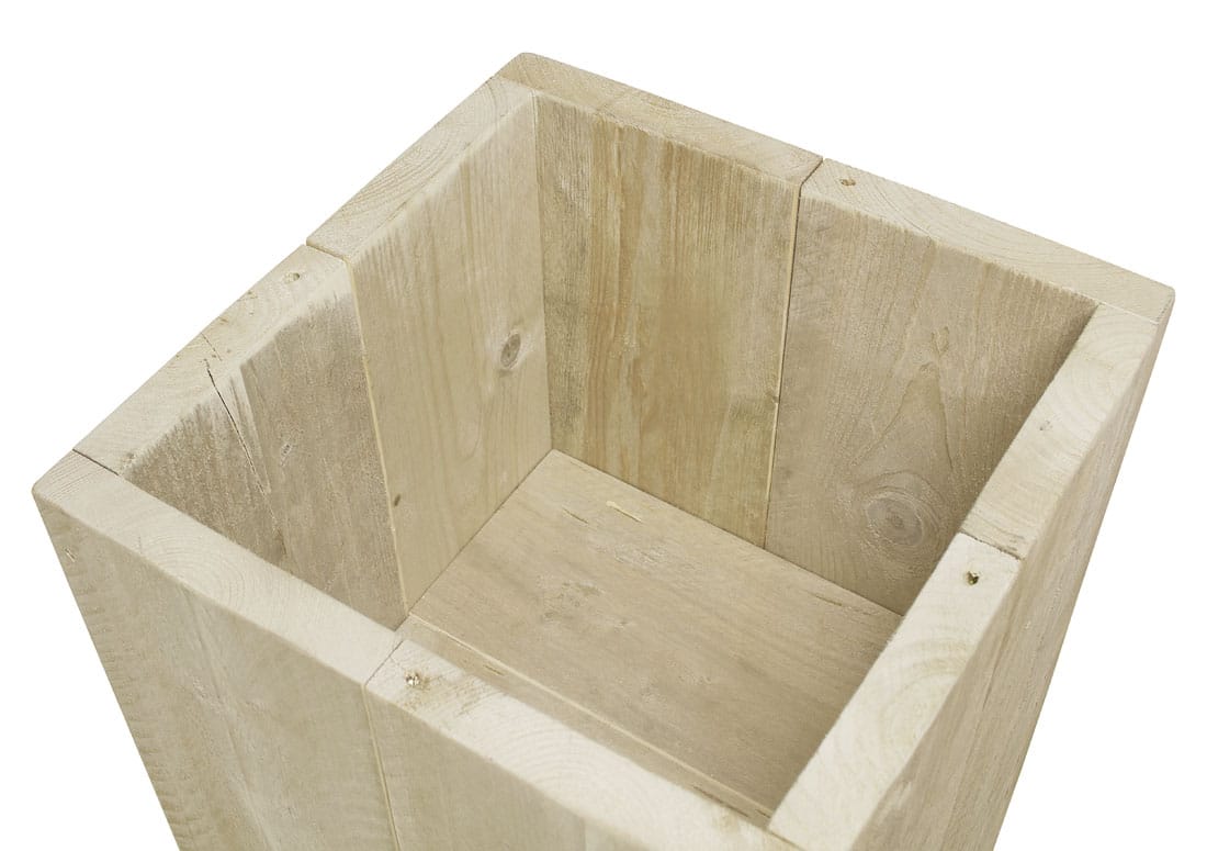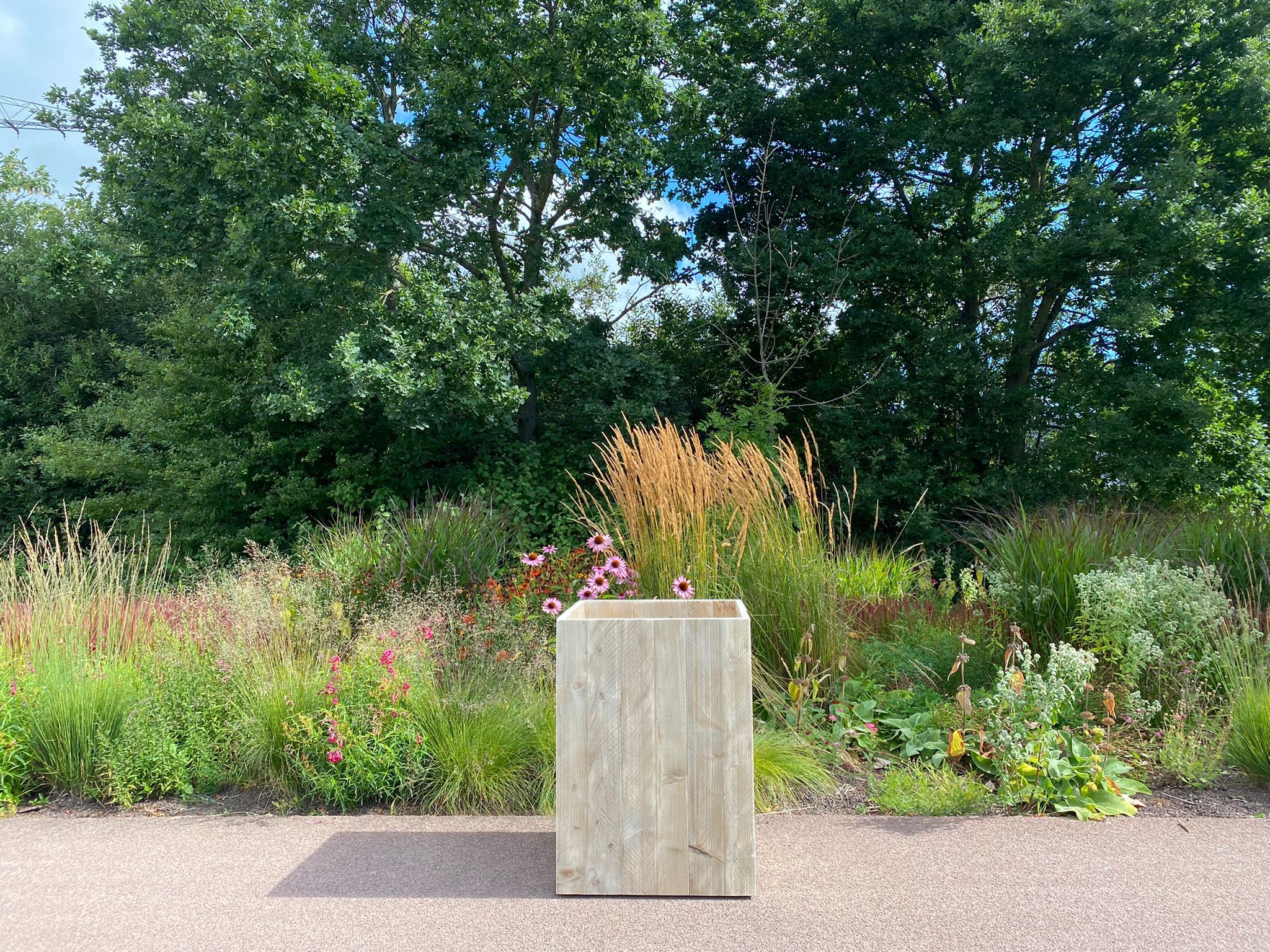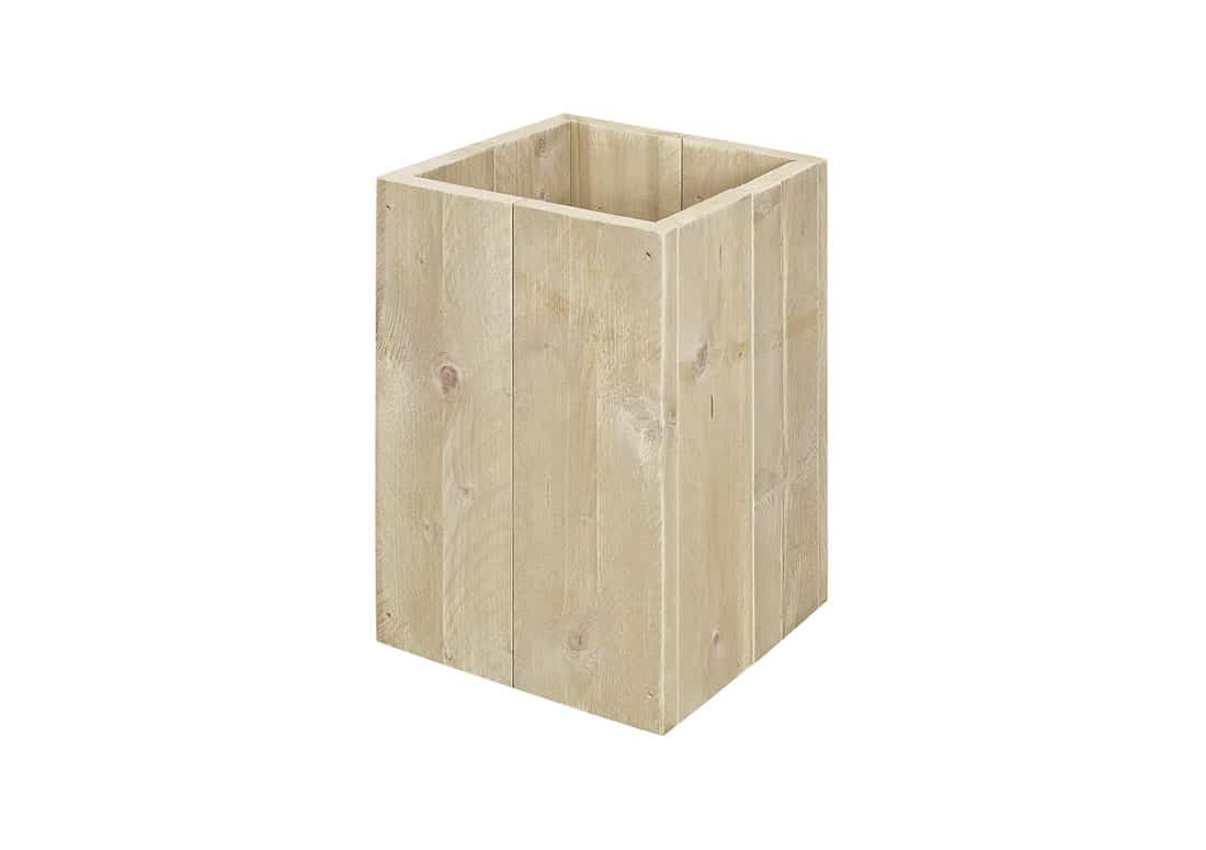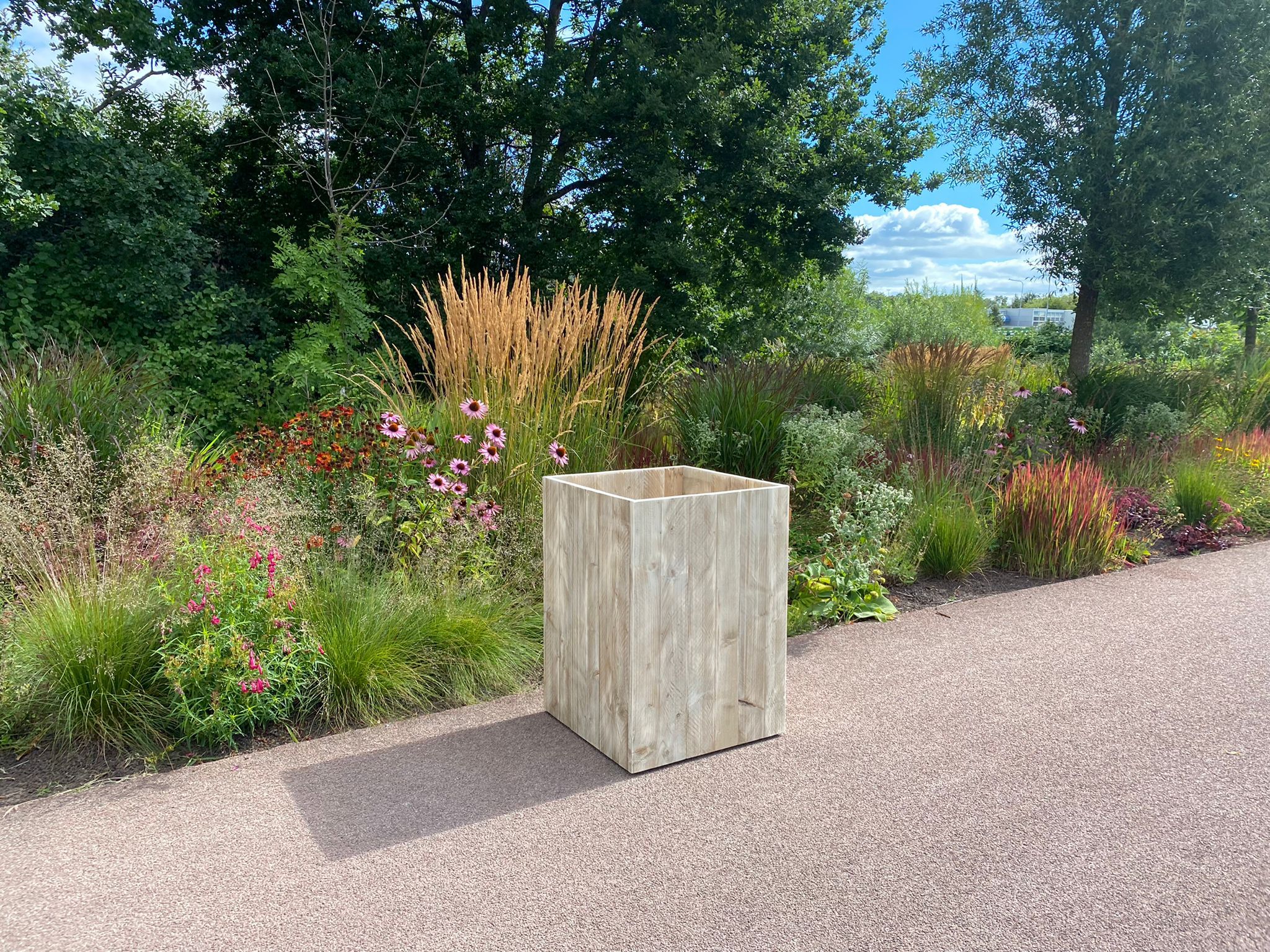 Deze robuuste bloembak heeft een uniek design. Het vierkante hoge model is beschikbaar in verschillende afmetingen en zelfs bestelbaar met wielen! De bloembak is gemaakt van gebruikte steigerplanken, die machinaal zijn geschuurd. Na enkele maanden krijgt dit hout een grijze kleur. Daarom kun je de bloembak het beste beschermen met een kleurloze nano coating.