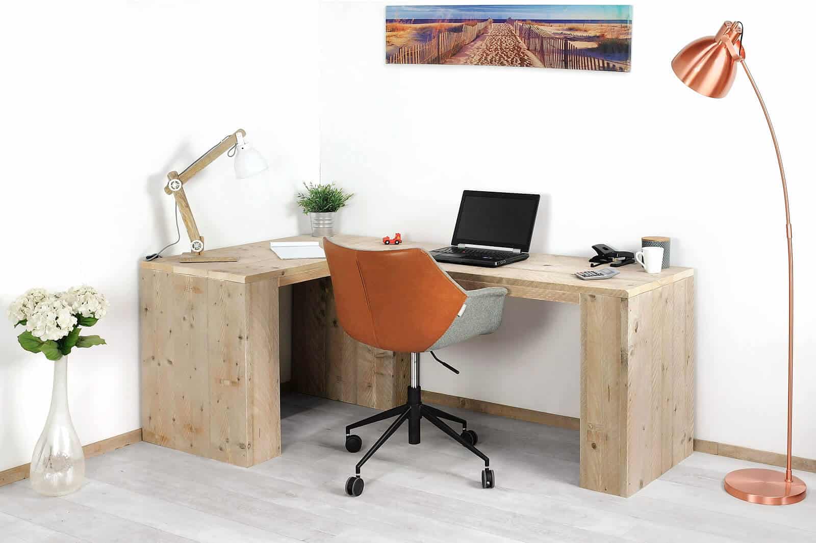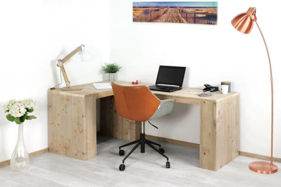Dit steigerhouten Maryland hoekbureau en kan op veel verschillende manieren worden gebruikt. Door de robuuste uitstraling, die in elk interieur past, kan deze dienen als bureau op kantoor, in studieruimtes of gewoon in de huiskamer. Door de hoekvorm biedt dit bureau veel werkruimte en in combinatie met een ladeblok kun je al je kantoorartikelen opbergen in dit handige meubel. Om dit bureau een extra luxe uitstraling te geven kun je er voor kiezen om een glasplaat te laten plaatsen. Zo is het steigerhouten blad direct beschermd en heb je een heerlijke ondergrond om op te werken.