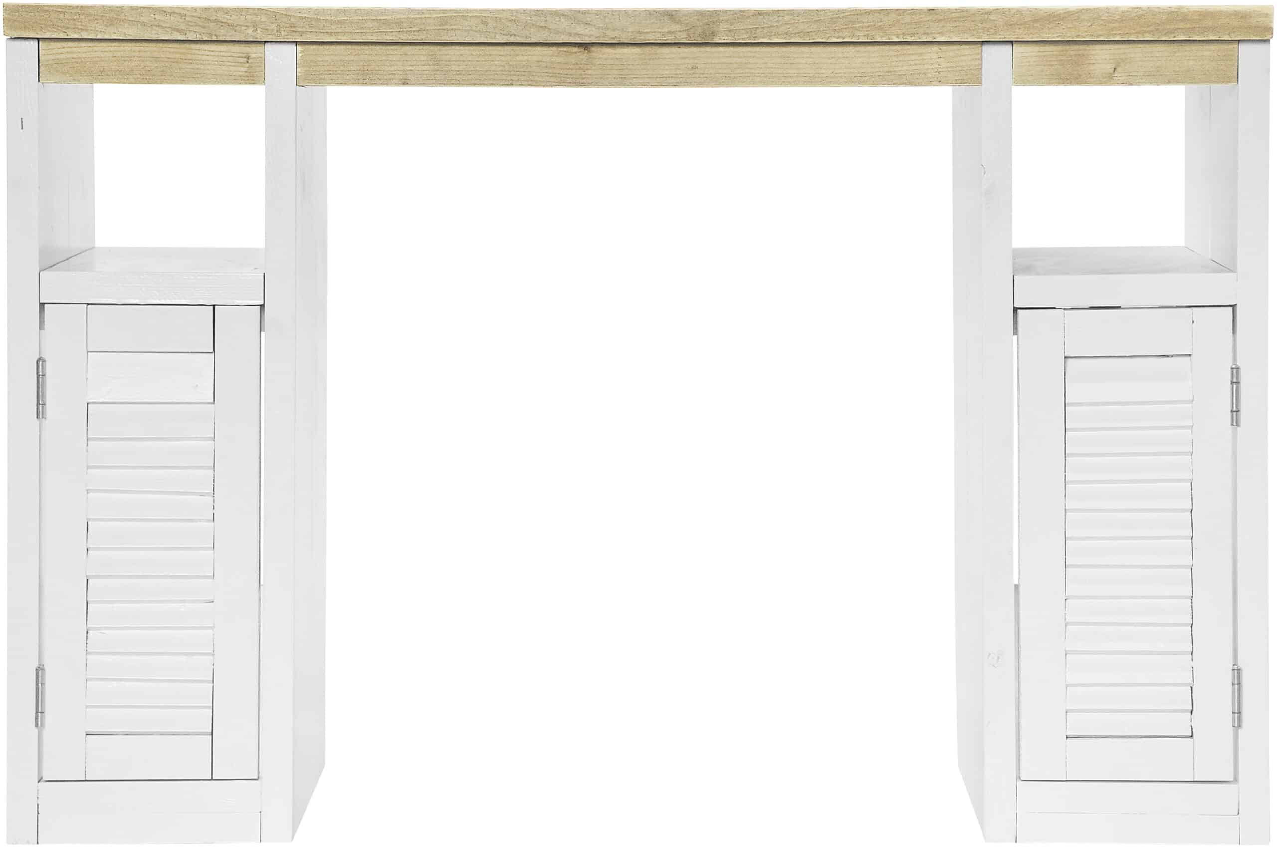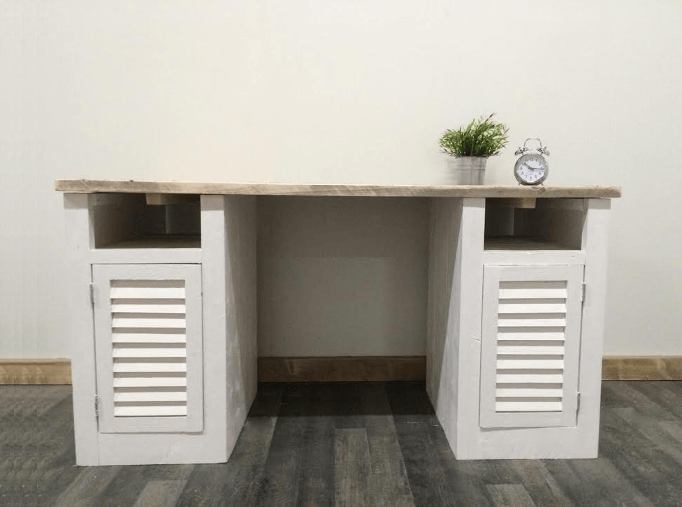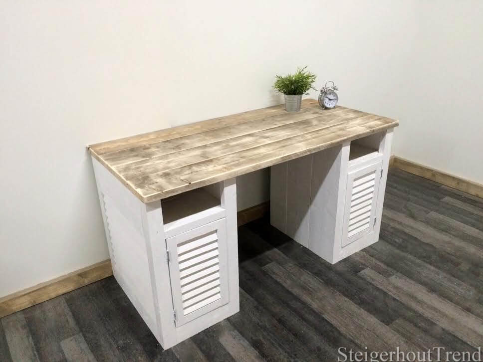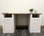 Een uniek bureau in landelijke stijl. Met zijn leuke shutterdeurtjes heb je zeker een uniek bureau in huis. Het tafelblad steekt aan de voorzijde iets over. Boven de deurtjes is een open vak. Het mogelijk deze te vervangen met een la. Daarnaast kun je nog legplanken toevoegen voor extra opbergmogelijkheden.