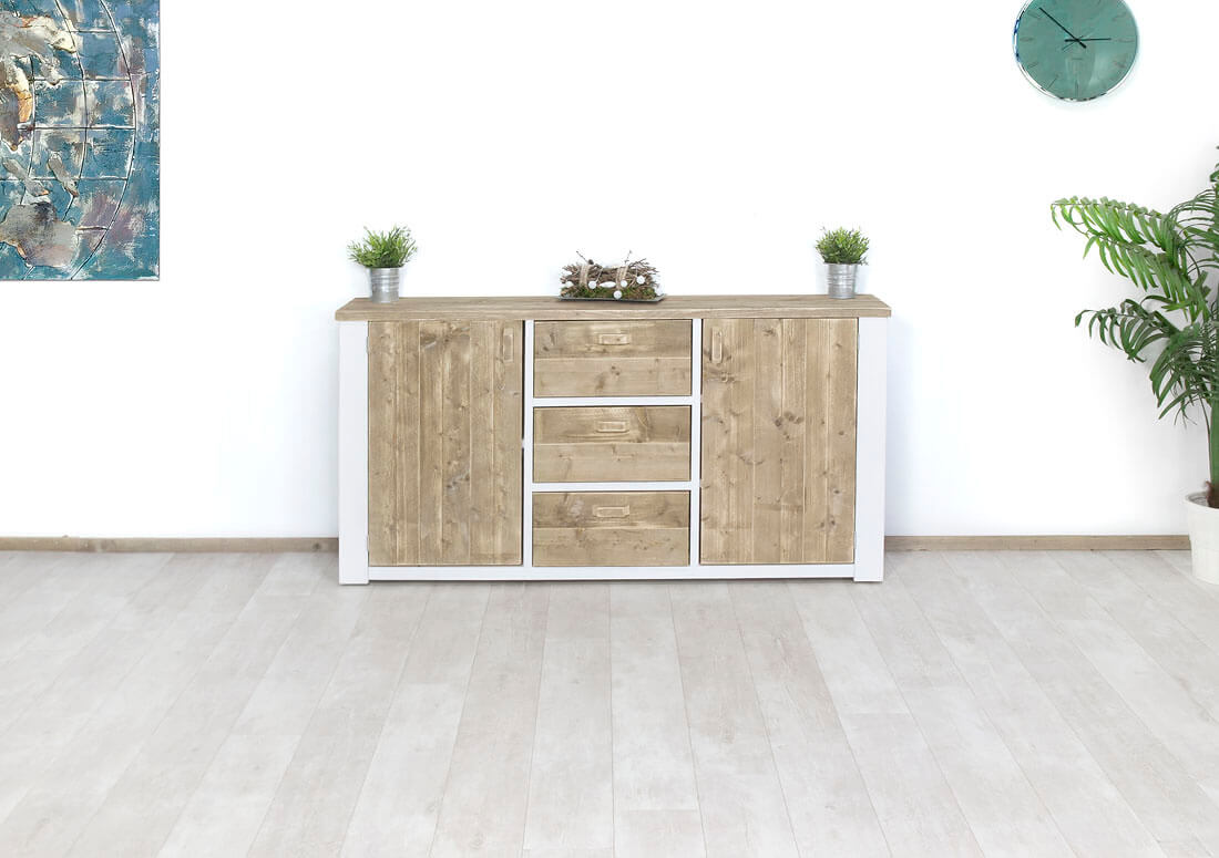 Dit exclusieve steigerhouten dressoir Rulo is deels wit gelakt. Het heeft daarmee een prachtig landelijk karakter. De deuren/lades en het bovenblad zijn standaard onbehandeld, alle overige delen zijn wit gelakt (RAL 9010). De deuren zijn voorzien van een magneetsysteem om de deurtjes goed te sluiten. De handgrepen van hout maken het helemaal af. De lades in het midden geleiden standaard op MDF maar optioneel ook te kiezen uit een ladegeleider rails (voor intensief gebruik). De witte delen naast de deuren zijn 9 cm breed en de kast staat aan de voorzijde iets van de grond, dit om een open karakter te vergroten.