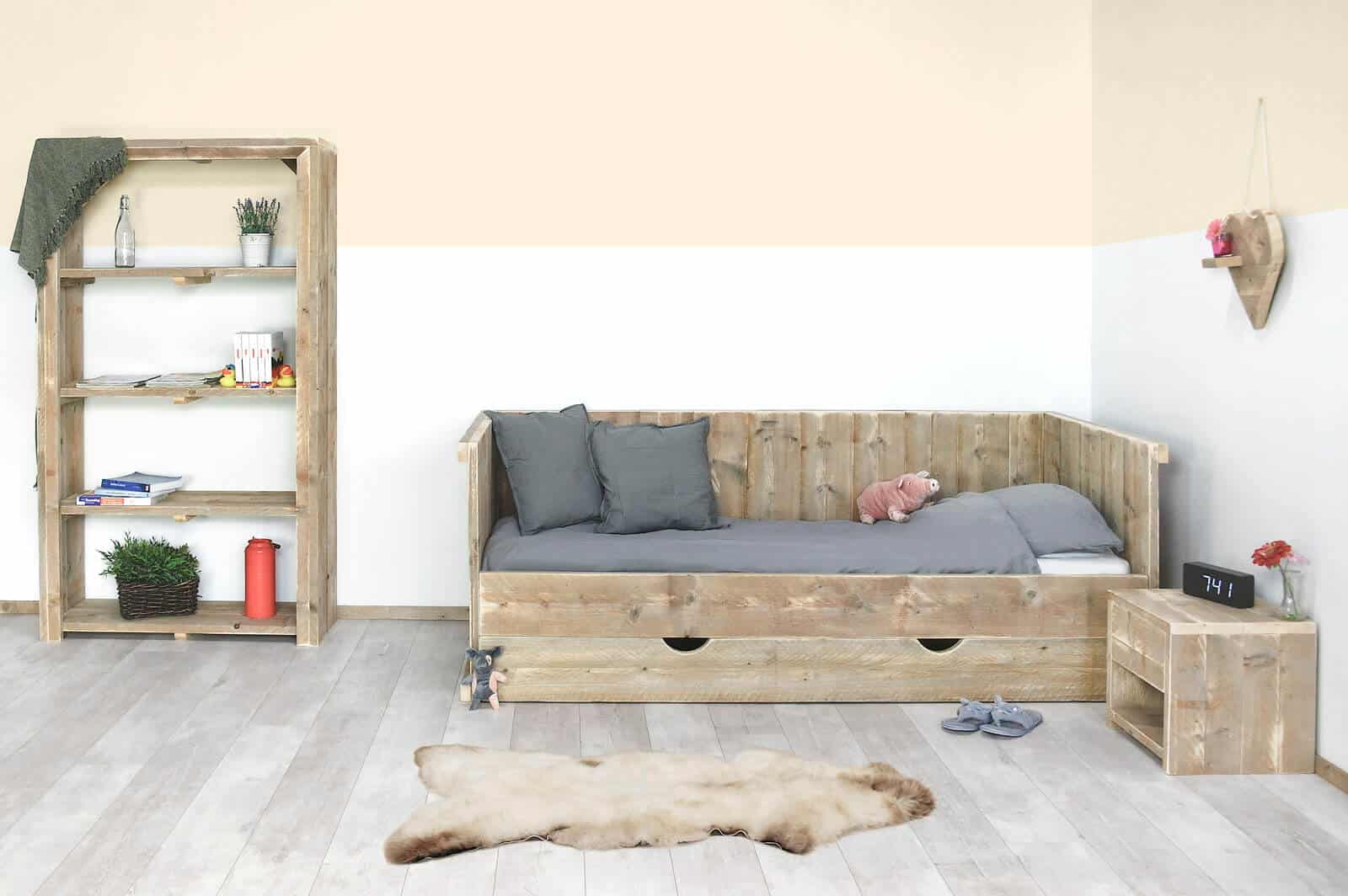 Een super stoer kinderbed met een steigerhouten achterwand. De achterwand is 80 centimeter hoog. Je wilt natuurlijk voor je peuter, kleuter of kind een veilig bed. Het bed wordt machinaal geschuurd en is daardoor volledig splintervrij. Het leuke van bed Stockton is dat het multifunctioneel kan worden gebruikt. Zo maak je er ook gemakkelijk een heerlijke bank van met een aantal kussens. Zo creëer je gemakkelijk een knus hoekje.