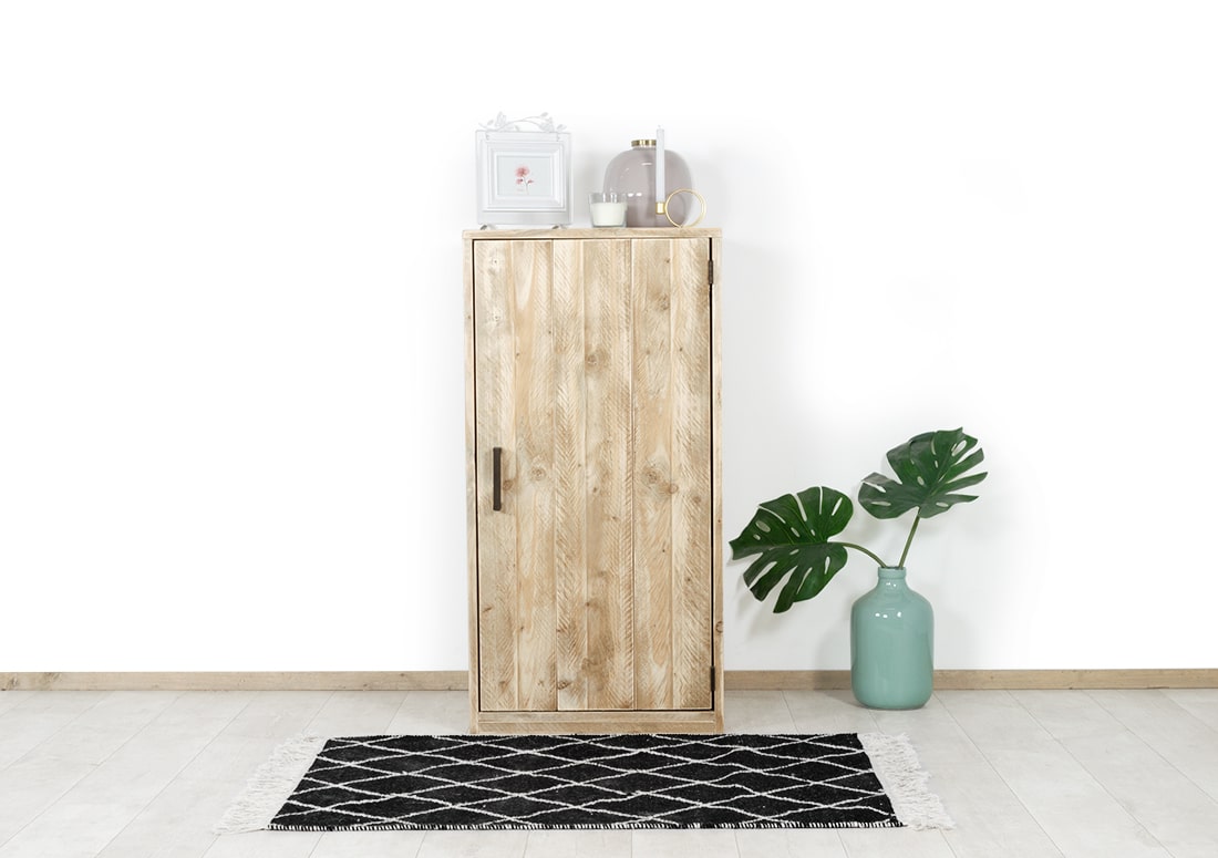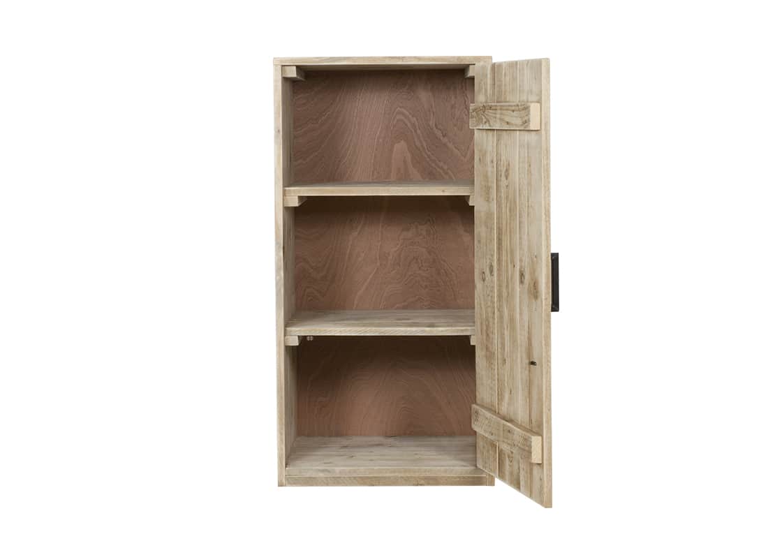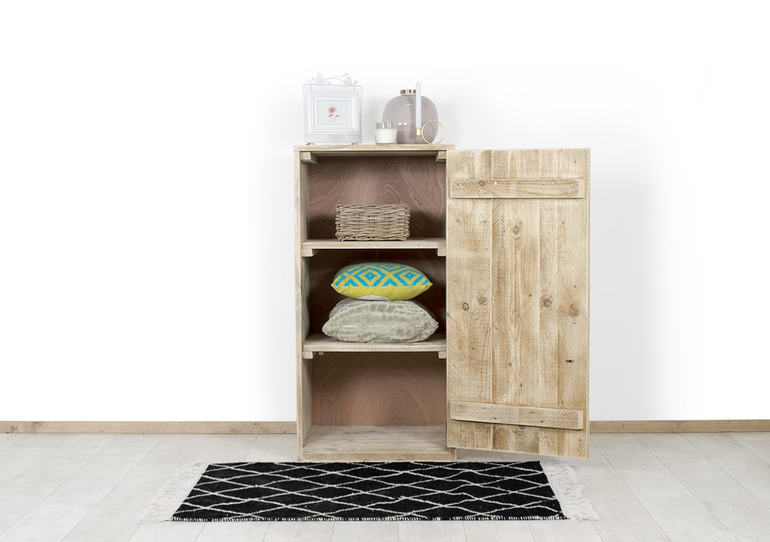 Deze Canton steigerhouten kast heeft een deur en is voorzien van een industriële handgreep. Kies je voor een open achterwand, voor een mooie ruimtelijke uitstraling of toch voor een gesloten opbergkast met achterwand? De keuze is aan jou! Deze kast is ook ideaal als kledingkast en kan optioneel geleverd worden met een kledingroede en legplanken. Daarnaast kun je kiezen of je deze Canton met één of twee deuren wilt gebruiken.