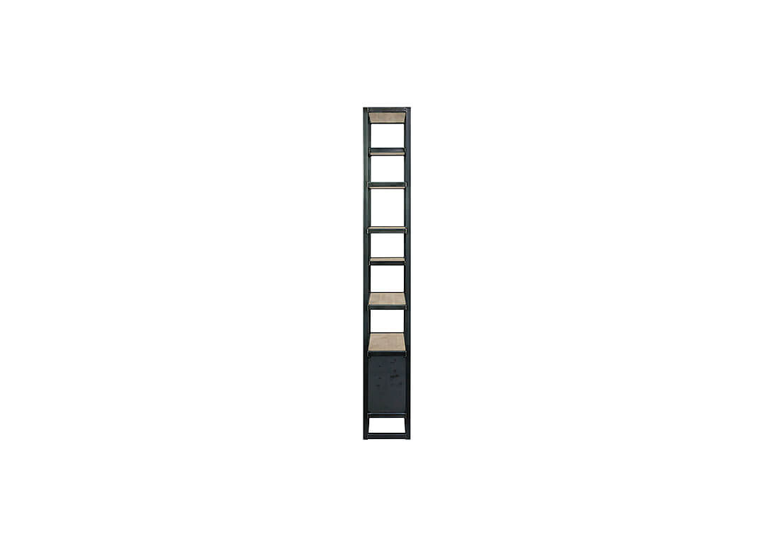 - Zwarte stalen vakkenkast met ingelegde steigerplanken