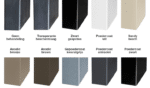 Aan de poedercoating is een kleur toe te voegen, zoals poedercoating wit (RAL 9010), poedercoating antraciet (RAL 7016) en poedercoating zwart (RAL 9005). Deze behandeling zorgt ervoor roestvorming wordt vertraagd. Bij buitengebruik adviseren wij het staal te behandelen met een poedercoating. Volledige garantie op het stoppen van de roestvorming is er niet. Ondanks de behandeling kunnen er vlekken ontstaan op de vloer of op de lange termijn toch nog roest ontstaan. De roestvorming ontstaat door oxidatie. Dit proces van oxidatie is natuurlijk en grotendeels te stoppen door poedercoating.