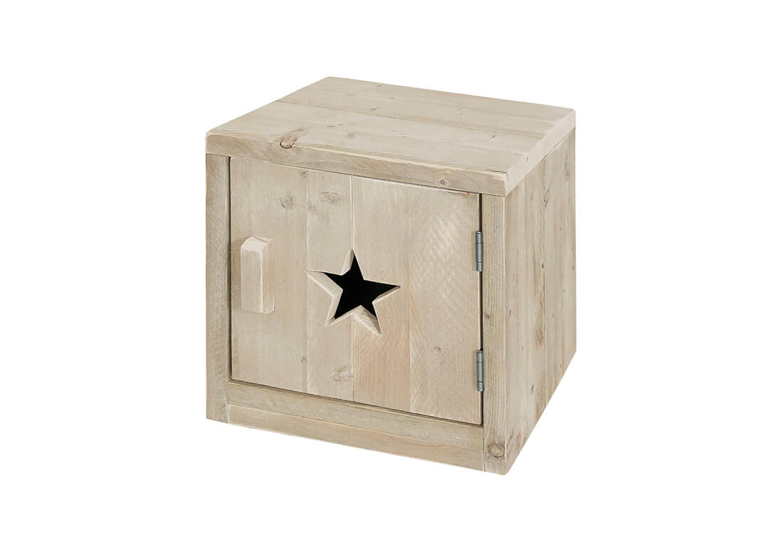Prachtig nachtkastje met een sterretje (andere vormen zijn ook mogelijk). Het steigerhouten nachtkastje is geschikt voor zowel de kinderkamer als volwassen slaapkamer.