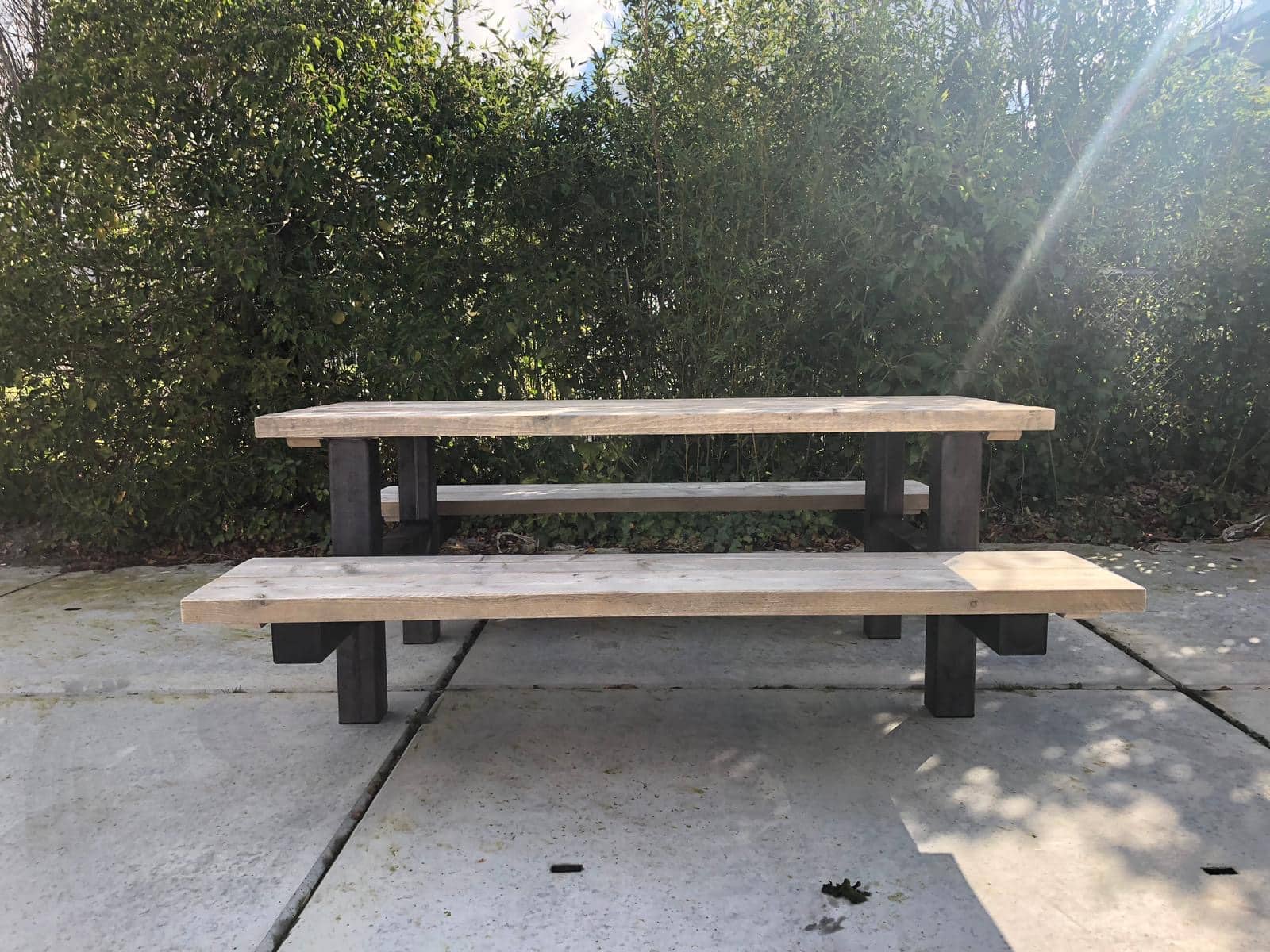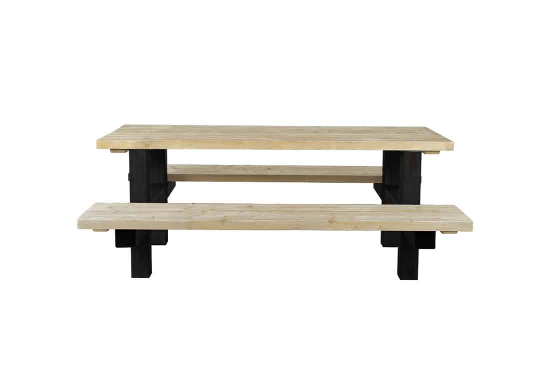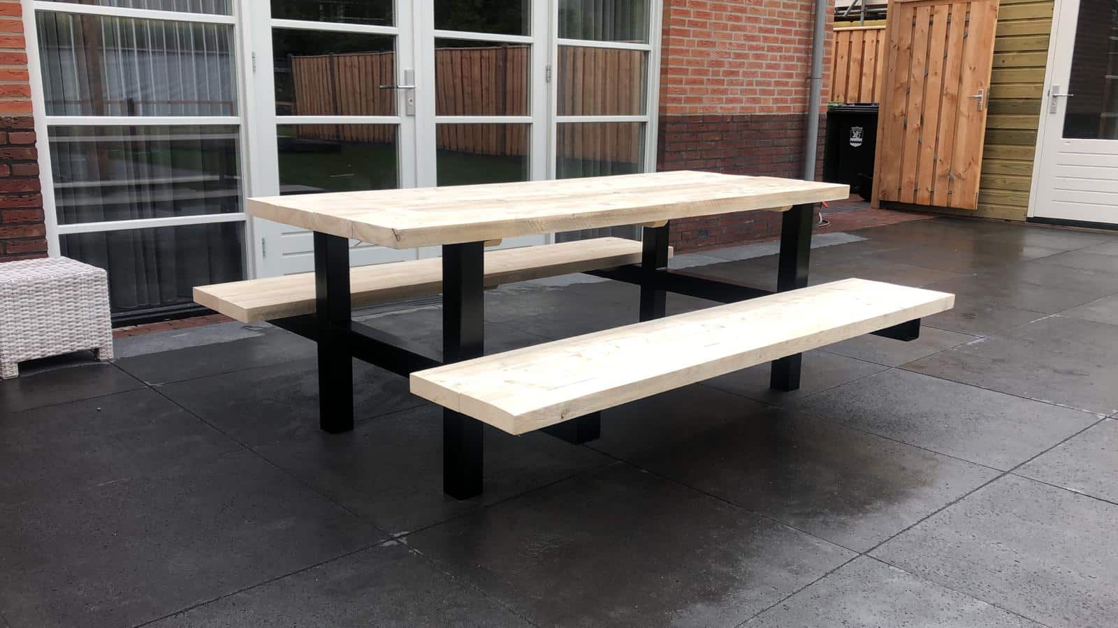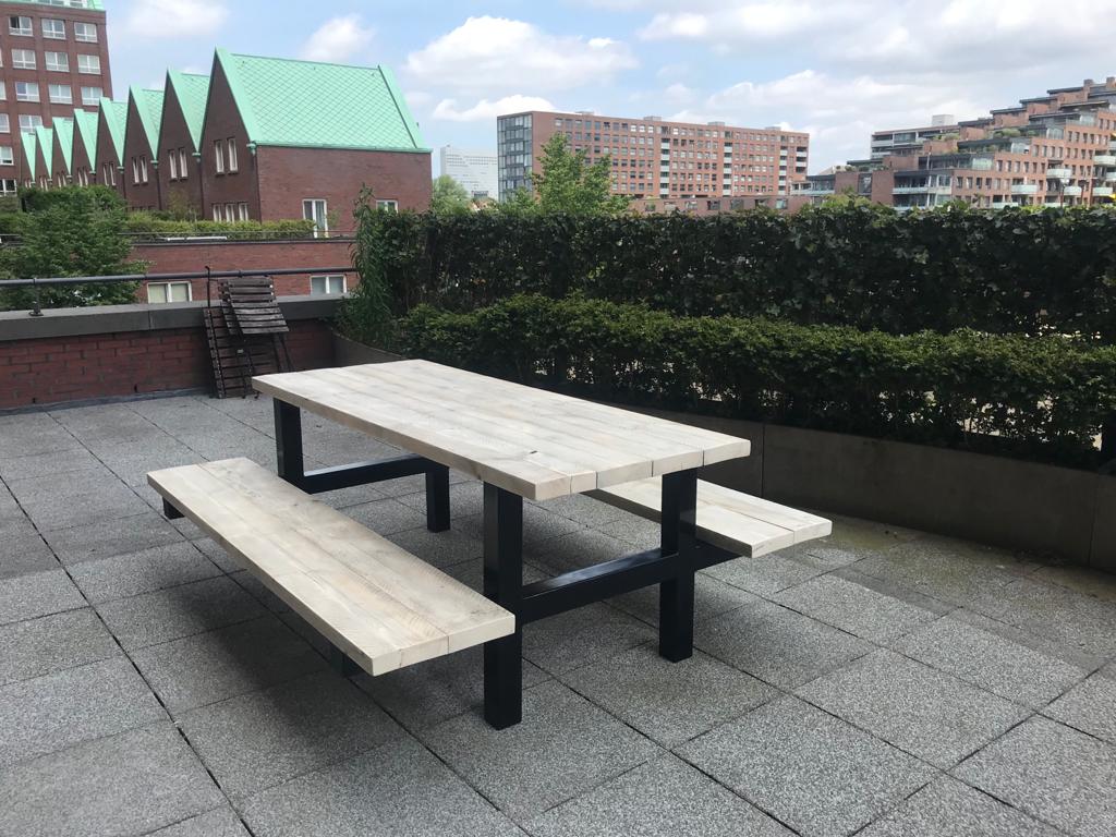 - Industriële picknickbank met een dik steigerhouten blad (5 cm)