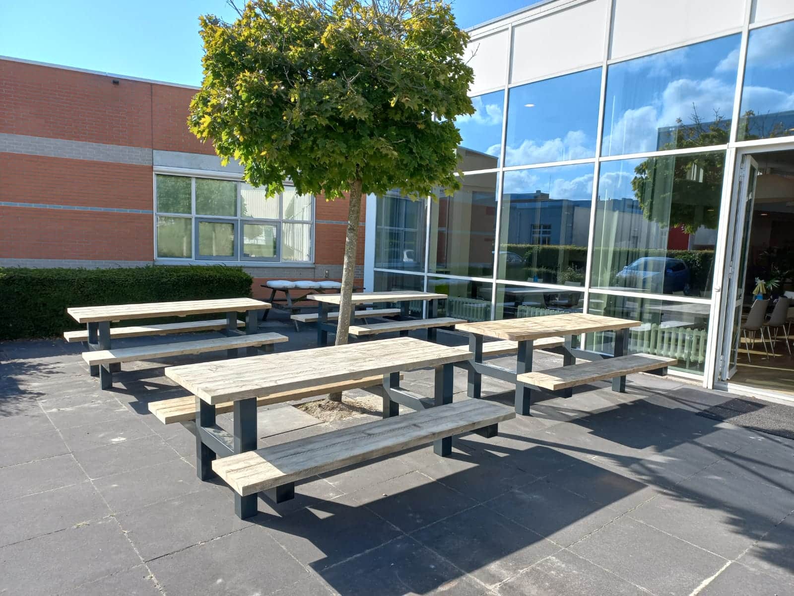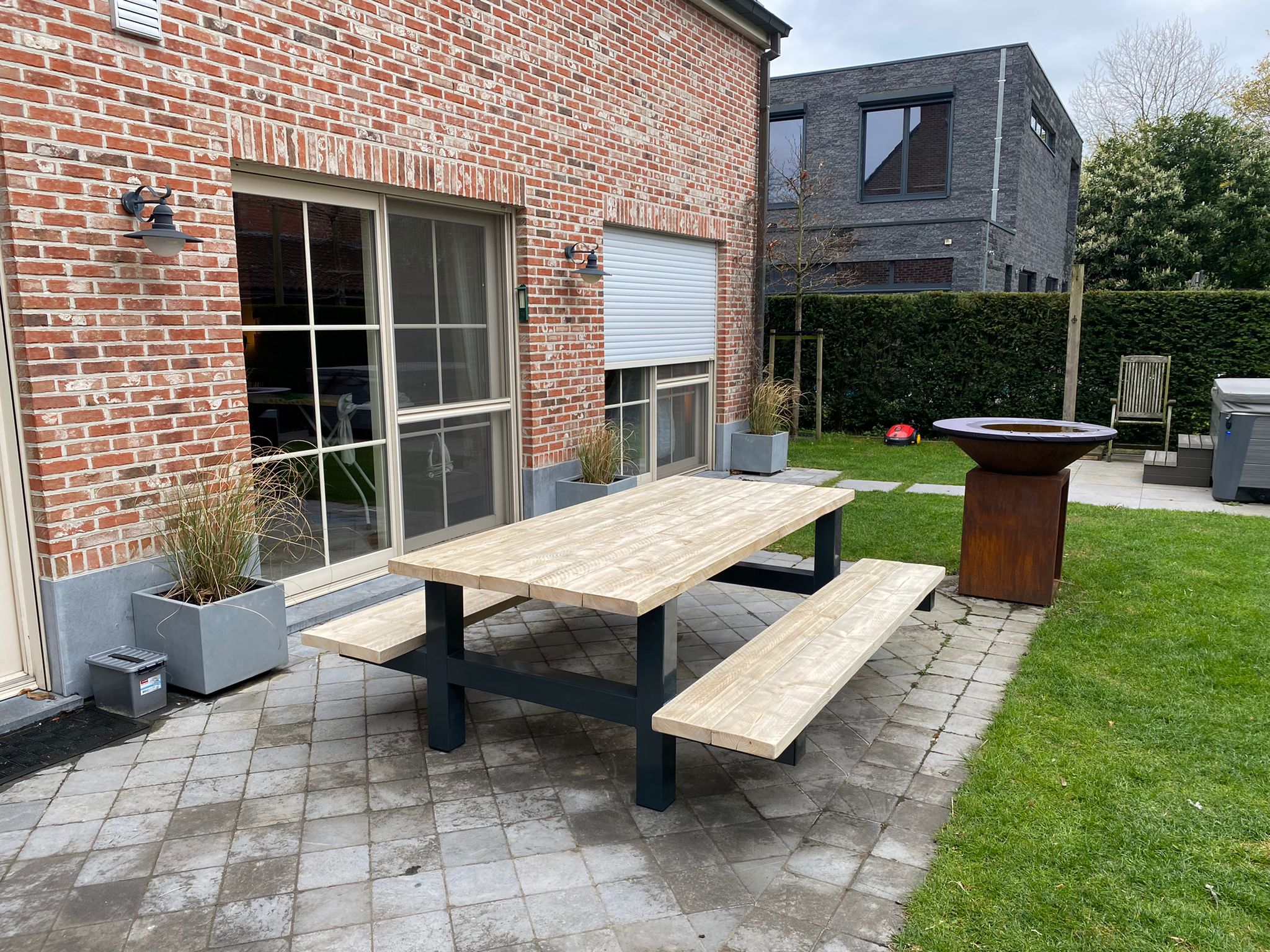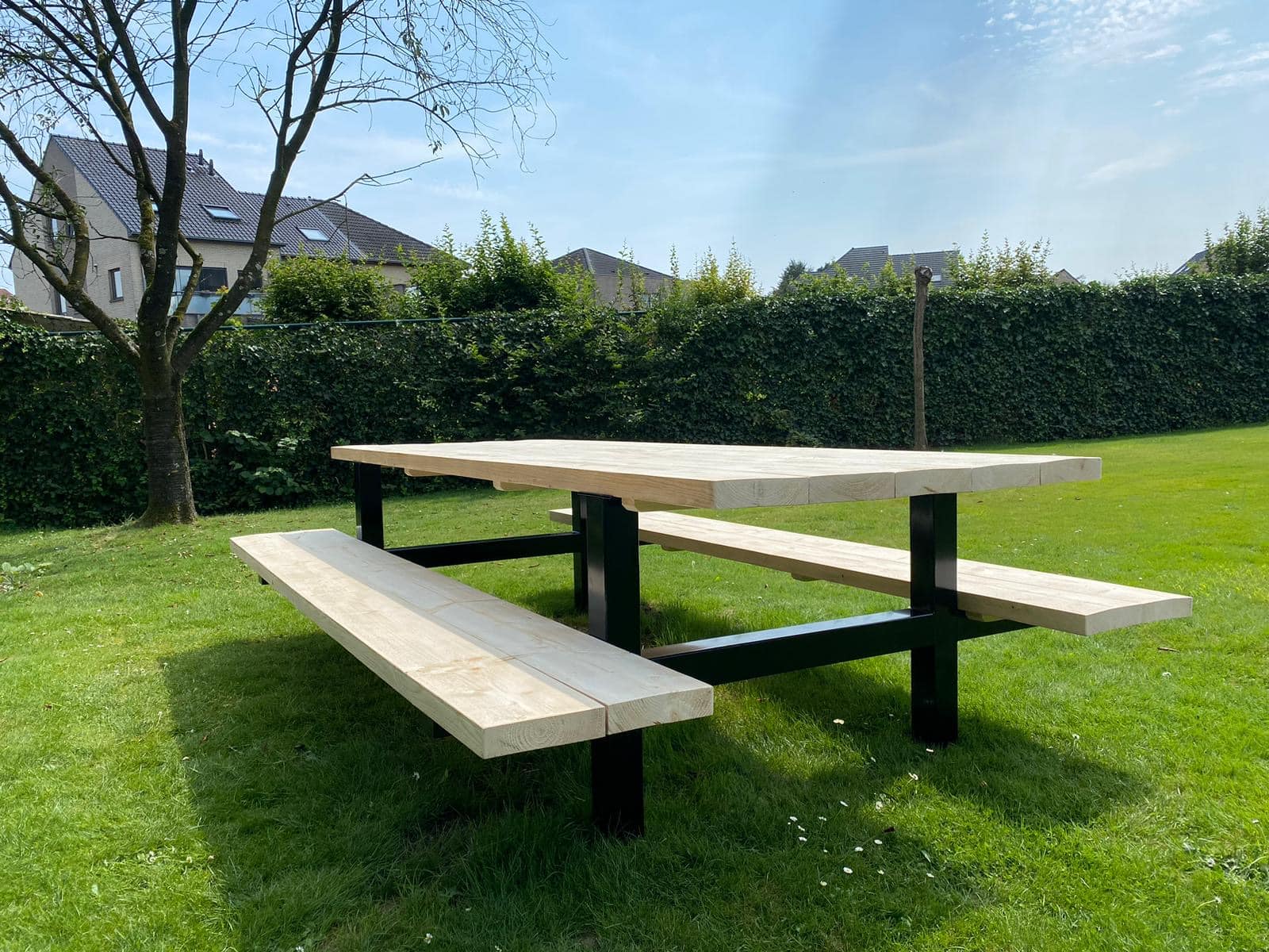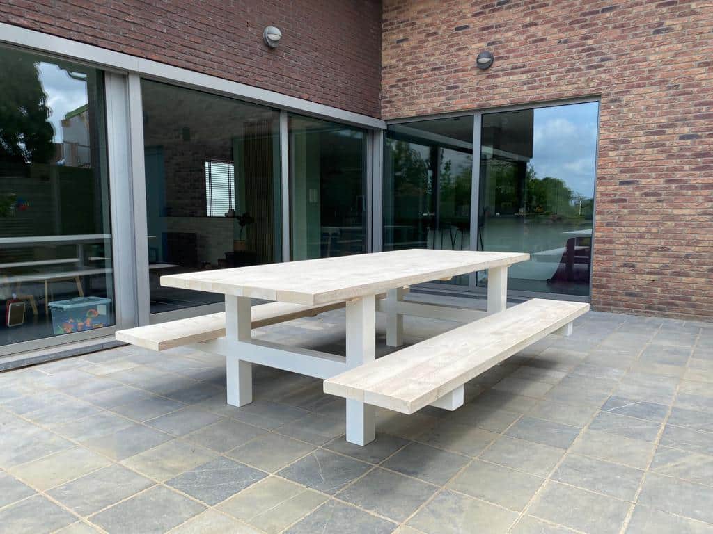 - Industriële picknickbank met een dik steigerhouten blad (5 cm)