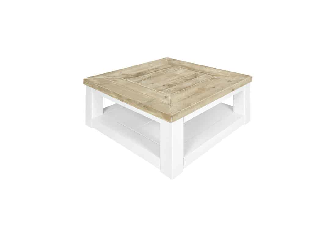 Salontafel Delhi is een aanwinst voor onze landelijke lijn. Het onderstel is gespoten met RAL wit. De salontafel is voorzien van een legplank. De legplank zweeft iets boven de grond.