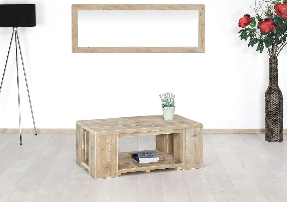 Steigerhouten salontafel Garland is gemaakt van gebruikte steigerplanken. Een absolute aanwinst voor iedere woonkamer. Door het onderblad biedt het enorm veel ruimte en door de dikke poten een echte blikvanger.