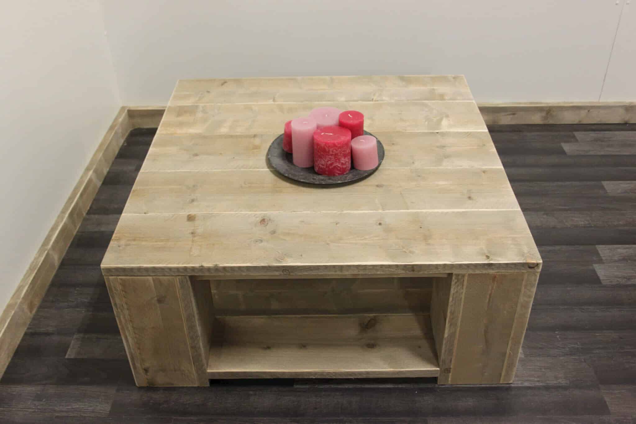 Standaard hebben de poten van ons model Garland poten van 20 x 20 cm. Bij een klein formaat steigerhouten tafel bijvoorbeeld 60 x 60 cm adviseren wij poten van 15 cm breed, wel maken wij de planken dan ook smaller van het blad zodat de poten ten opzichte van het blad mooi in 1 lijn doorlopen. De steigerplanken van het blad maken we dan ook op 15 cm breed. Dit geeft een rustig resultaat. Standaard hoogte van onze salontafel van steigerhout is 40 cm. Maatwerk is ook mogelijk. Het onderblad zoals op de foto kan je gebruiken om tijdschriften of mooie manden op te zetten.