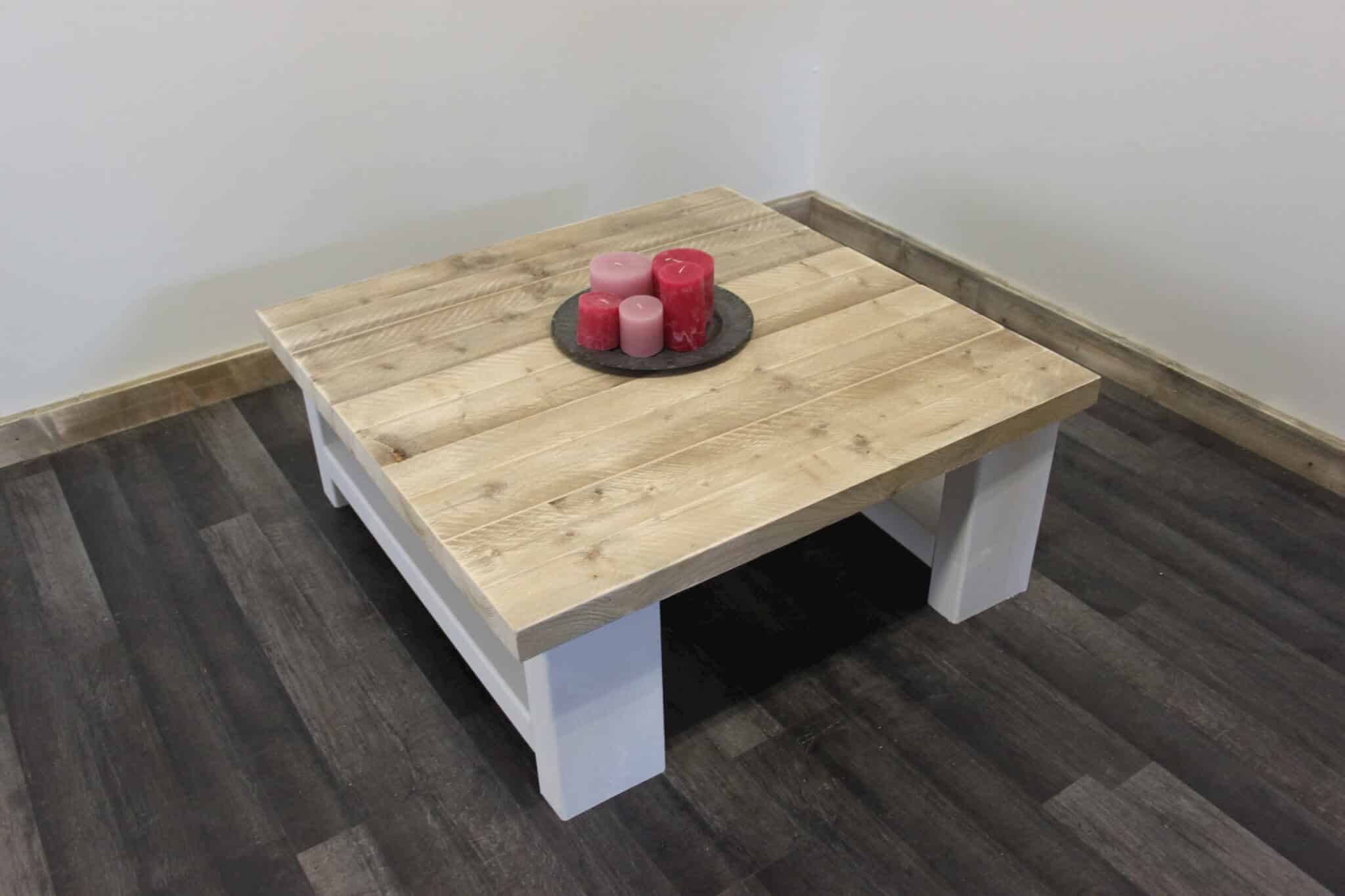 Prachtige salontafel met witte poten. Tegenwoordig is dit helemaal hip en trendy. Geef sfeer aan je huiskamer met deze salontafel. Het blad is gemaakt van oud steigerhout. De poten zijn wit gespoten.