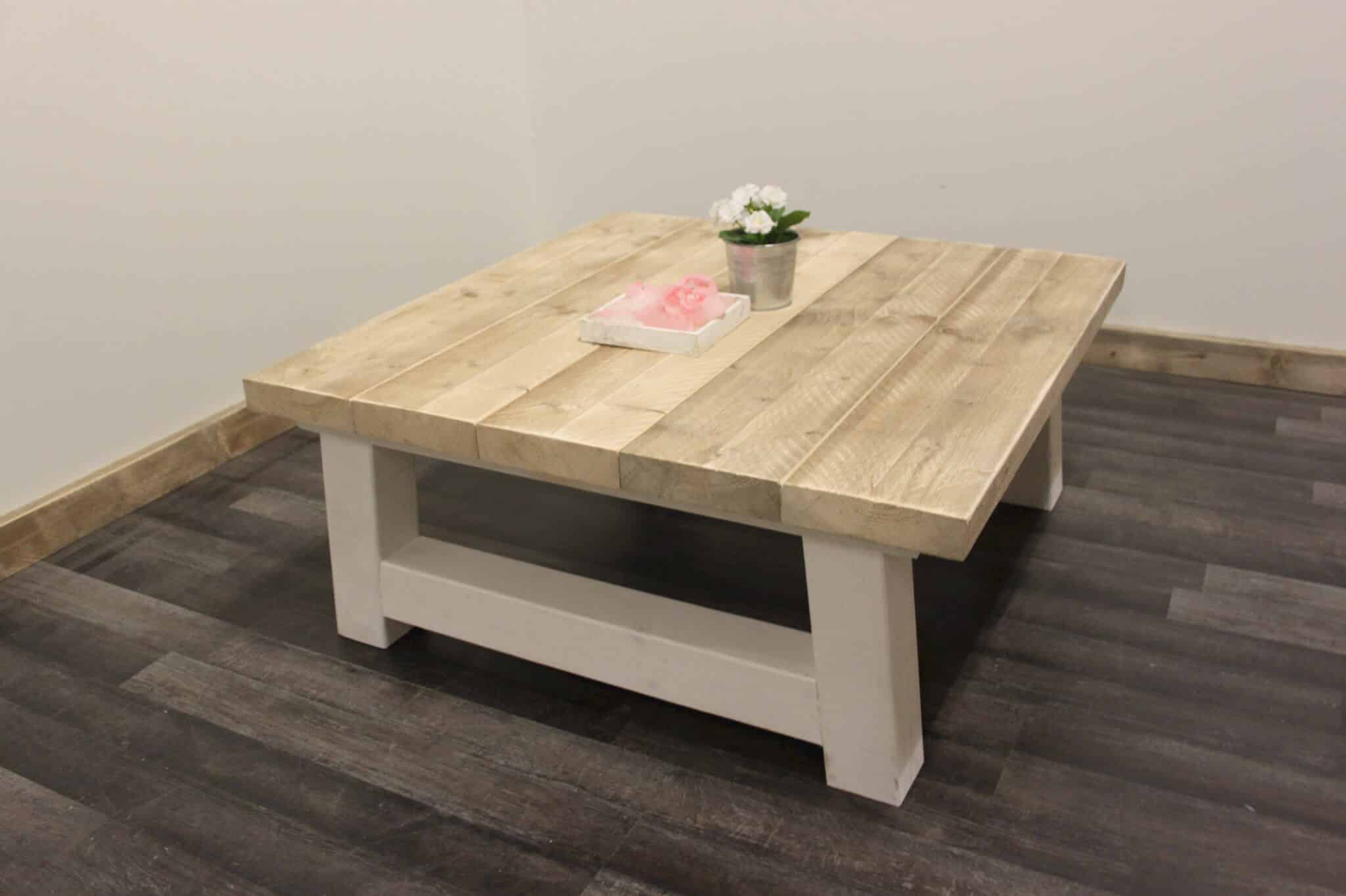 Mooie salontafel in landelijke stijl. Het onderstel is wit gespoten en staat prachtig in combinatie met gebruikt steigerhout. De salontafel is voorzien van een extra dik blad (5 centimeter).
