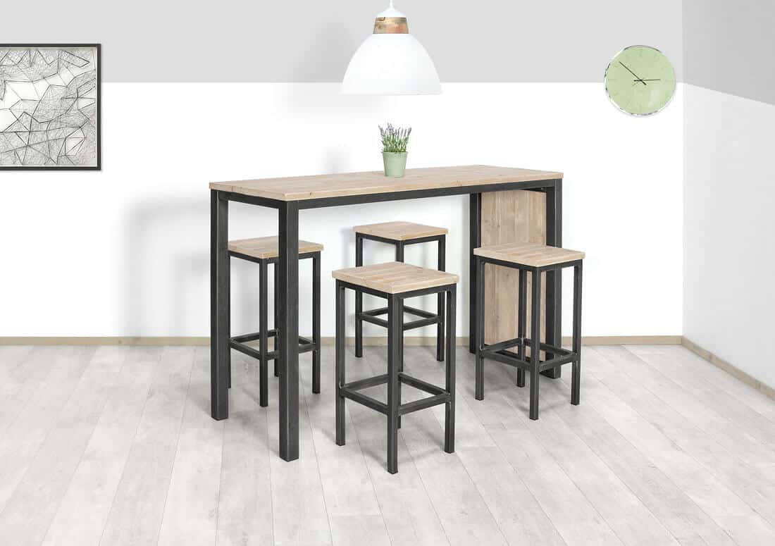 Wil je echt iets bijzonders in je keuken of eetkamer, dan is de steigerhouten bartafel Salix echt iets voor jou! De combinatie van gebruikt steigerhout en industrieel staal geeft een mooie, stoere uitstraling. Je kunt met de bijpassende barkrukken lekker aan de bartafel zitten, eten of een drankje doen. De bartafel is standaard in veel afmetingen te bestellen, maar ook bij de steigerhouten bartafel is Salix is het voor ons geen enkel probleem om de afmeting of uitvoering voor jou aan te passen.