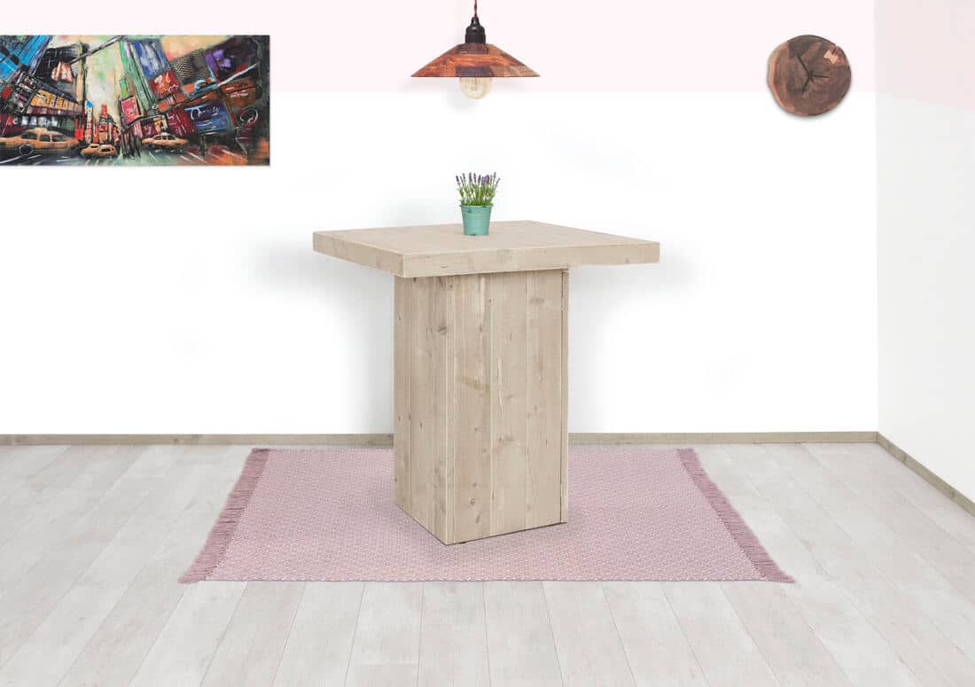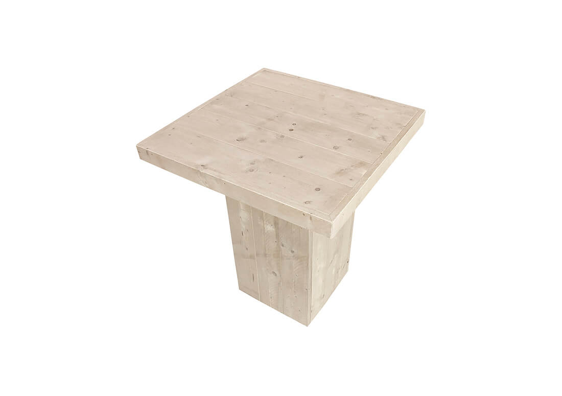 Steigerhouten statafel met kolompoot in het midden en vierkant blad. De tafel is stevig en stabiel en gemaakt van gebruikt steigerhout. Dit geeft de tafel een robuuste uitstraling.