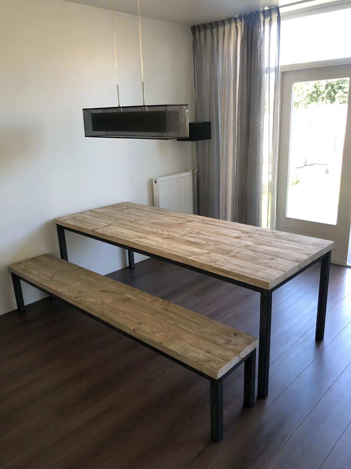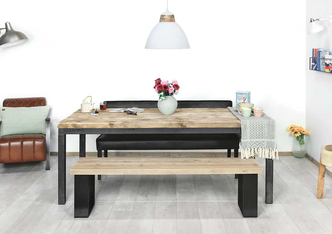 Industriële meubelen worden handgemaakt met steigerhout en staal. Voor de behandeling van het steigerhout kun je hier meer lezen. Door de ambacht kunnen poten altijd iets van elkaar afwijken en kunnen de poten lasspetters bevatten, dit hoort bij het product.