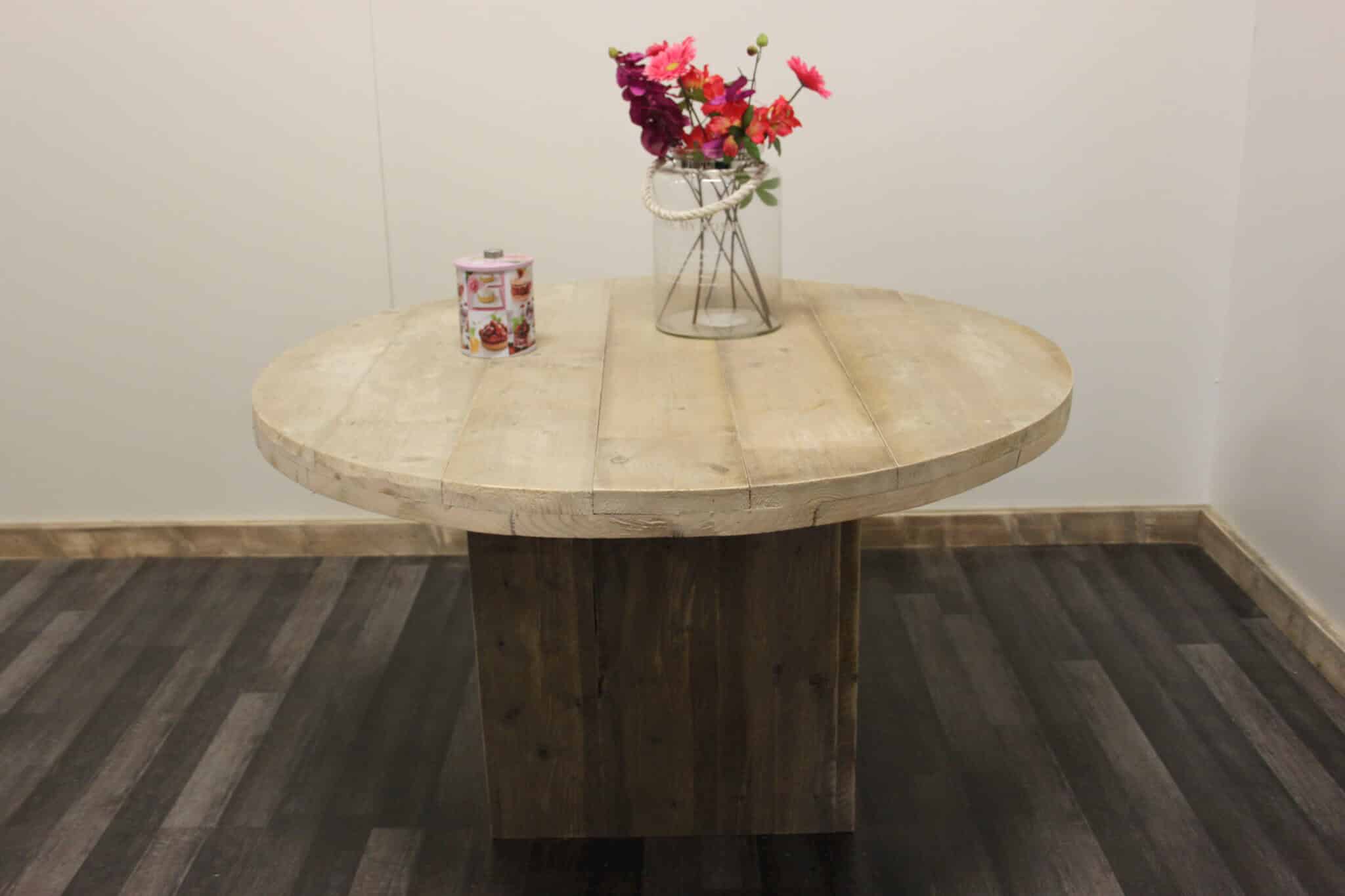 Ronde eettafel met kolompoot in het midden. Er is genoeg plek voor iedereen rondom de tafel. Door zijn dikke rand rondom is het een echte stamtafel.