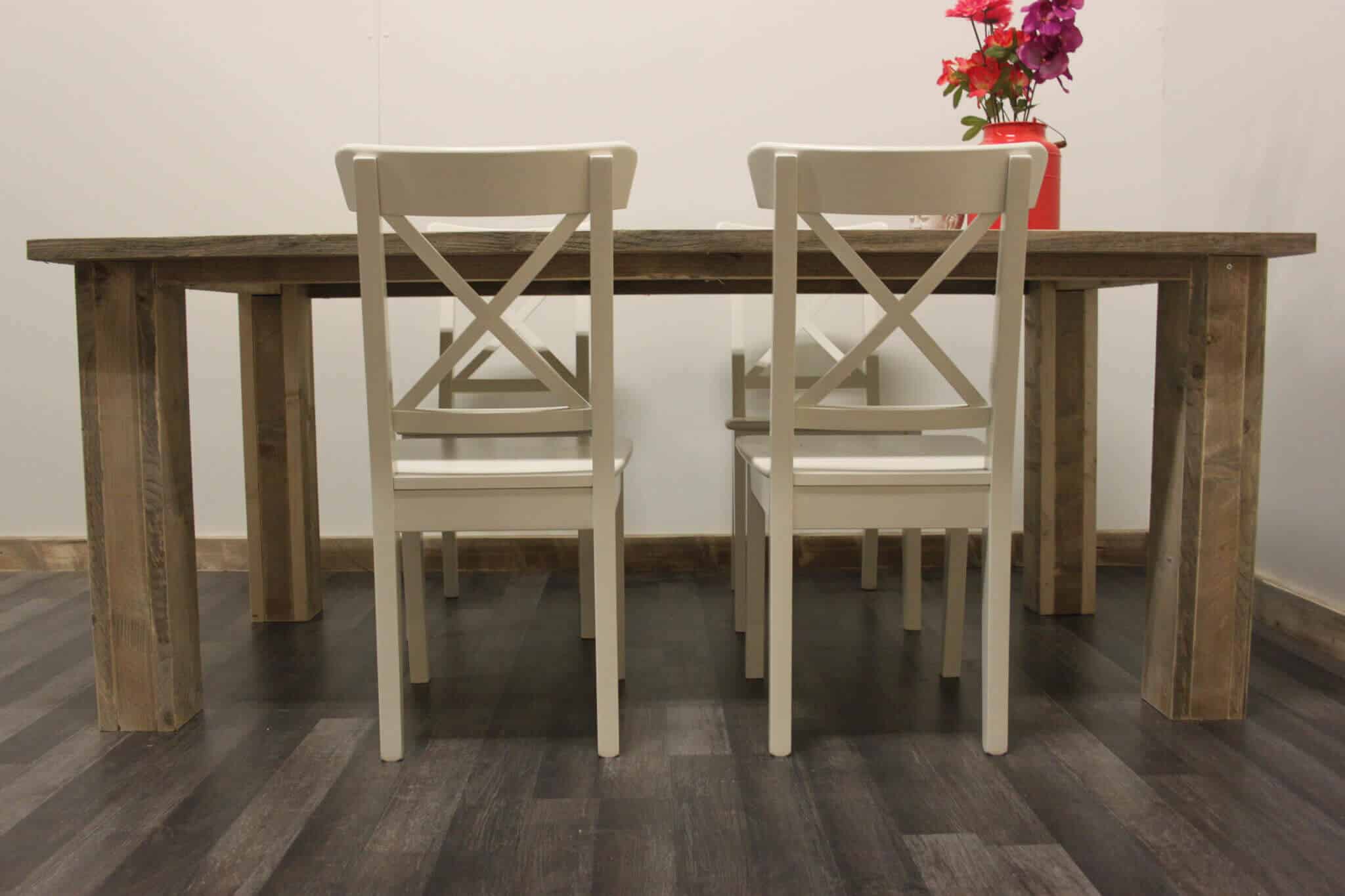 Steigerhouten tafel met een overstekend blad en smalle poten. De “Denver” op deze foto is gemaakt van oud steigerhout. Deze tafel wordt in losse delen geleverd.