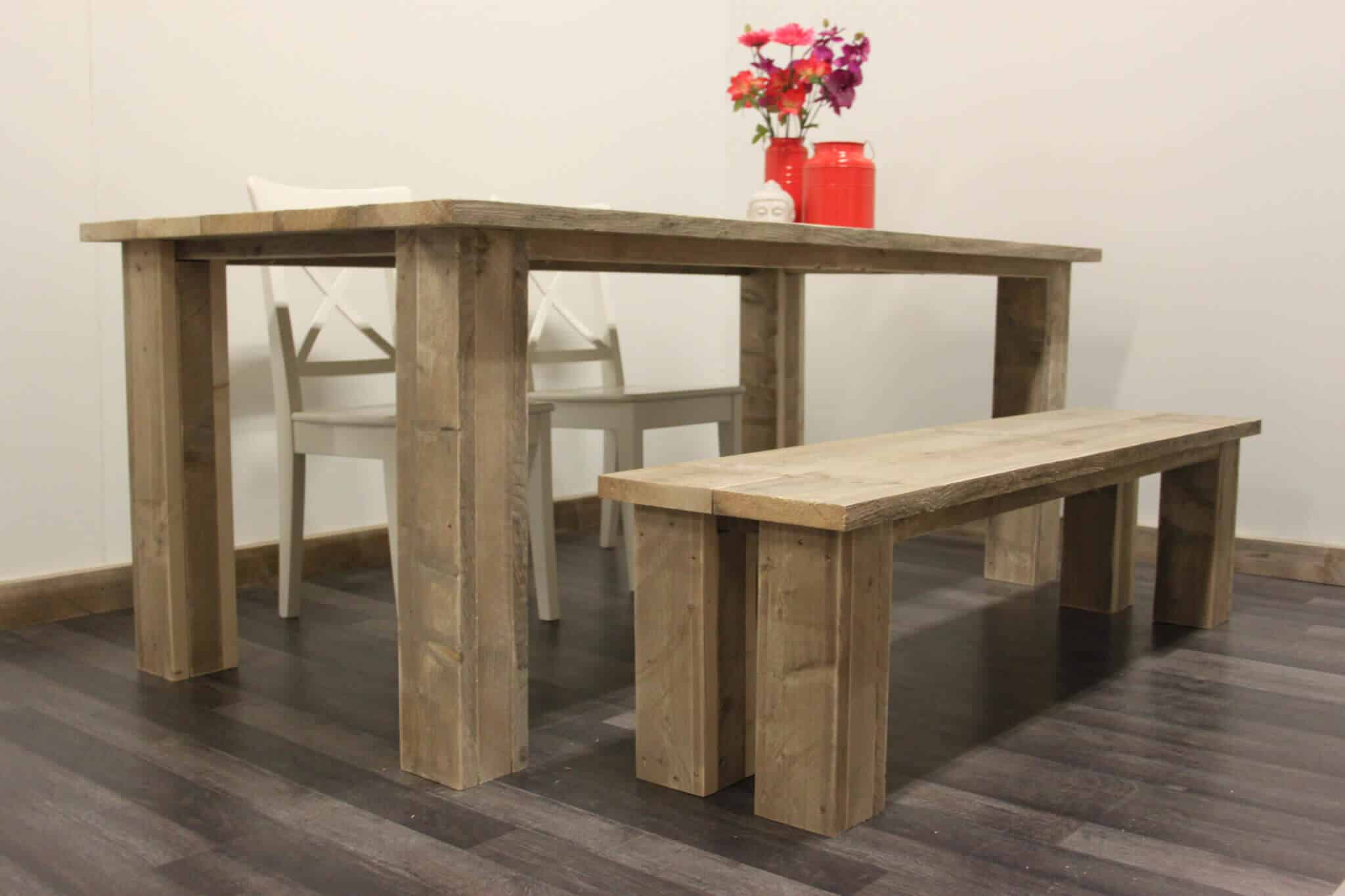 Mooie steigerhouten tafel met overstekend blad en smalle poten. Dit geeft een sierlijk en chic uiterlijk aan de eettafel. Om de eethoek compleet te maken kun je ervoor kiezen om een bijpassend bankje erbij te bestellen. Het bankje is makkelijk onder de eettafel te schuiven, waardoor je extra ruimte creëert. De eettafel op de foto is gemaakt van oud/ gebruikt steigerhout.