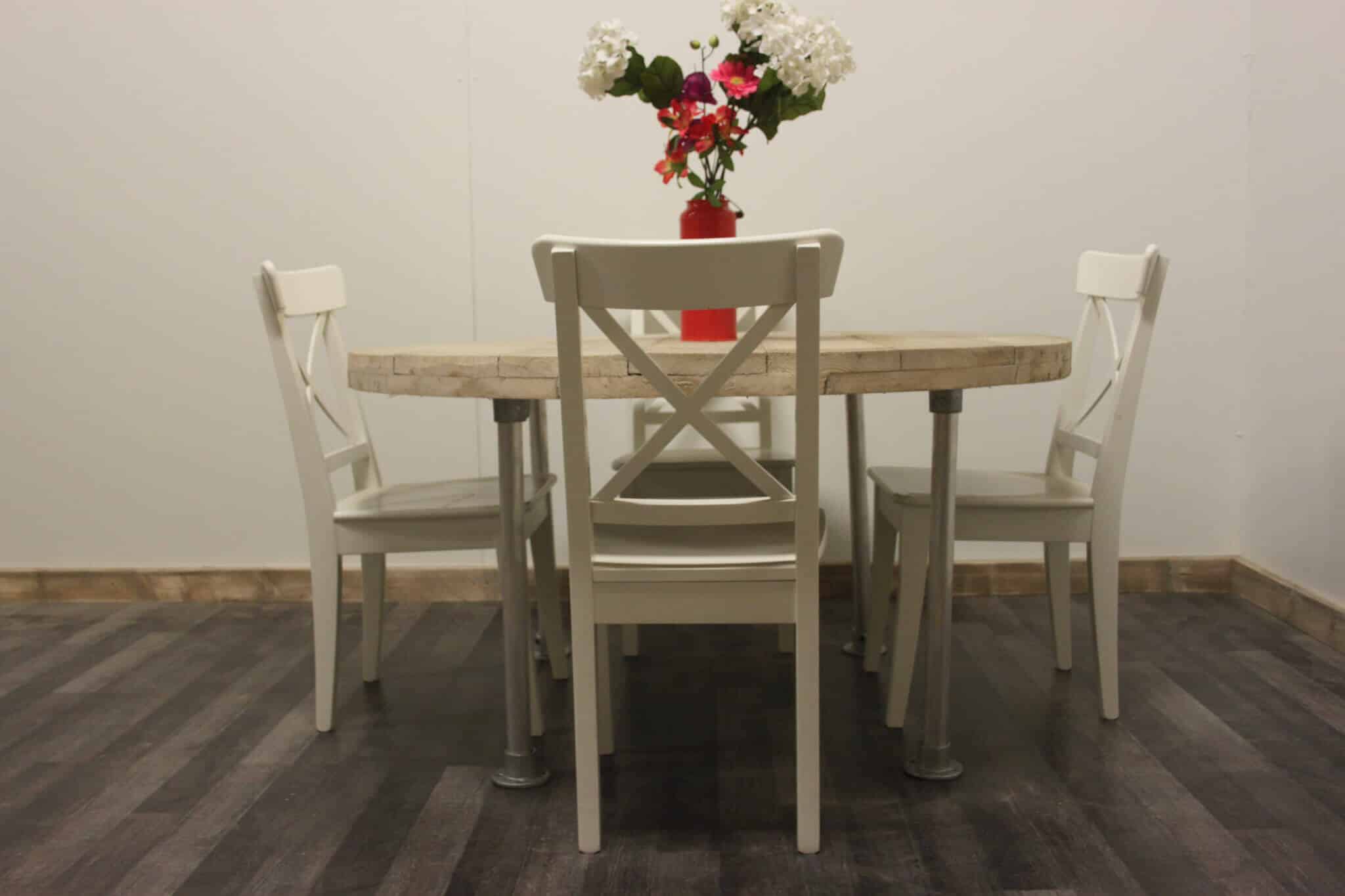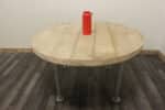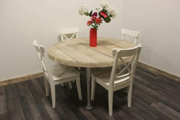 Ronde steigerhouten eettafel met steigerbuizen. De set is compleet te maken met onze eetkamer stoelen Mike en Jaap. De combinatie steigerbuis en gebruikte “ oude “ steigerdelen is geweldig.