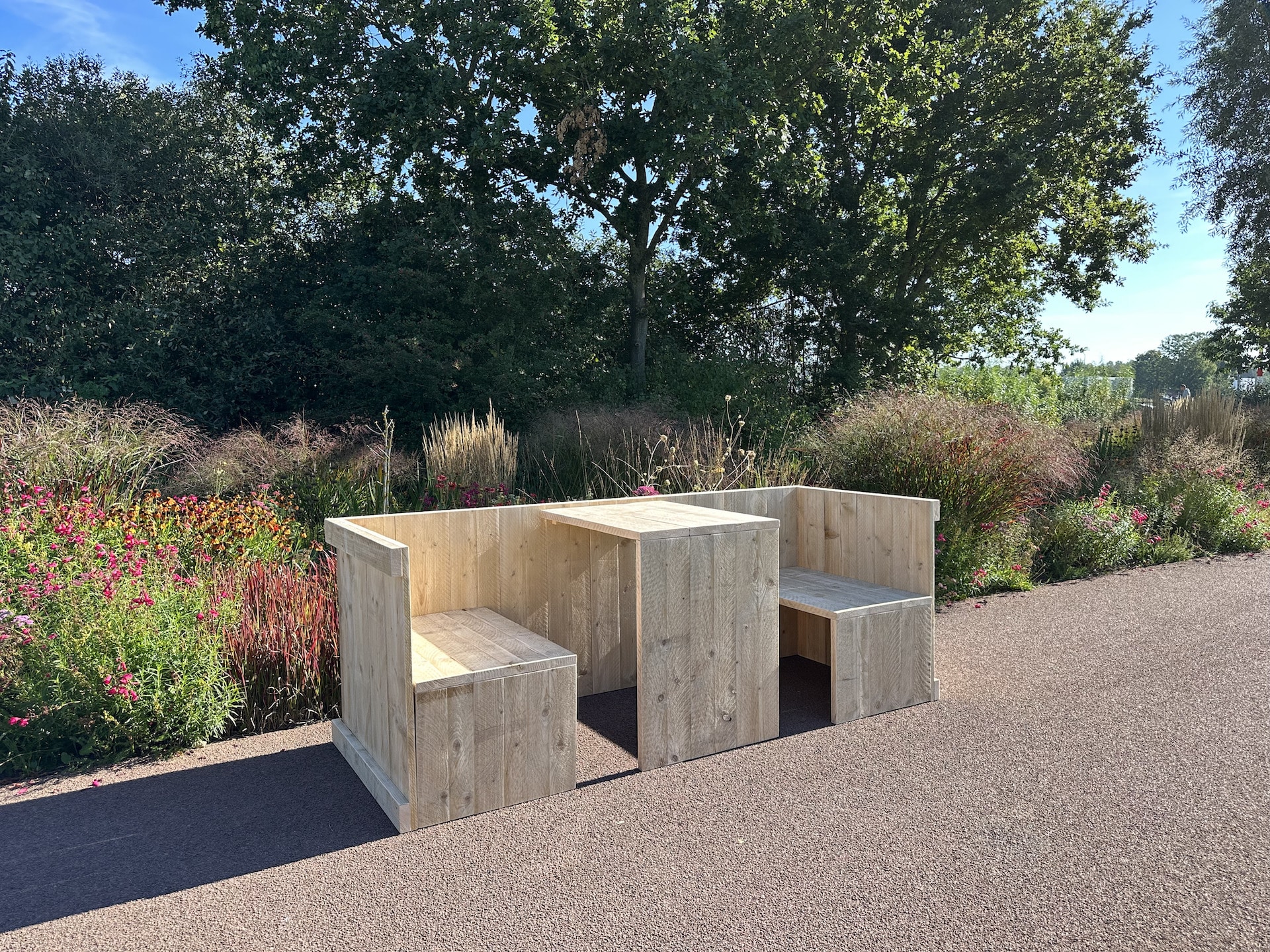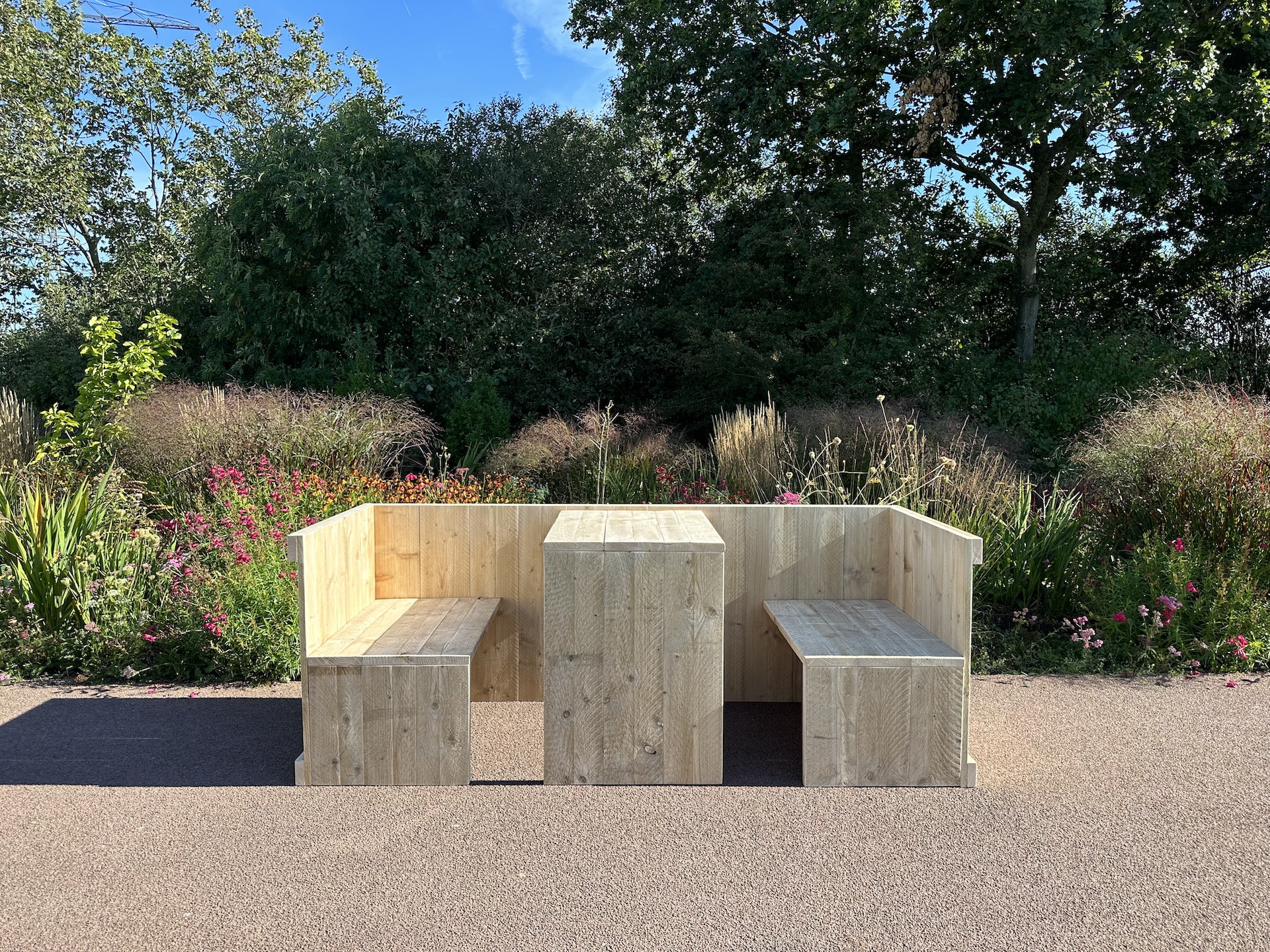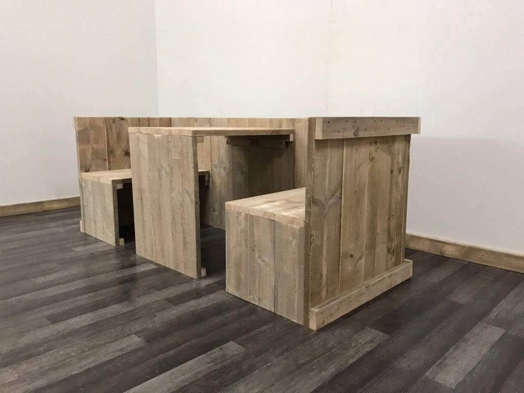Steigerhouten (balkon)tafel/bank Boomer is gemaakt van gebruikte steigerplanken. Een combinatie van een tafel en twee bankjes samen in je eigen “box “.