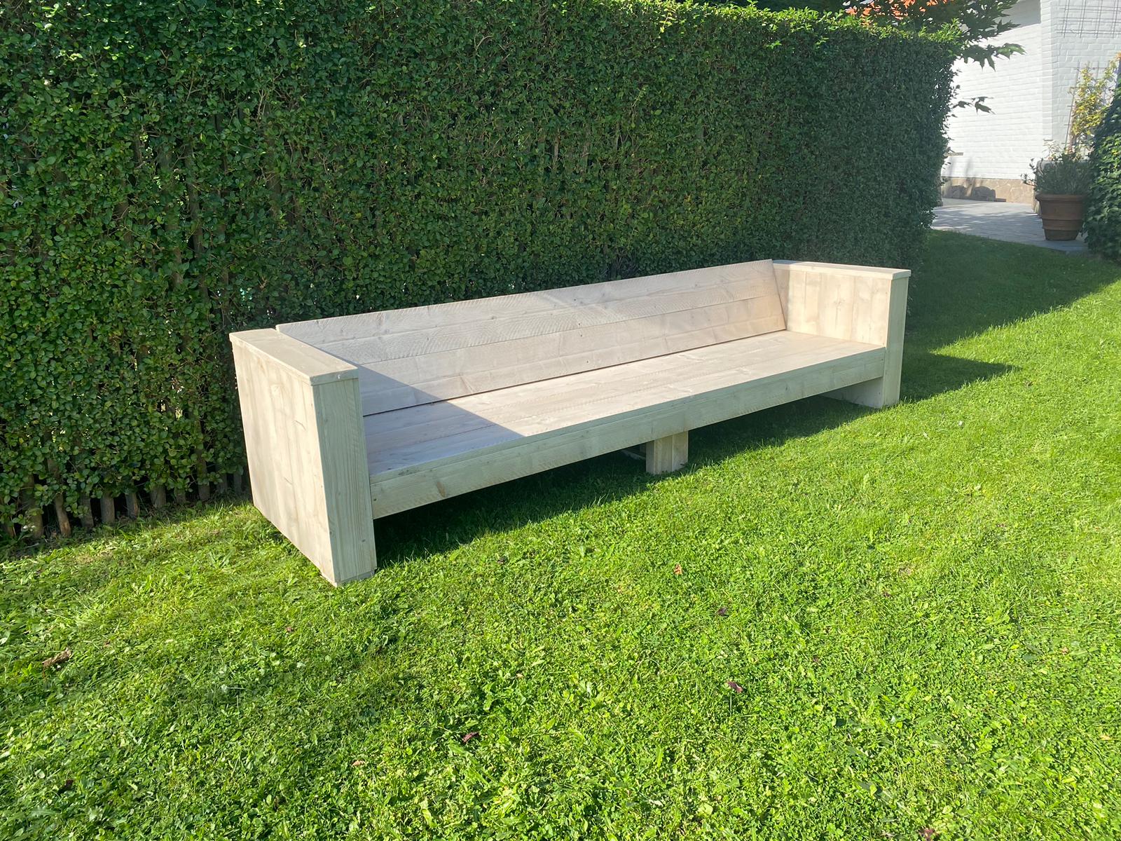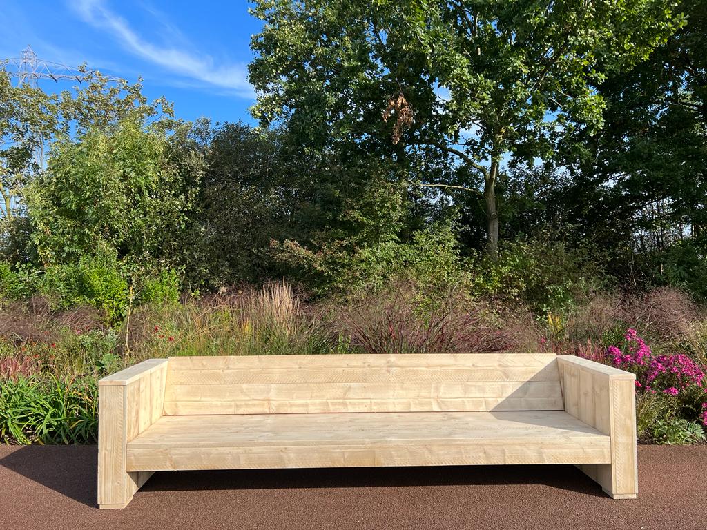De tuinbank op bovenstaande foto heeft dikke armleuningen van 15 cm breed. Echter, de tuinbank is helemaal naar eigen wens te bestellen, dus andere afmetingen kunnen ook. Vul je voorkeuren in via het menu rechts.