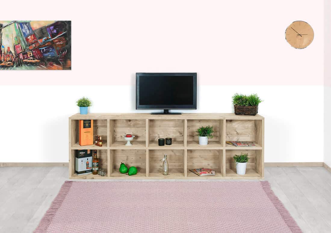 Onze allernieuwste steigerhouten TV meubel Madison is een aangename uitbreiding van ons steigerhouten assortiment. Dit prachtige meubelstuk is te gebruiken op twee verschillende manieren. Je kunt dit meubelstuk gebruiken om woonkamer en keuken te scheiden, maar staat ook leuk als TV meubel. Door de vakken is er veel opbergruimte.